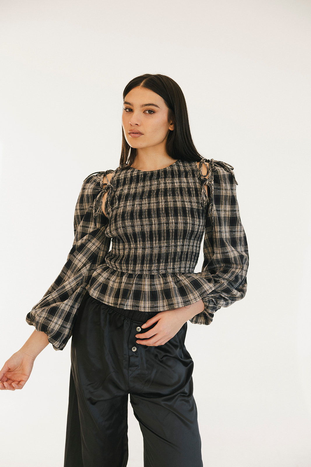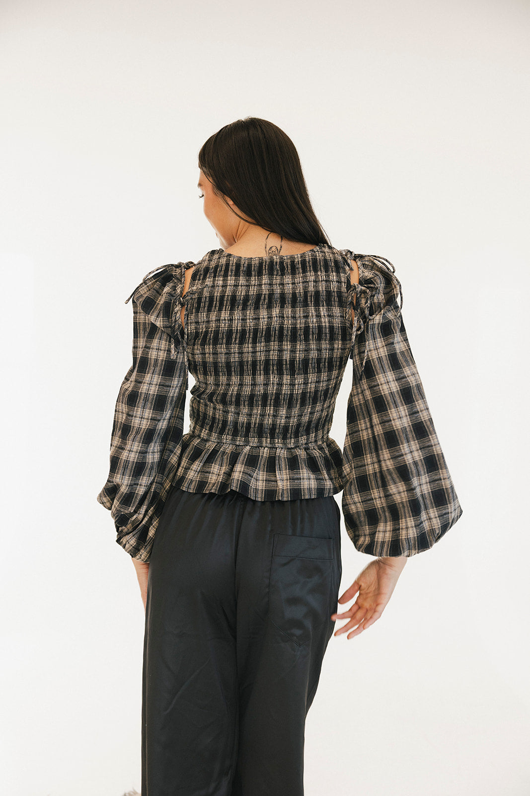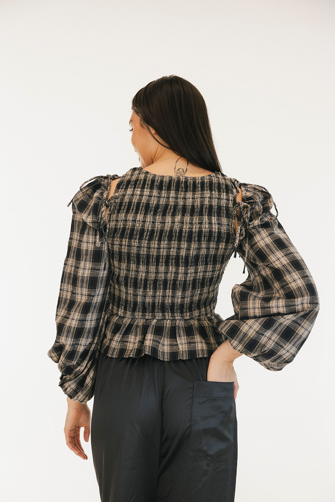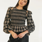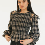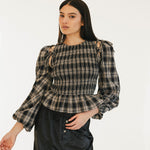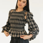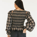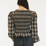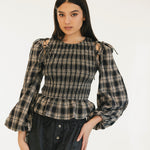 Embrace effortless elegance with this charming plaid flannel peasant top. The rounded neckline and smocked bodice create a flattering silhouette, while voluminous balloon sleeves with elastic cuffs offer comfortable movement. A standout feature—detachable sleeves with tie closures—lets you transition from long sleeves to sleeveless in seconds. The playful ruffle peplum hem adds dimension and movement, making this versatile piece perfect for layering or wearing solo. Whether you're dressing up or keeping it casual, this top celebrates your individual style.