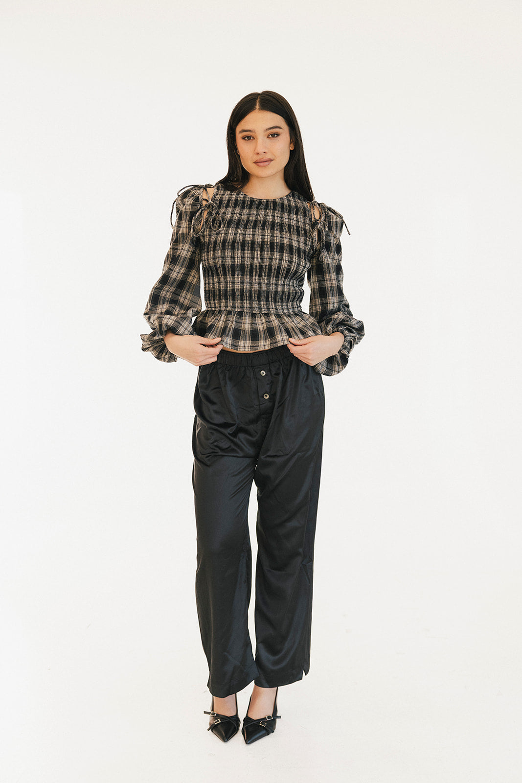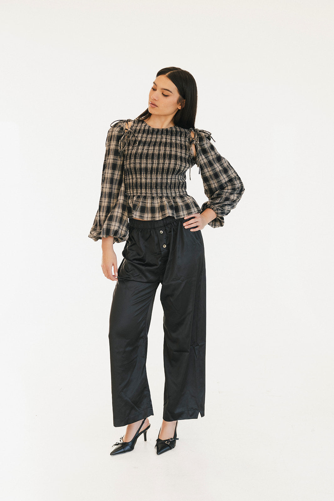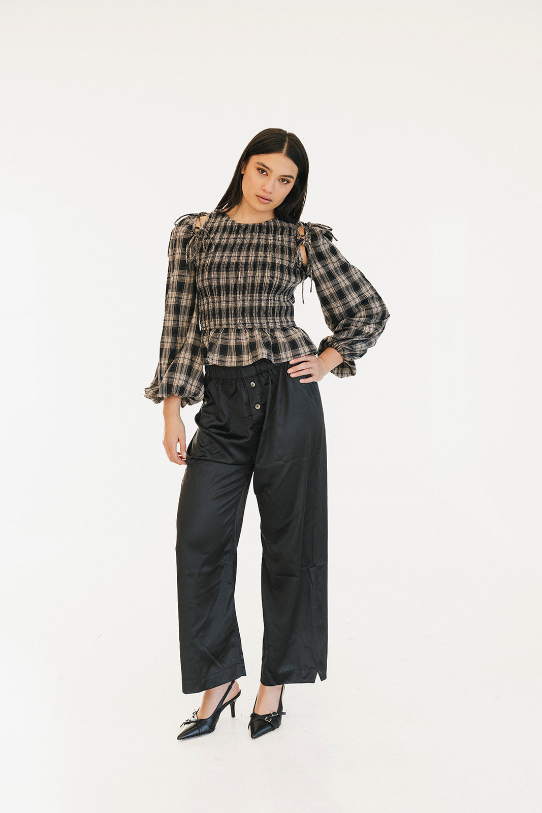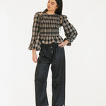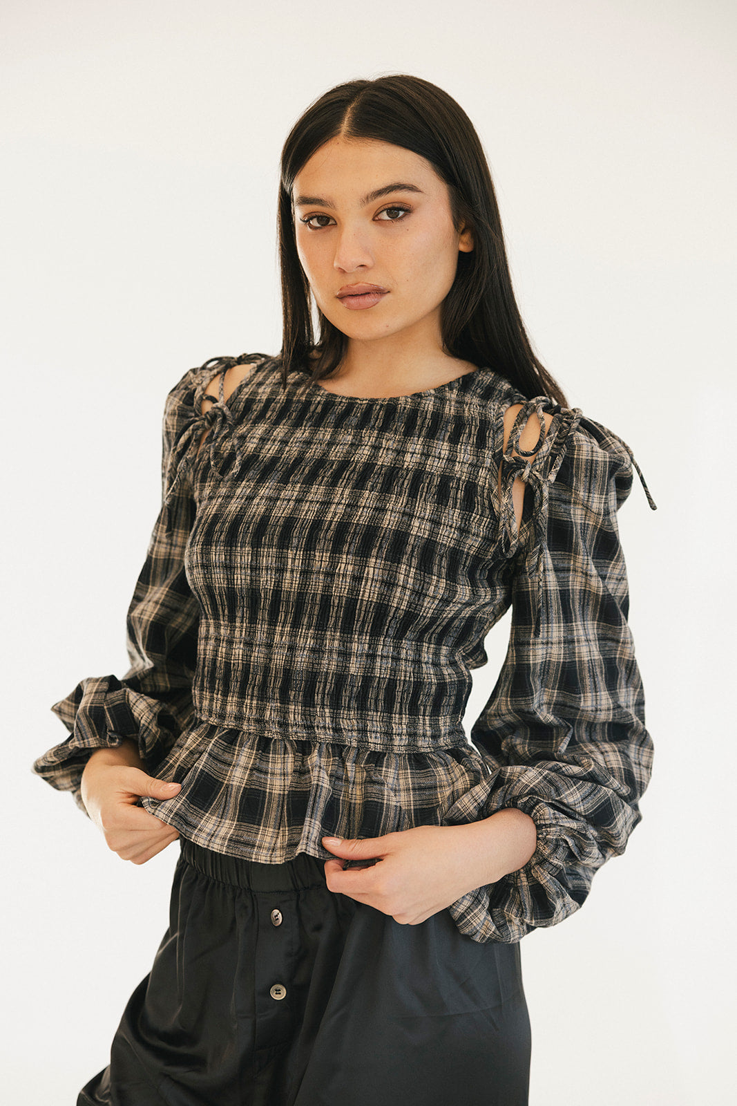 Embrace effortless elegance with this charming plaid flannel peasant top. The rounded neckline and smocked bodice create a flattering silhouette, while voluminous balloon sleeves with elastic cuffs offer comfortable movement. A standout feature—detachable sleeves with tie closures—lets you transition from long sleeves to sleeveless in seconds. The playful ruffle peplum hem adds dimension and movement, making this versatile piece perfect for layering or wearing solo. Whether you're dressing up or keeping it casual, this top celebrates your individual style.
