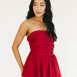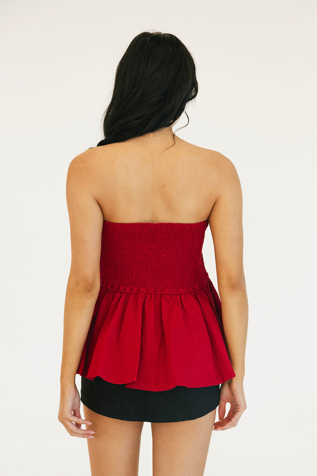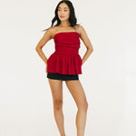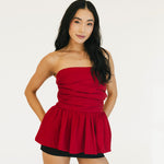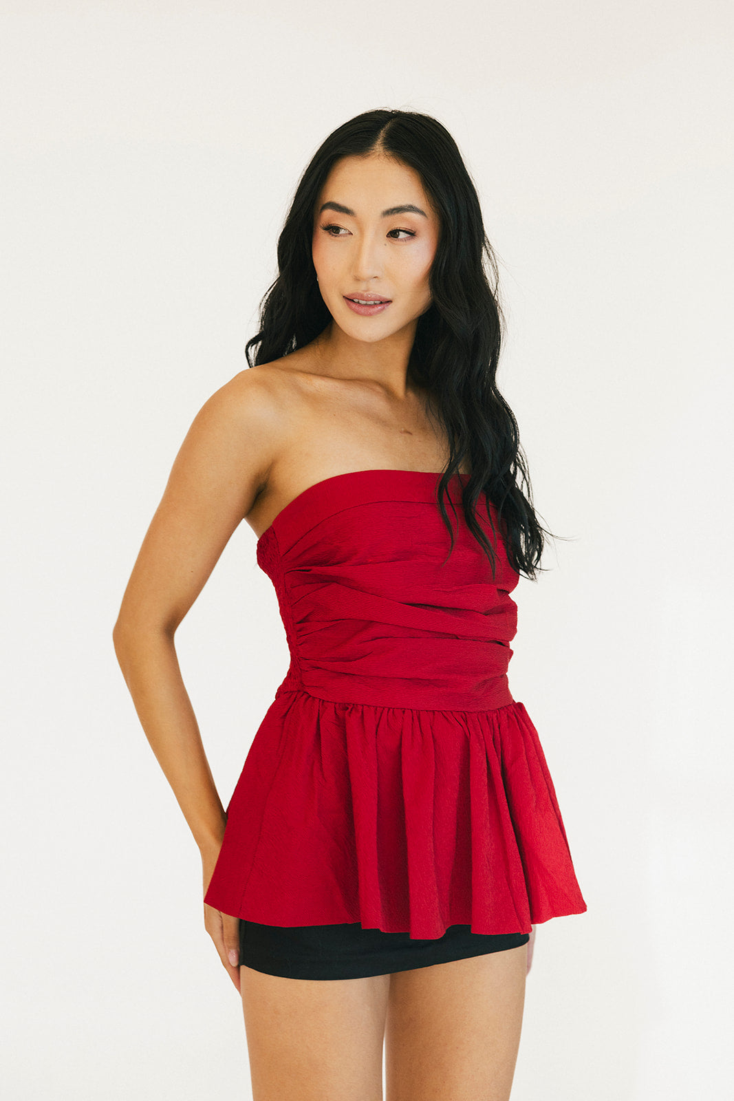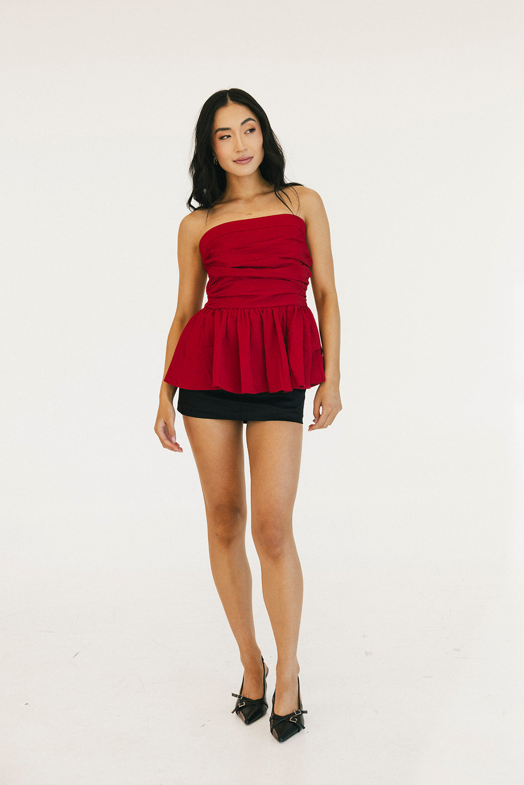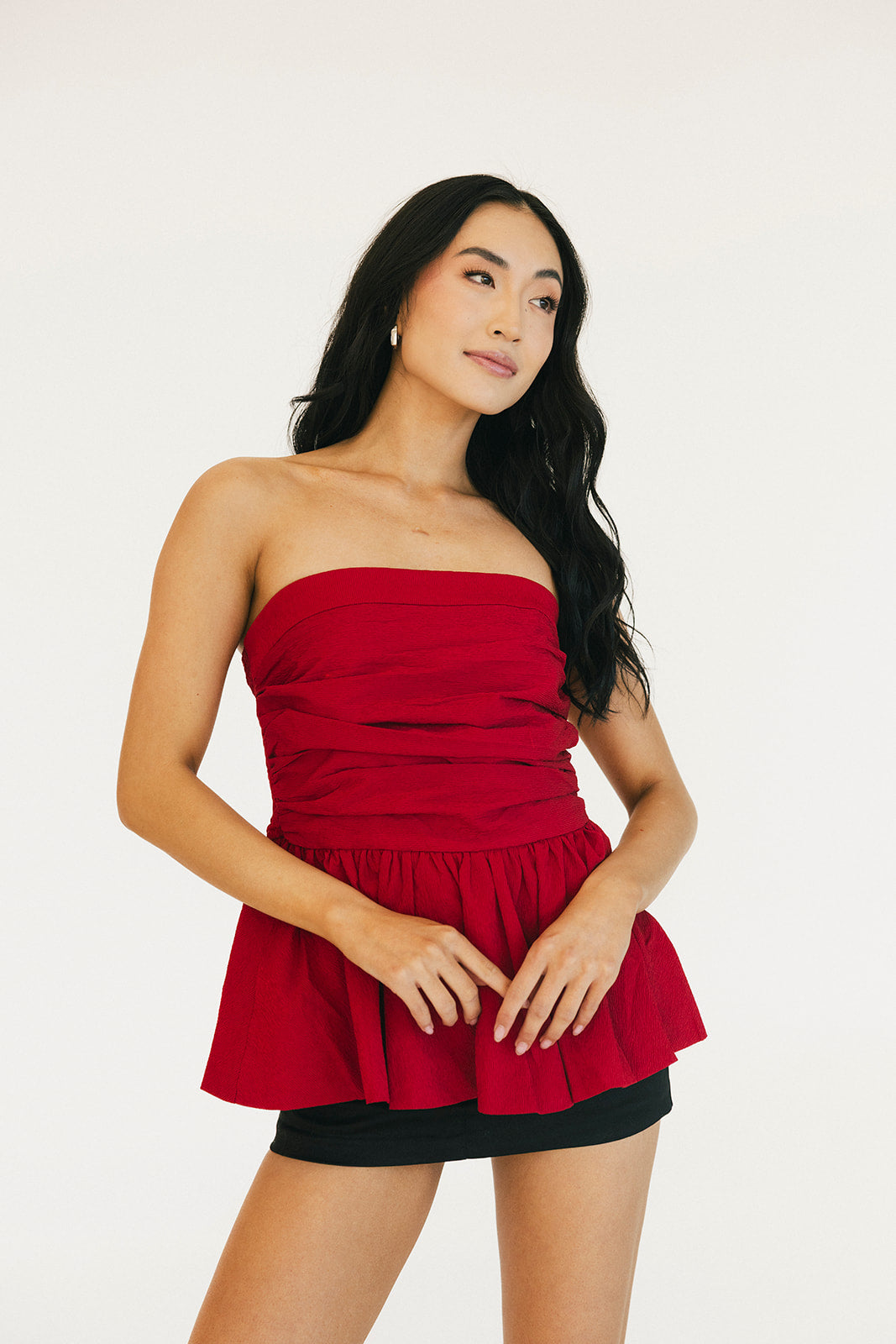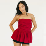 The Val Strapless Peplum Top in Red is a stunning piece designed to make you feel confident and beautiful. This elegant top features a ruched bodice that creates flattering dimension and movement, while the strapless neckline offers a sophisticated, versatile look perfect for any occasion. The playful peplum hem adds a touch of modern flair and helps create a balanced silhouette. Whether you're dressing up for a special event or elevating your everyday style, this top celebrates your unique beauty and gives you the support to shine.