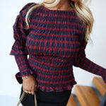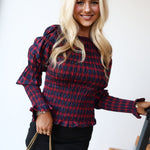 Crafted from 100% cotton, this fitted long-sleeve top showcases a timeless heritage check design with shirring across the body and sleeves. Its soft ruffle hem and subtle puffed shoulders create flattering shape and texture, complemented by a square neckline for a fresh, modern look. Perfect for effortless everyday outfits or polished evening wear.