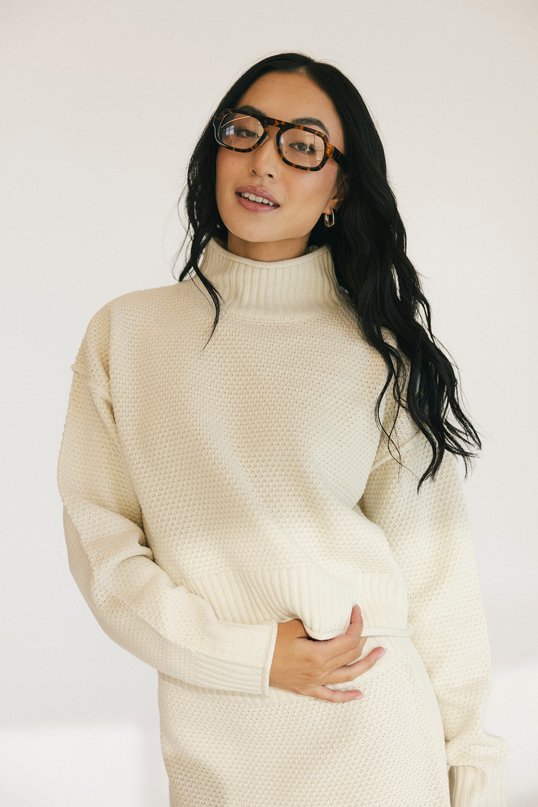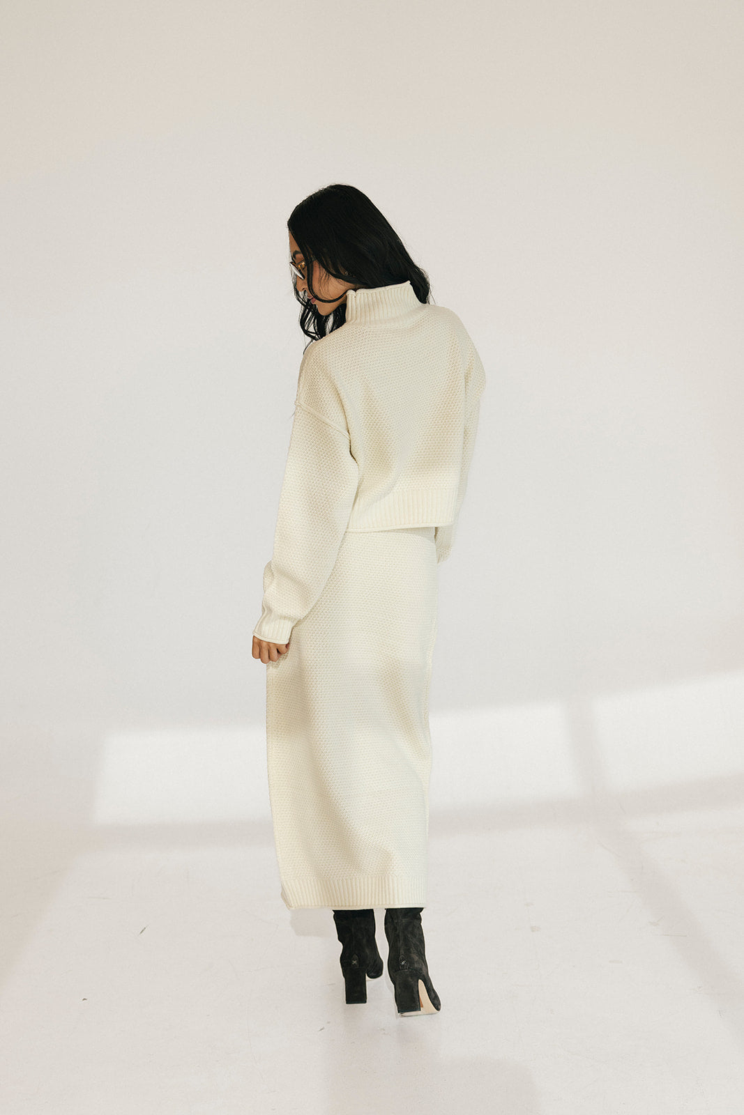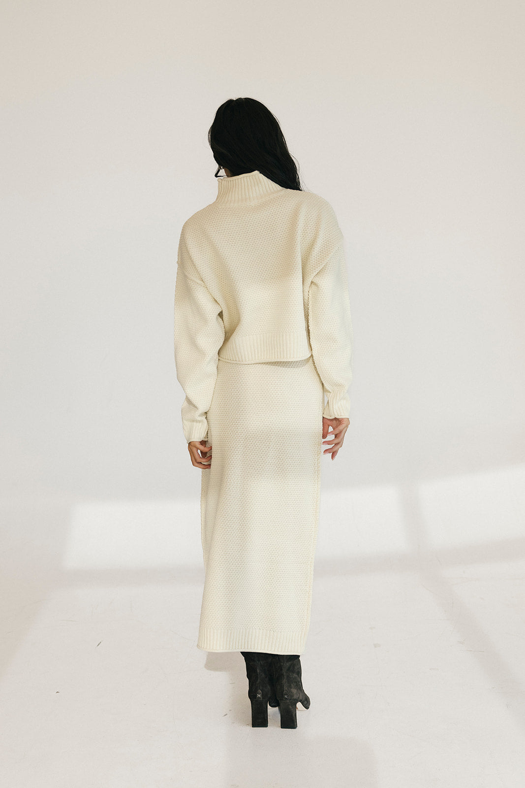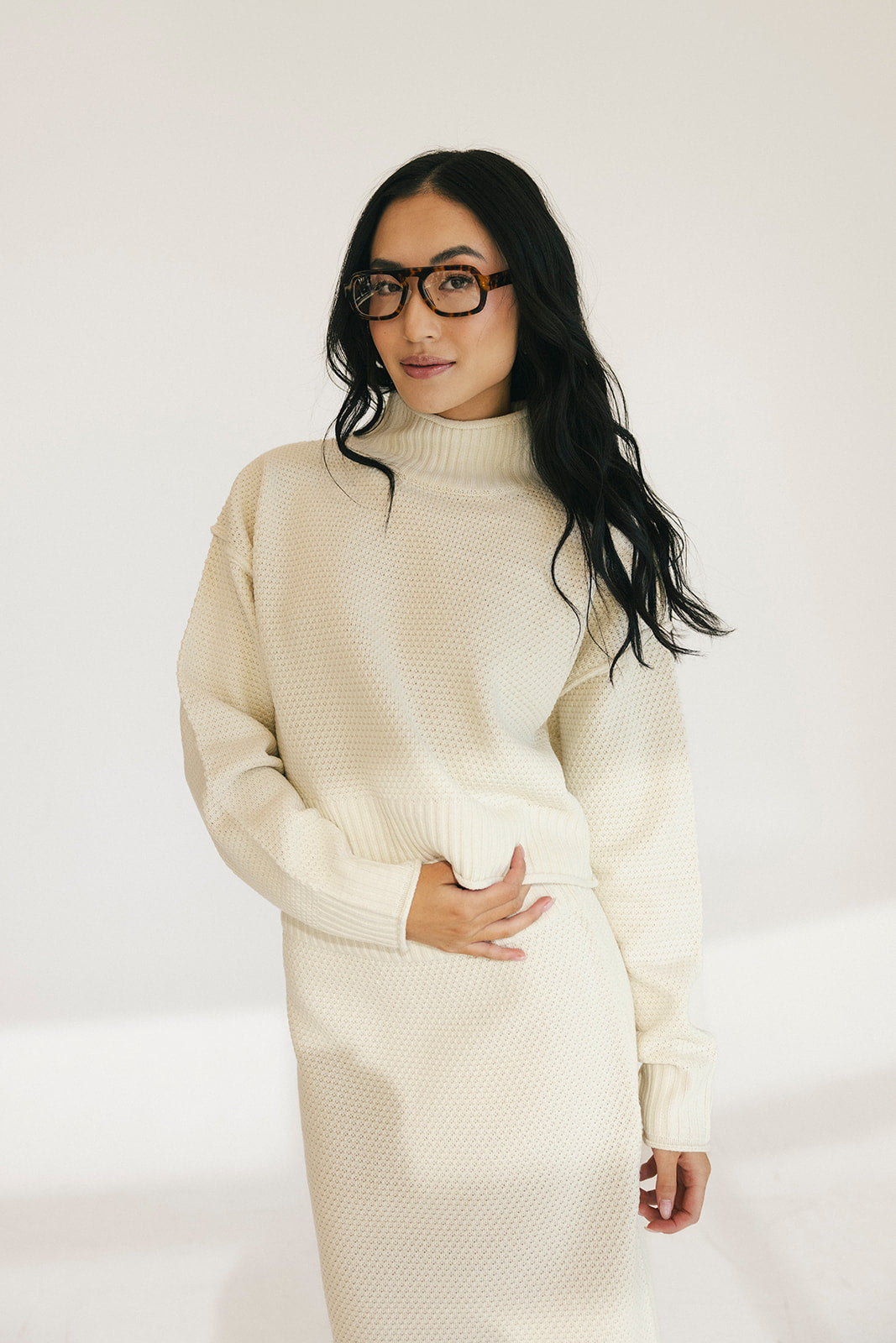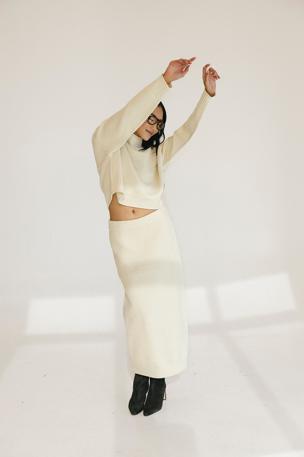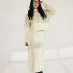 Elevate your everyday style with the Lainey High Neck Sweater Skirt Set in a versatile cream tone. This coordinated two-piece features a textured knit sweater with a flattering high neckline paired with a complementary skirt, creating an effortless, polished look. The soft, quality fabrics work together to give you a put-together outfit that transitions seamlessly from work to weekend. Perfect for layering or wearing as a complete set, this piece celebrates your confidence and personal style.