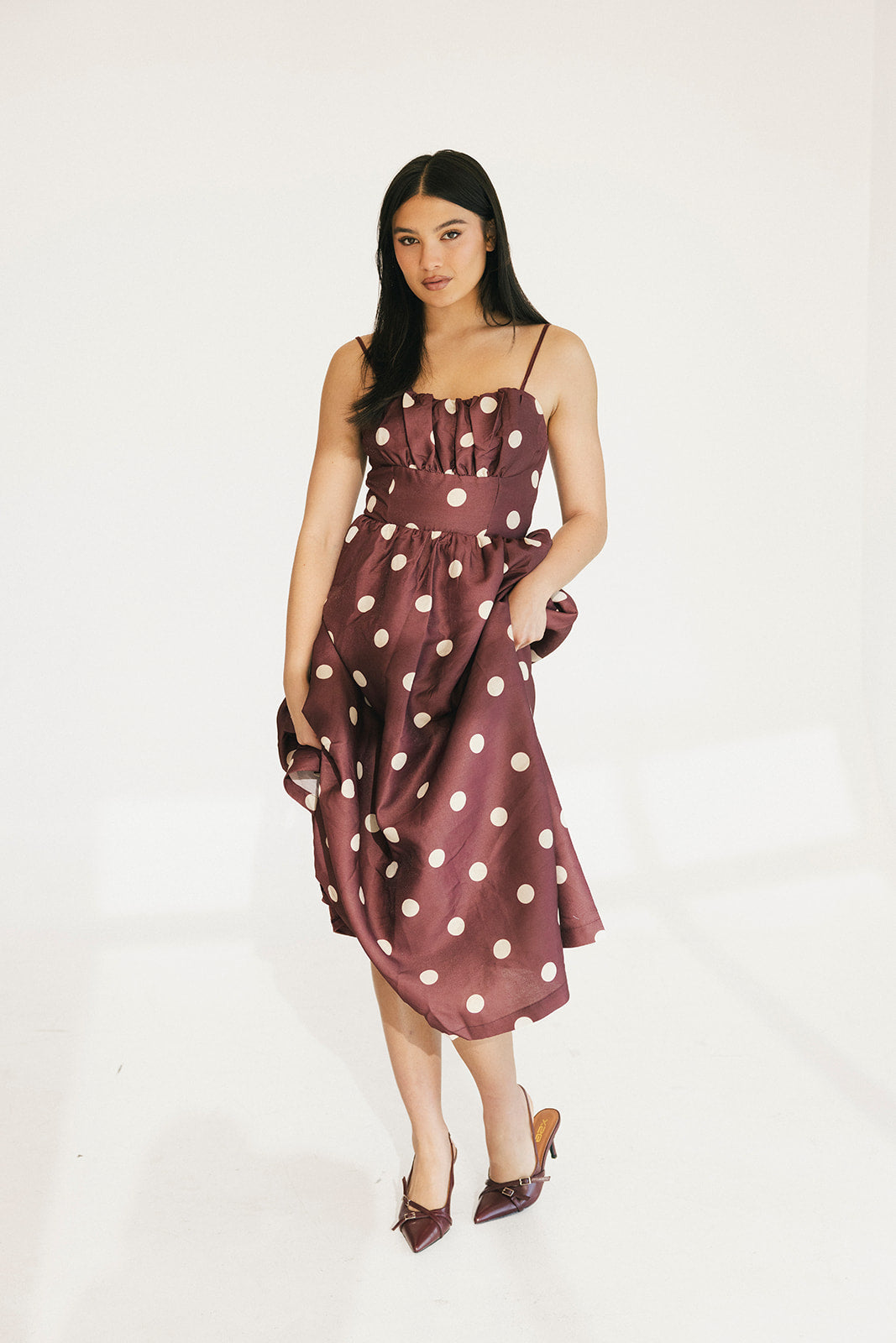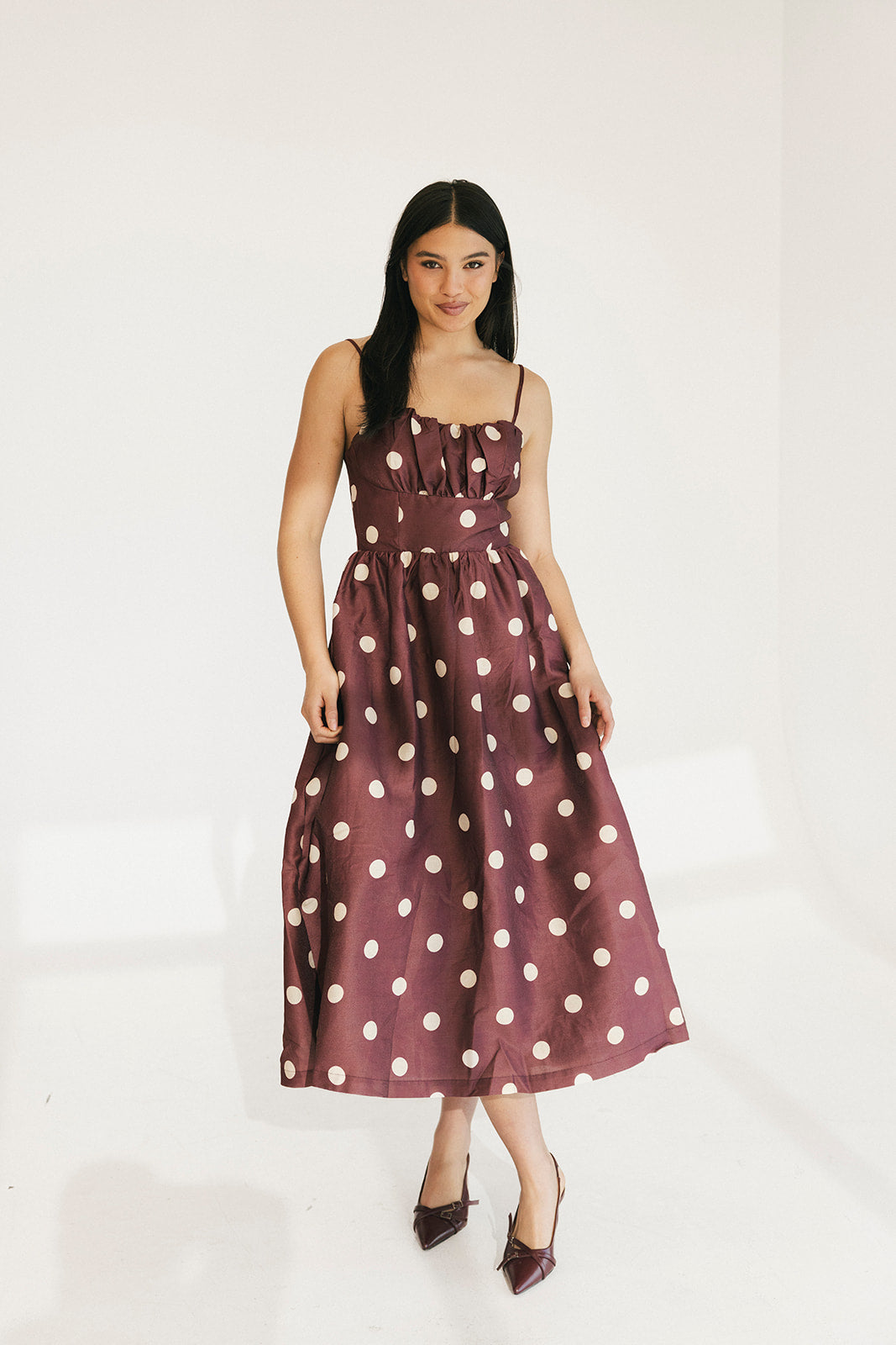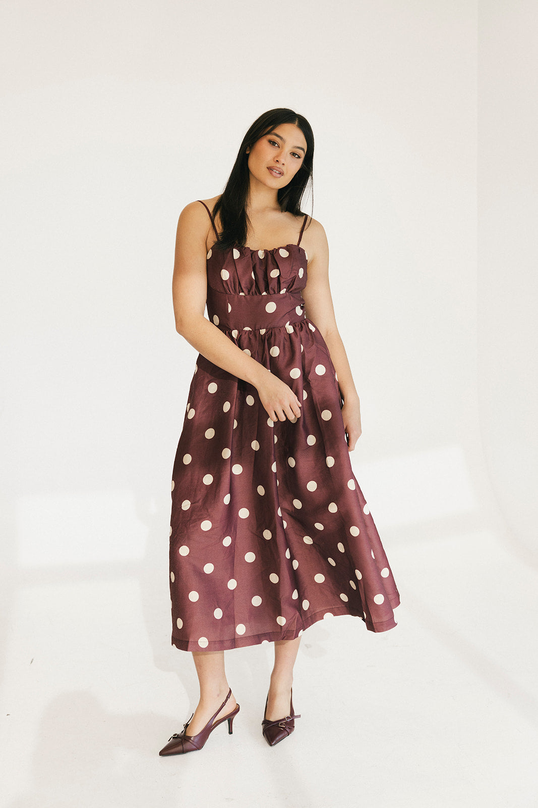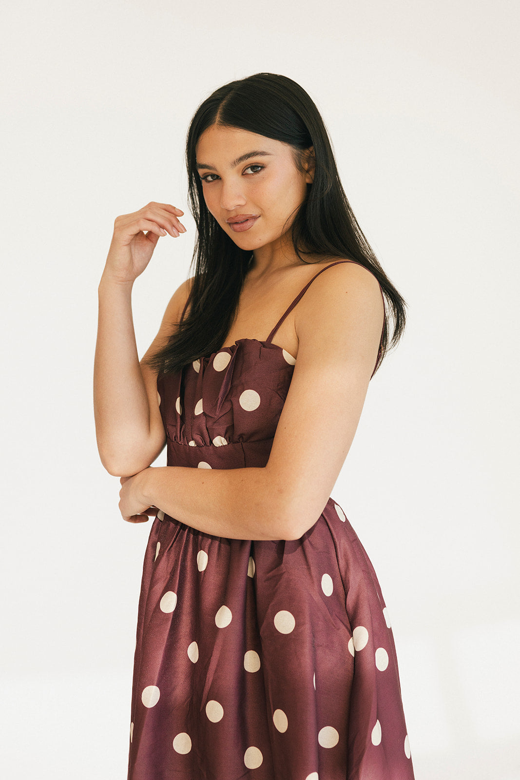 Elevate your wardrobe with the Marah Polka Dot Midi Dress in rich burgundy. This charming piece features a flattering straight neckline and delicate straps that frame the shoulders beautifully. The shirred bodice creates a comfortable, sculpted fit, while the wide waistband defines your silhouette with ease. A flowing full skirt offers graceful movement and timeless elegance. Complete with a secure back zipper closure, this printed woven dress transitions effortlessly from day to evening occasions.