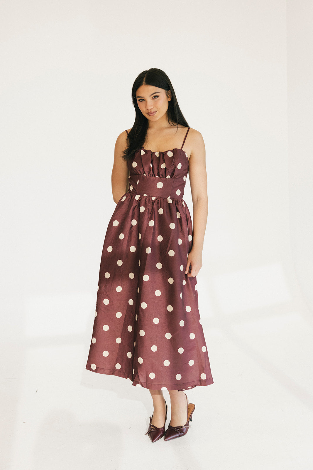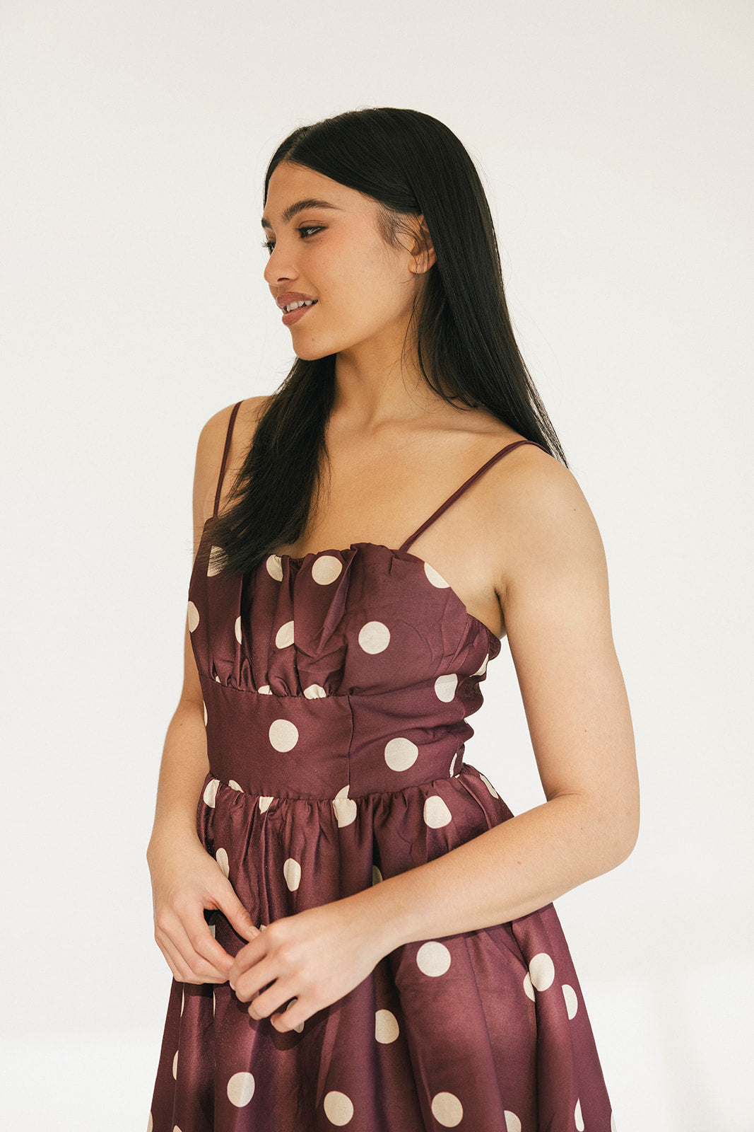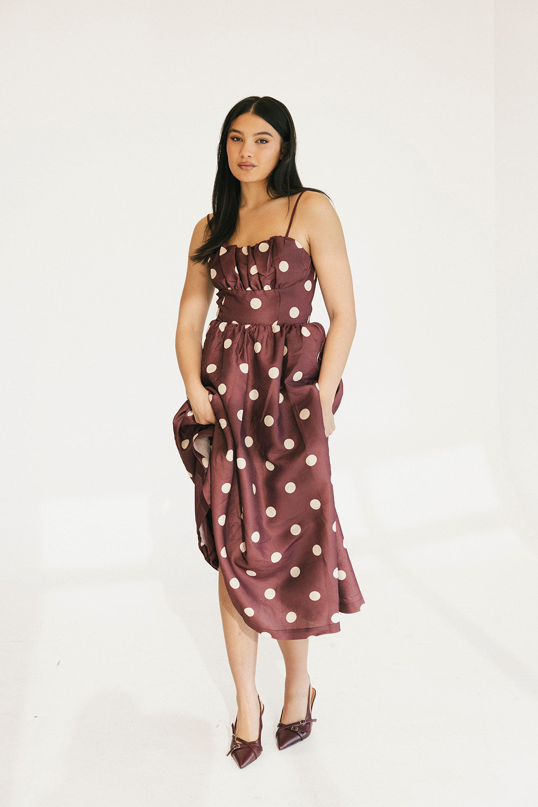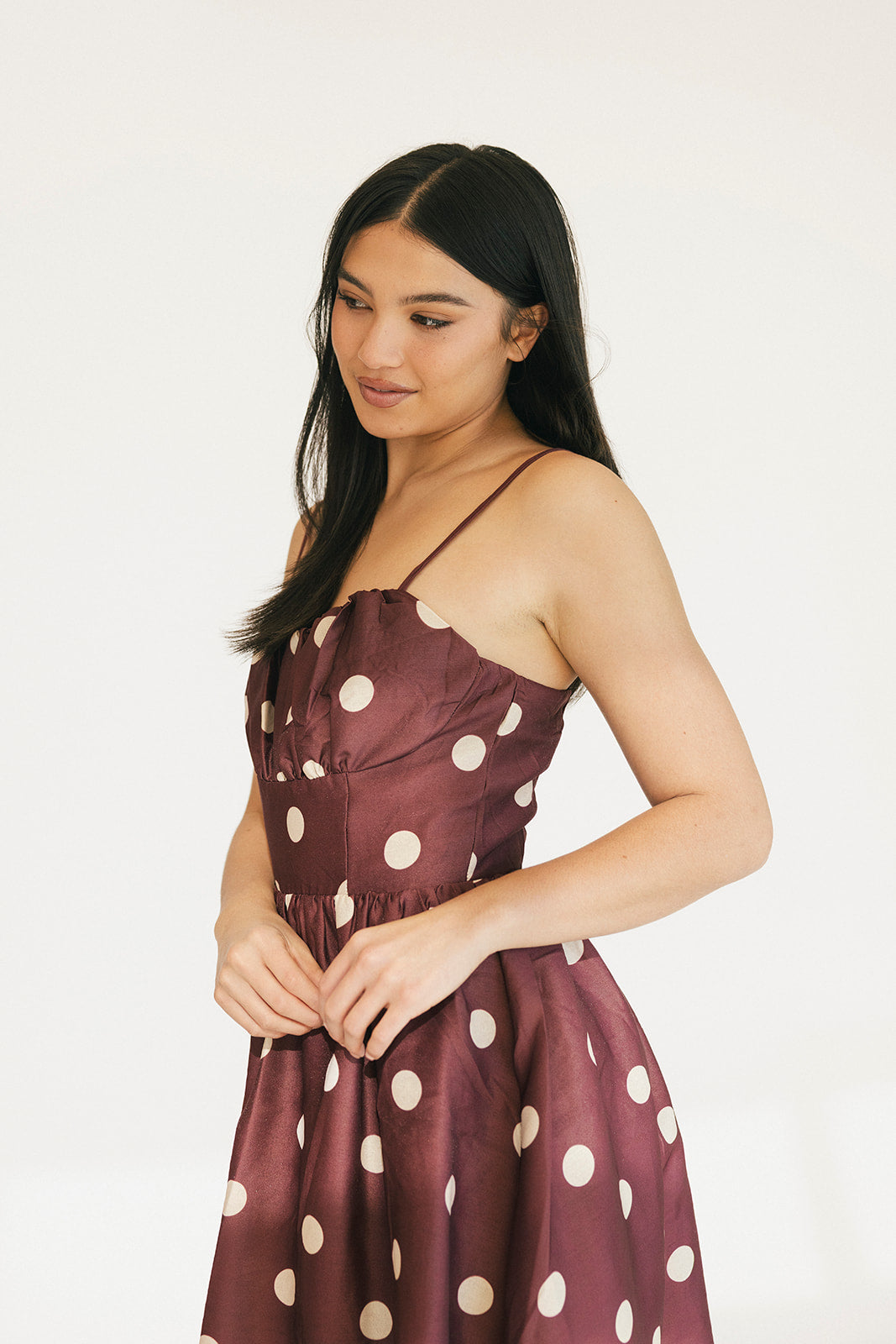 Elevate your wardrobe with the Marah Polka Dot Midi Dress in rich burgundy. This charming piece features a flattering straight neckline and delicate straps that frame the shoulders beautifully. The shirred bodice creates a comfortable, sculpted fit, while the wide waistband defines your silhouette with ease. A flowing full skirt offers graceful movement and timeless elegance. Complete with a secure back zipper closure, this printed woven dress transitions effortlessly from day to evening occasions.