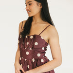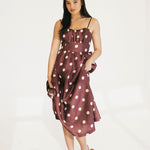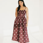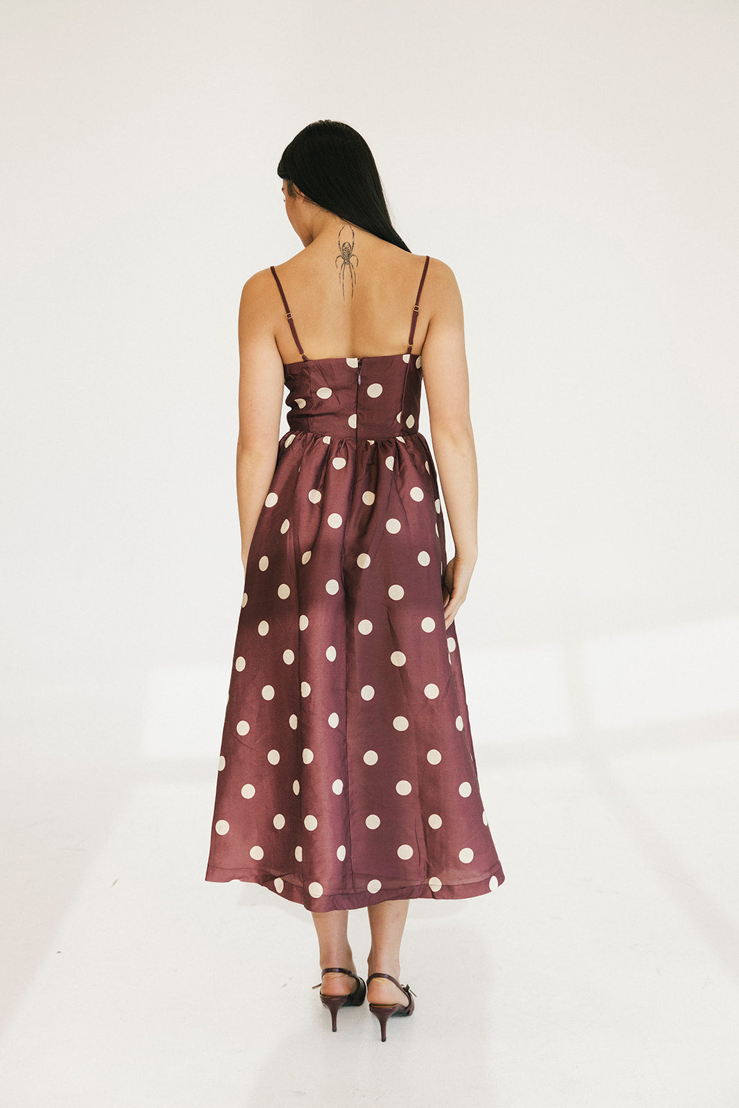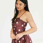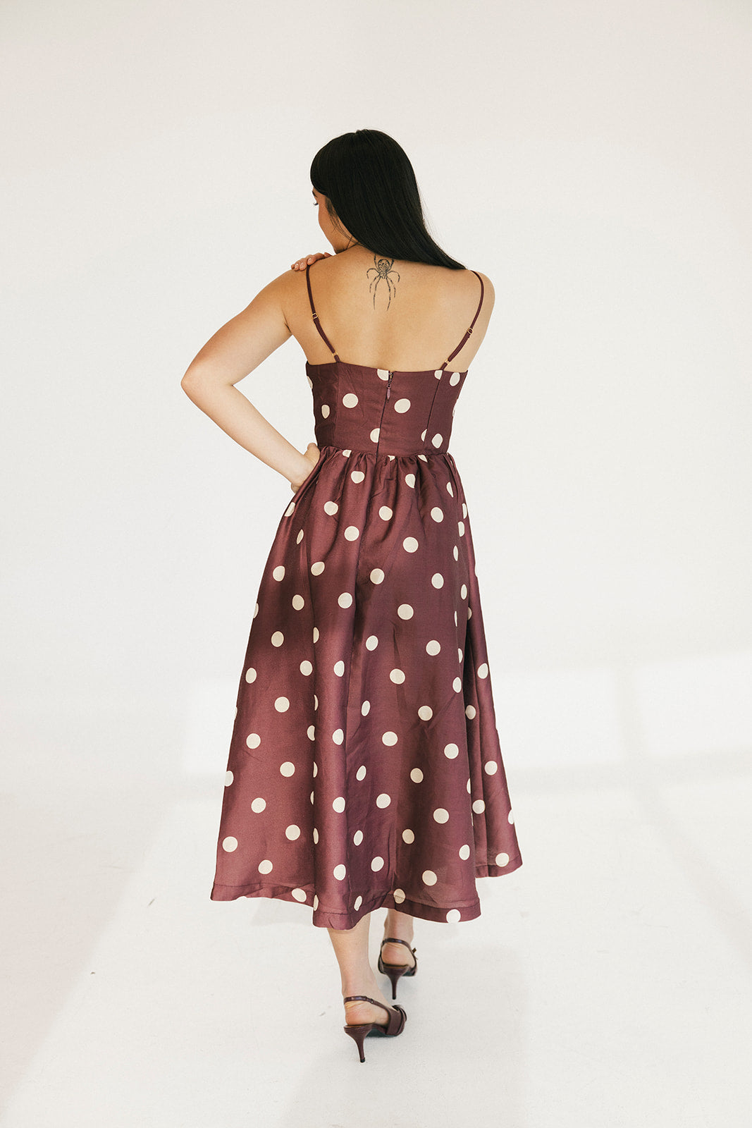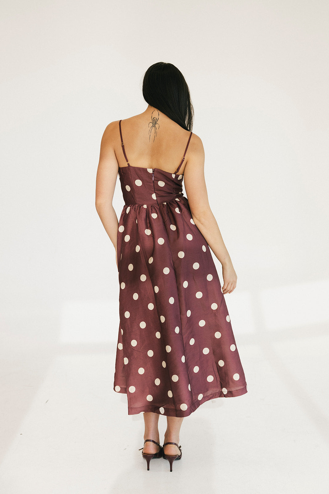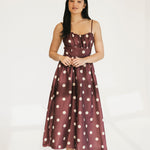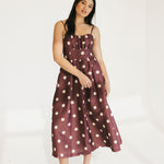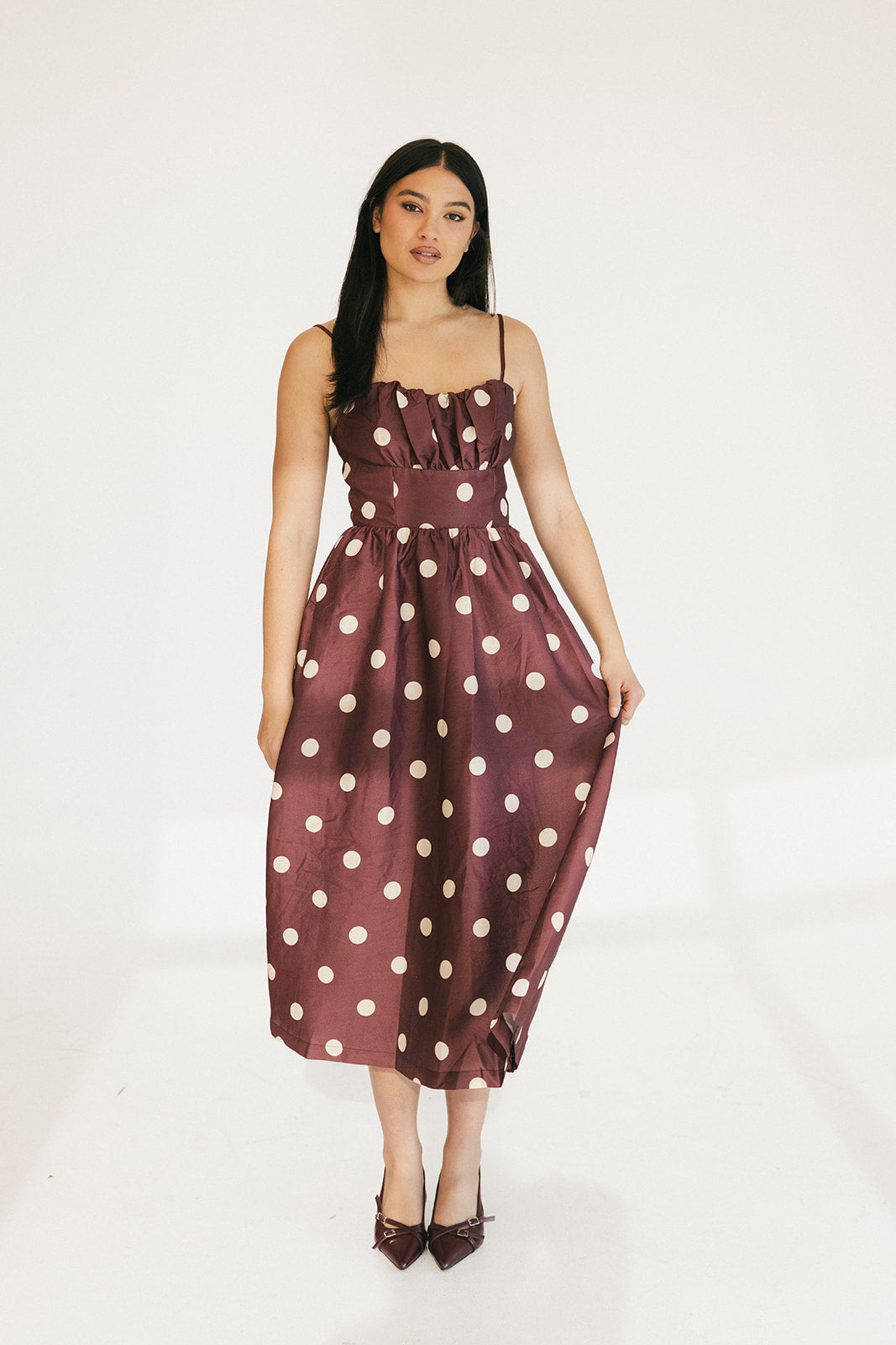 Elevate your wardrobe with the Marah Polka Dot Midi Dress in rich burgundy. This charming piece features a flattering straight neckline and delicate straps that frame the shoulders beautifully. The shirred bodice creates a comfortable, sculpted fit, while the wide waistband defines your silhouette with ease. A flowing full skirt offers graceful movement and timeless elegance. Complete with a secure back zipper closure, this printed woven dress transitions effortlessly from day to evening occasions.