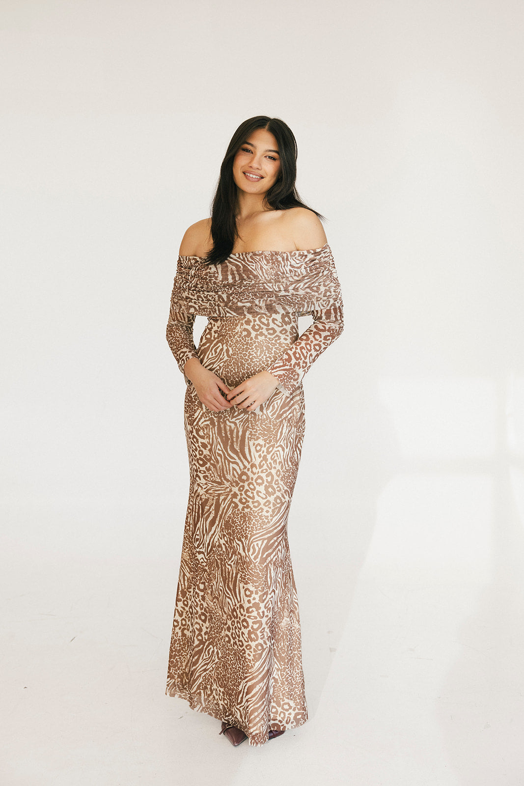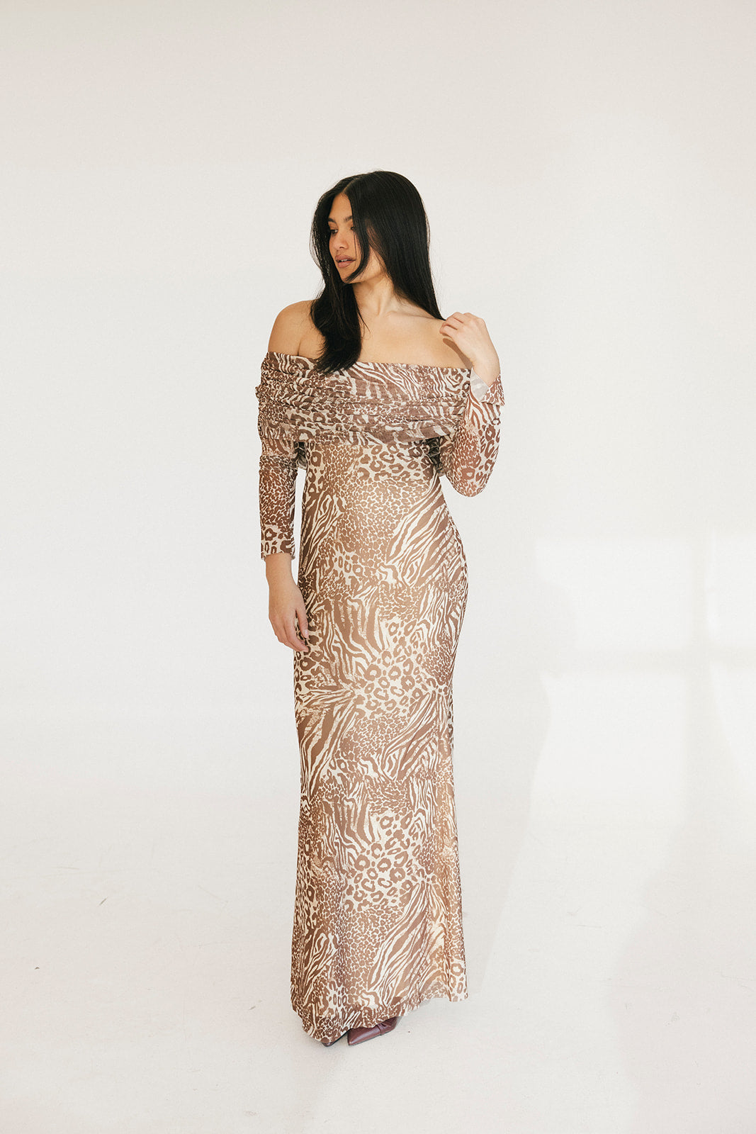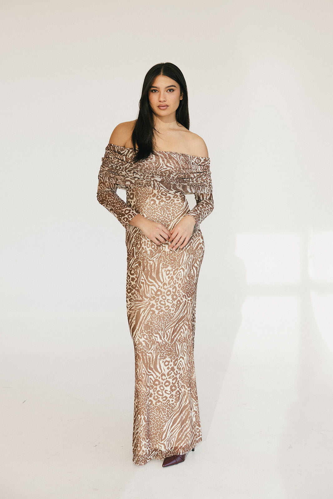 Introducing Mckayle, a stunning off-the-shoulder maxi dress that celebrates modern femininity with timeless elegance. This captivating piece features long sleeves and beautifully gathered detailing that creates movement and dimension. The exclusive taupe animal power mesh print adds a contemporary edge while maintaining sophisticated charm. Perfect for making a memorable entrance at any occasion, Thelma combines daring design with wearable comfort, allowing you to feel confident and radiant in every moment.