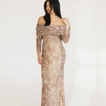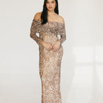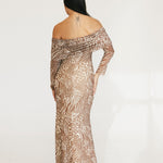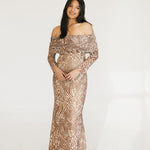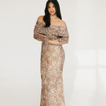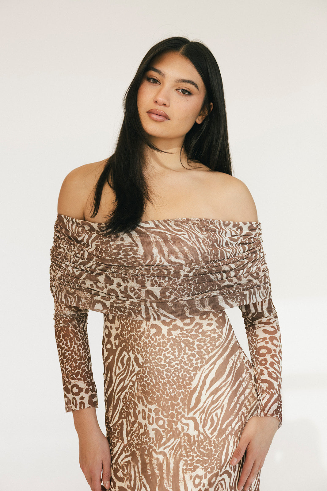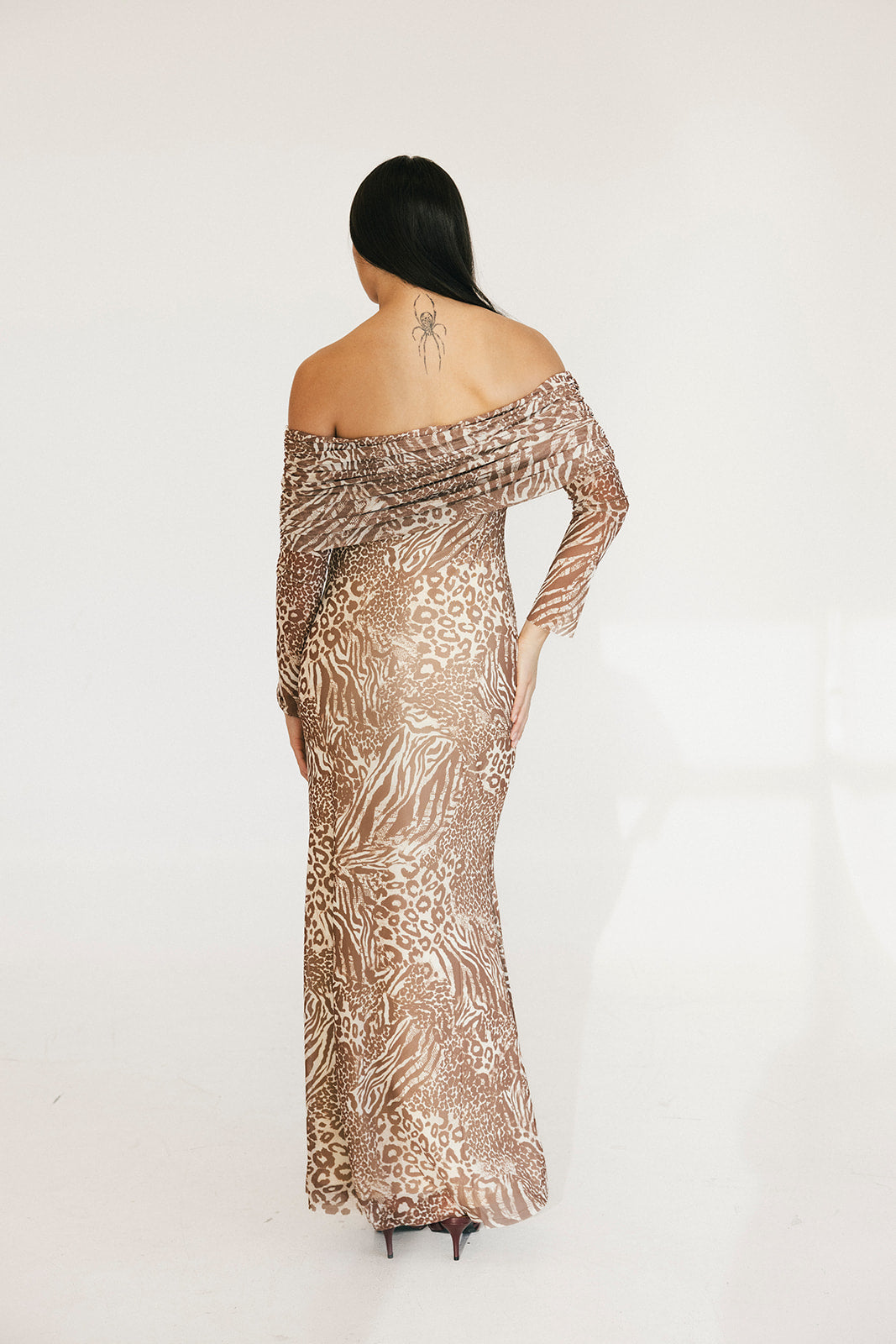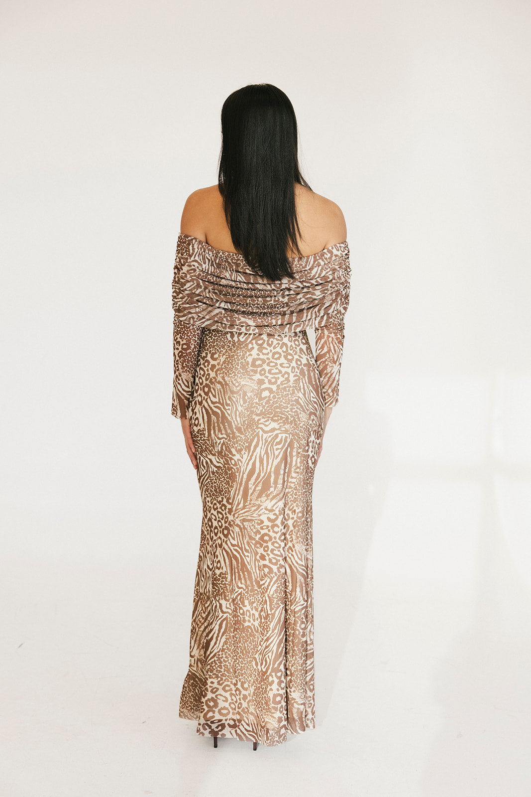 Introducing Mckayle, a stunning off-the-shoulder maxi dress that celebrates modern femininity with timeless elegance. This captivating piece features long sleeves and beautifully gathered detailing that creates movement and dimension. The exclusive taupe animal power mesh print adds a contemporary edge while maintaining sophisticated charm. Perfect for making a memorable entrance at any occasion, Thelma combines daring design with wearable comfort, allowing you to feel confident and radiant in every moment.