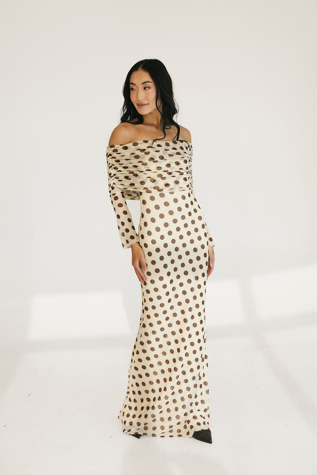 Thelma Off The Shoulder Maxi Dress - Gold Halo Dot