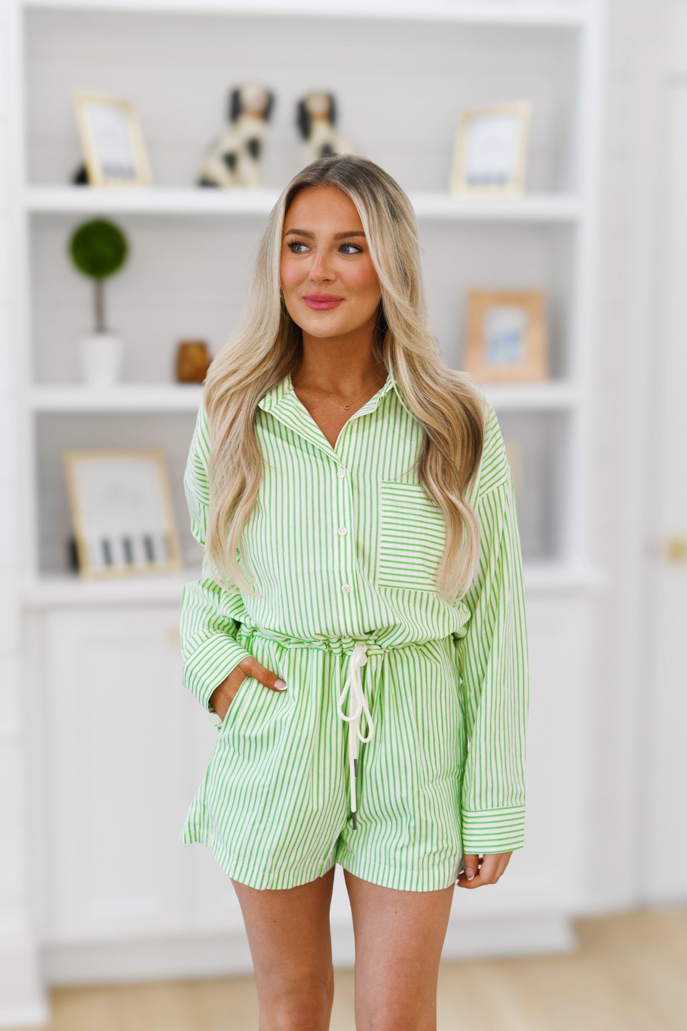 Stay stylish and comfortable with our Rae Belted Romper in Apple Green. This pinstripe romper comes with a belt for a flattering fit, making it perfect for any occasion. A must-have addition to your wardrobe for a chic and effortless look.