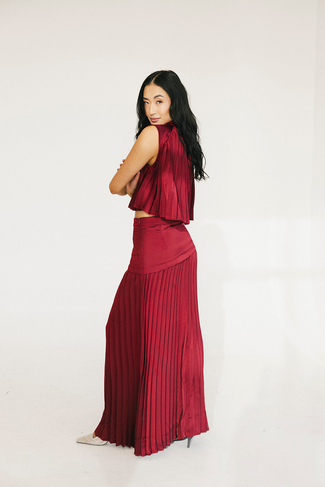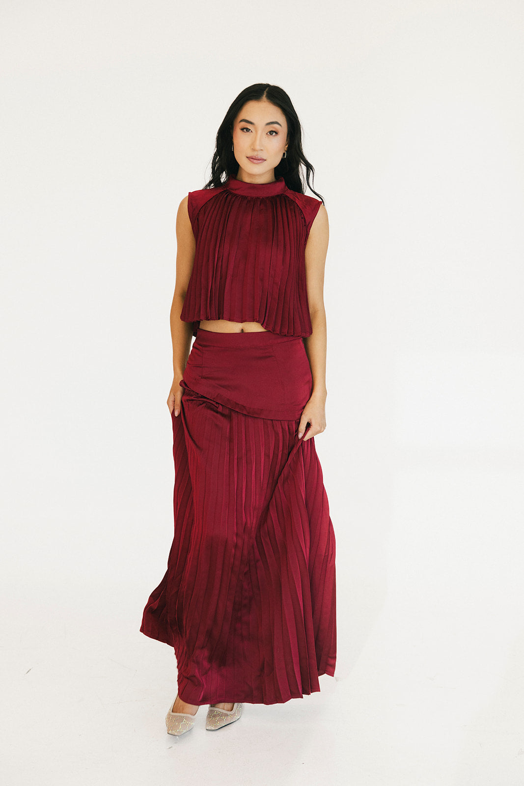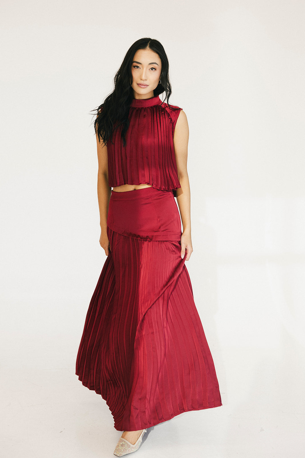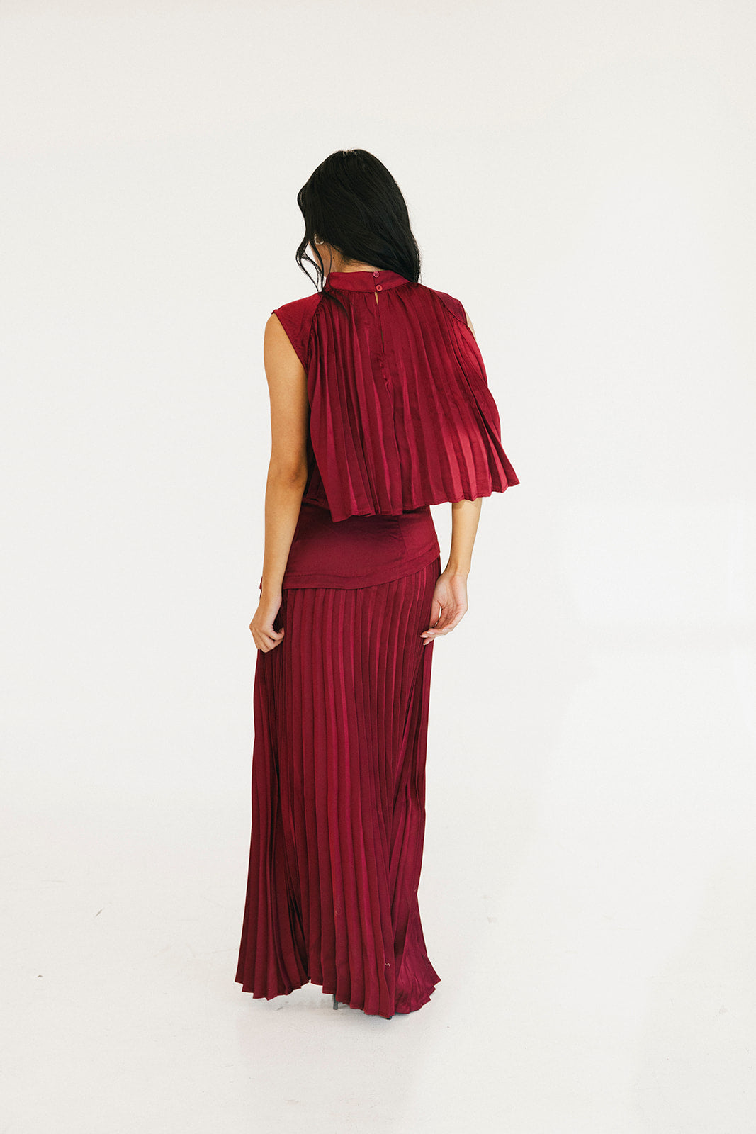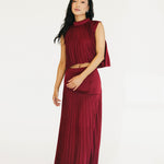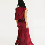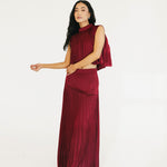 The Bailey Maxi Skirt in Burgundy combines timeless elegance with thoughtful design details. A structured high waistband and wide yoke panel create a flattering silhouette, while signature accordion pleats cascade gracefully down to the hem for effortless movement and visual interest. The concealed back zipper ensures a seamless, polished look from every angle. Perfect for elevating your everyday style or making a statement at special occasions.