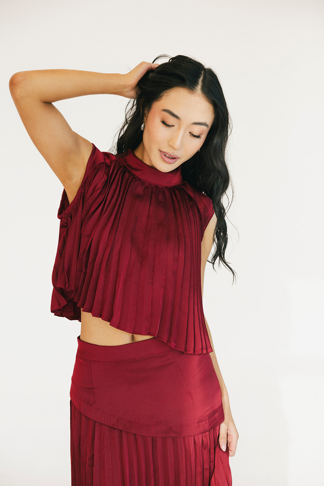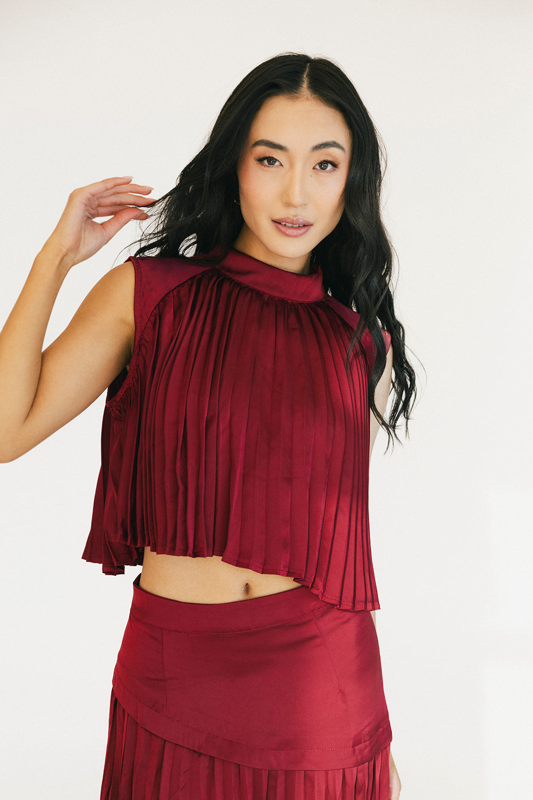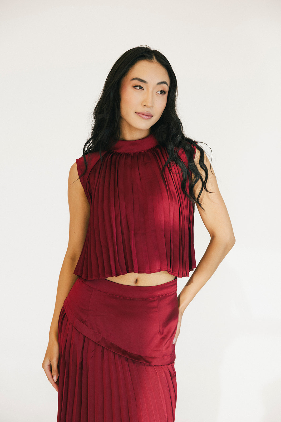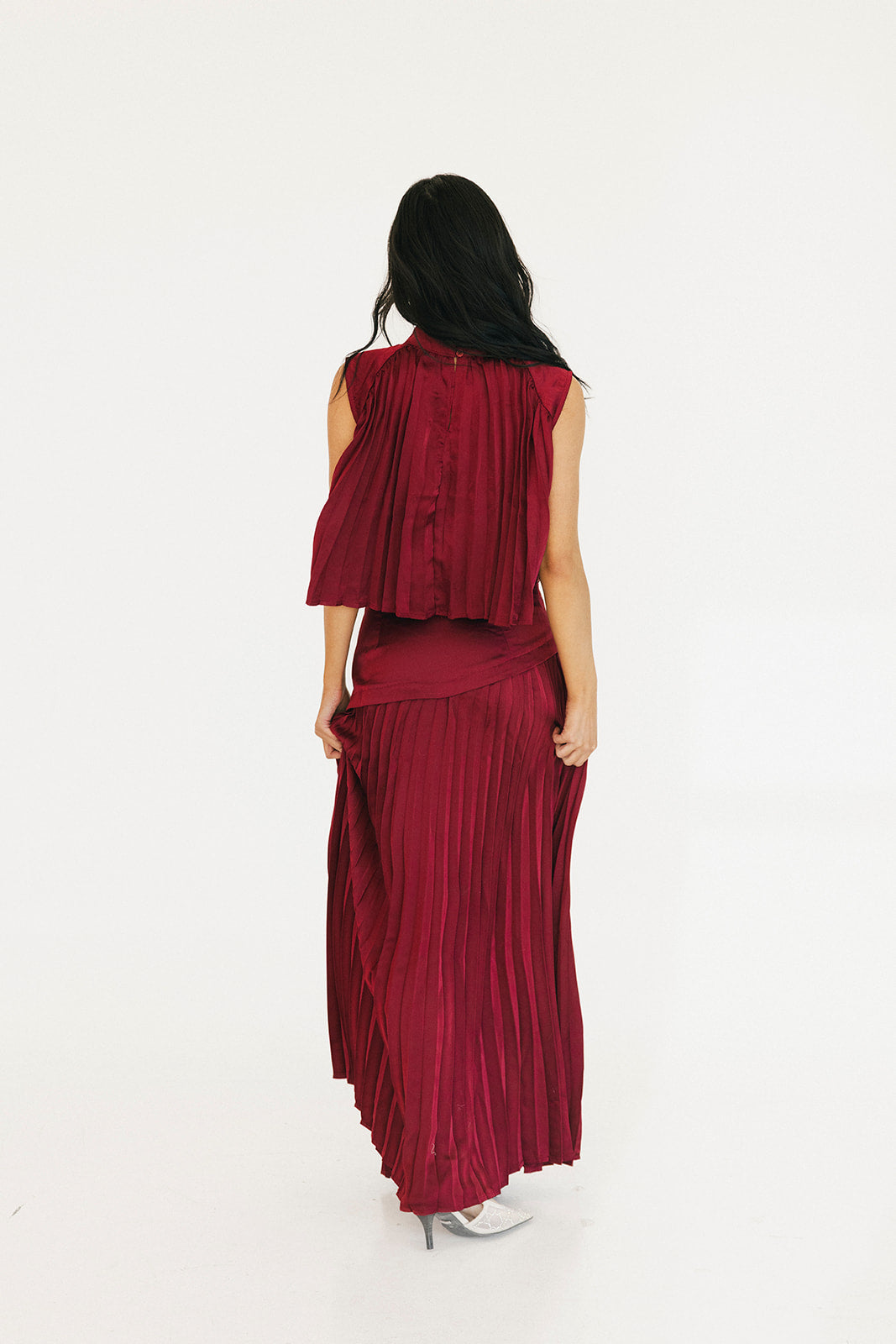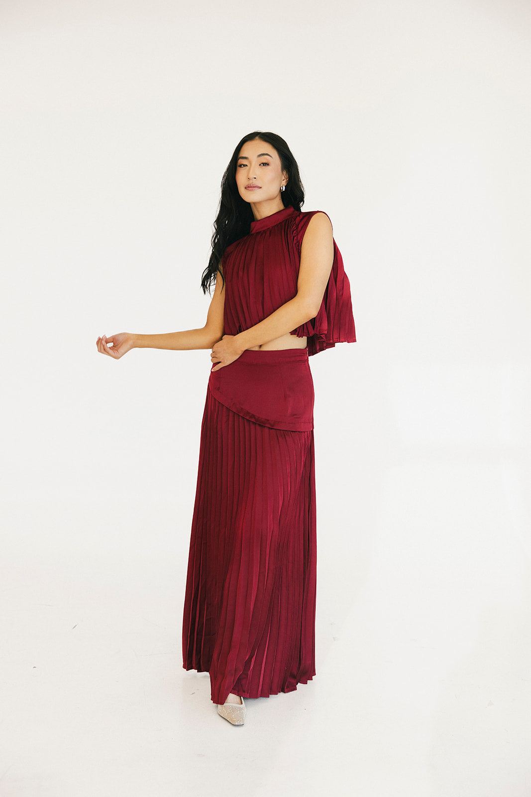 The Bailey Maxi Skirt in Burgundy combines timeless elegance with thoughtful design details. A structured high waistband and wide yoke panel create a flattering silhouette, while signature accordion pleats cascade gracefully down to the hem for effortless movement and visual interest. The concealed back zipper ensures a seamless, polished look from every angle. Perfect for elevating your everyday style or making a statement at special occasions.