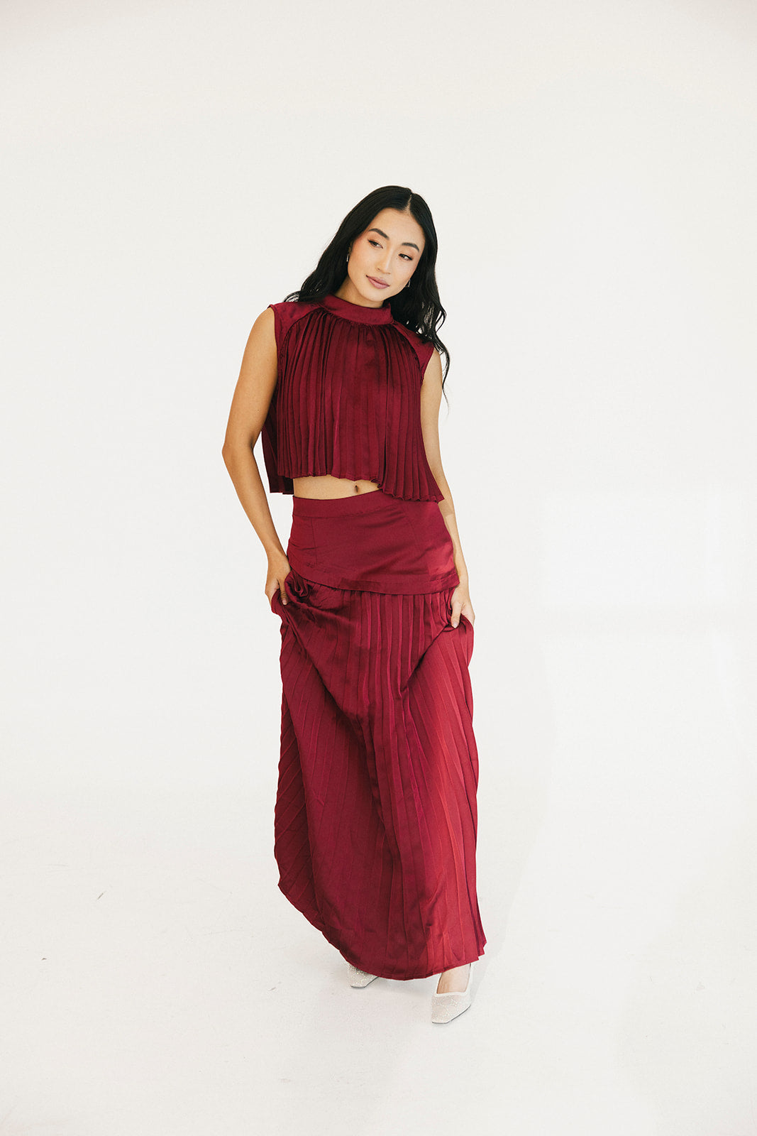 Bailey Mock Neck Pleated Overlay Sleeveless Crop Top - Burgundy