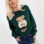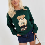 Stay cozy and stylish with the Mary Roll Up Neck 'hoodie Bear' Graphic Sweater in green. Designed for comfort, its soft fabric and unique roll-up neck provide extra warmth and versatility. The charming bear graphic adds a playful touch, making it an ideal choice for everyday wear that uplifts your mood while keeping you snug.