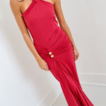 This maxi dress features a graceful neck line and elegant drape design, accented by a refined gold trim that adds a touch of sophistication. Its flowing silhouette ensures comfort and ease, making it perfect for both formal occasions and stylish everyday wear. The timeless details promise a flattering fit that enhances your natural elegance.