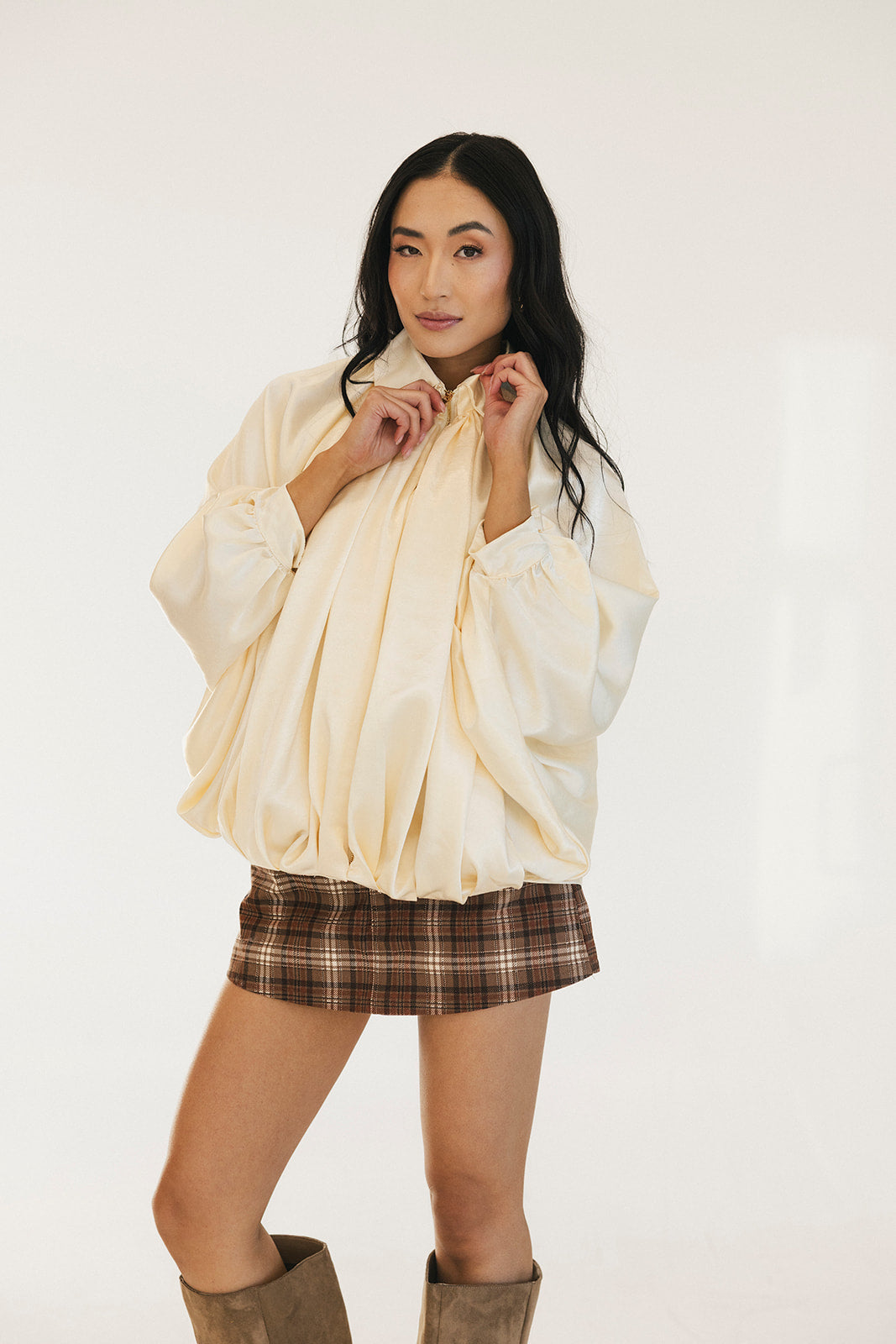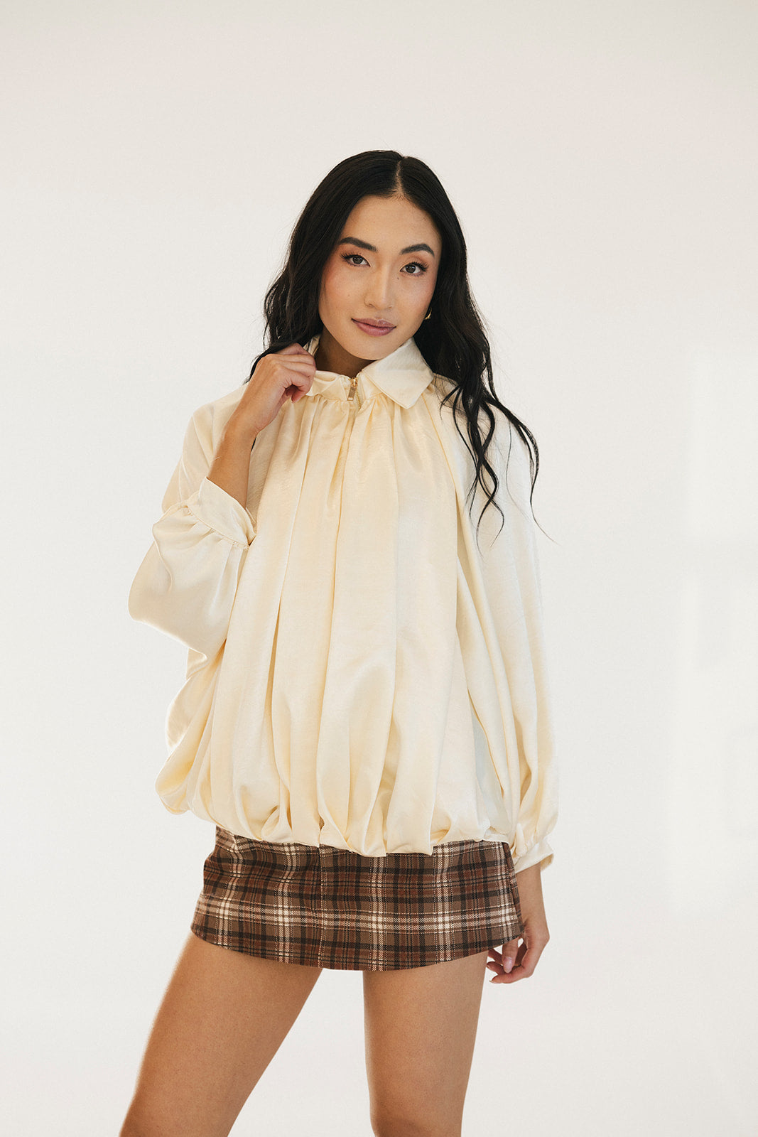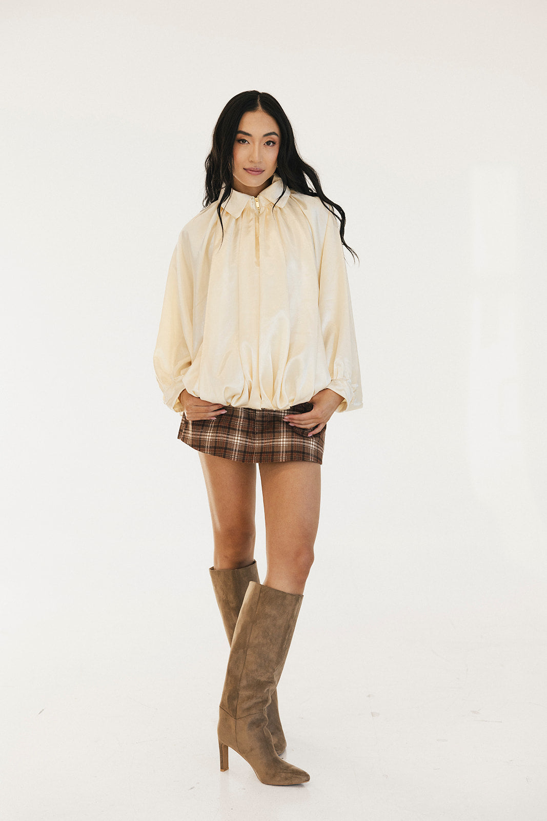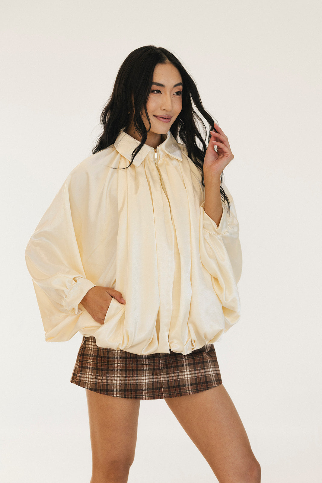 Stay cozy and stylish with the Bev Solid Puffed Bomber Loose Jacket. This trendy piece features a comfortable oversized fit that flatters every body type, paired with a sleek front zipper closure for easy layering. The puffy construction provides warmth without bulk, making it perfect for transitional weather. Whether you're running errands or meeting friends, this versatile beige bomber brings an effortless, contemporary edge to any casual outfit. Embrace comfort without compromising on fashion.