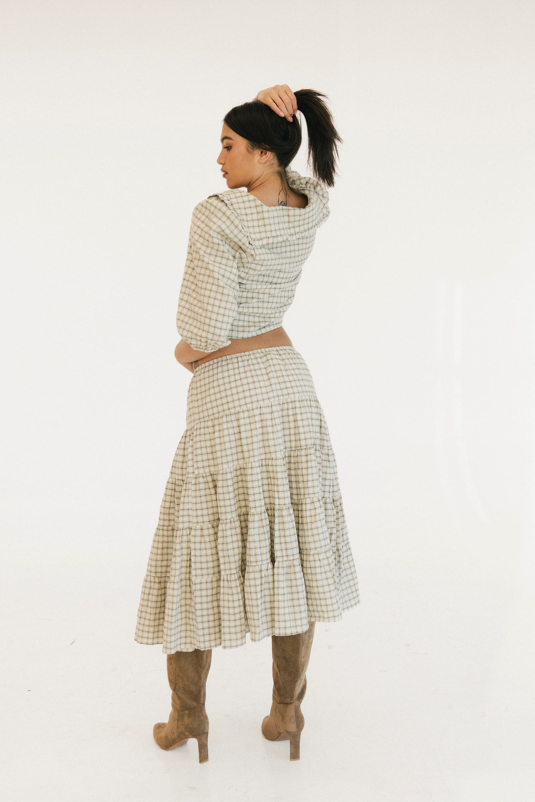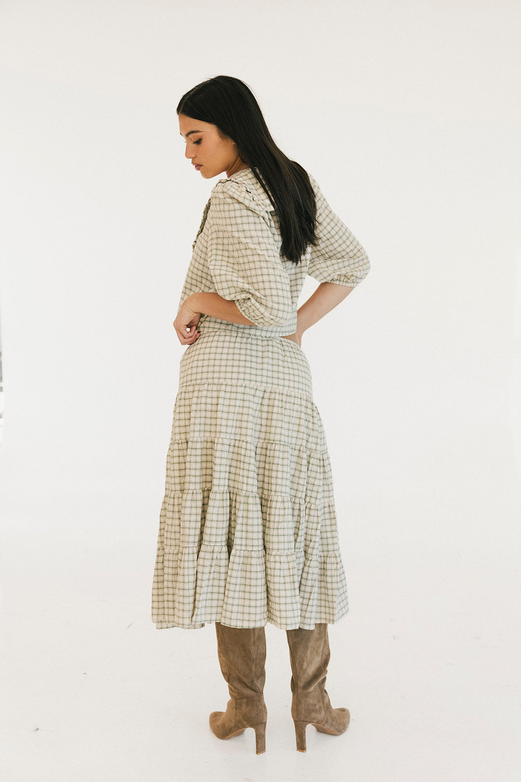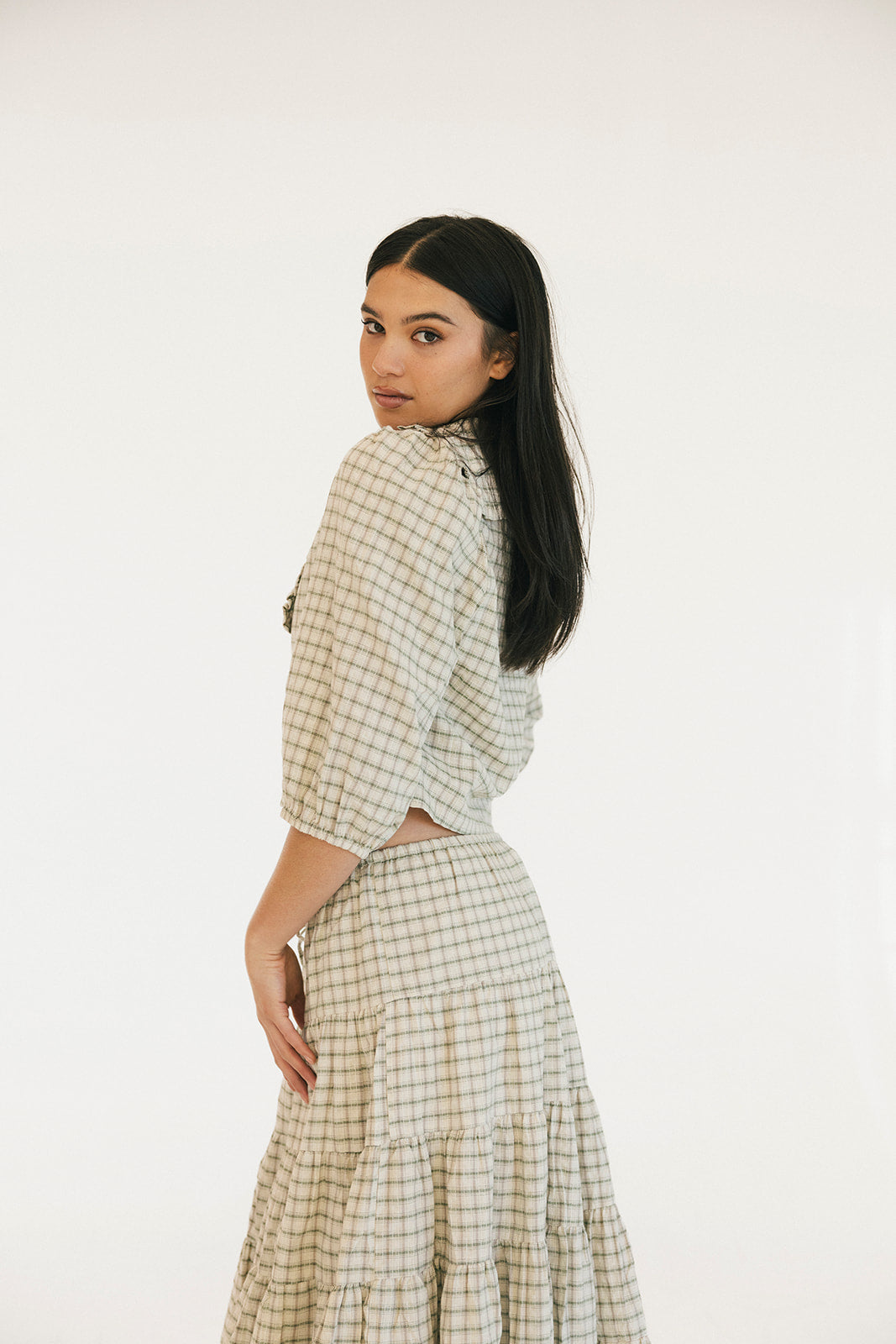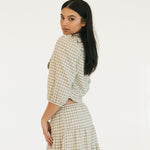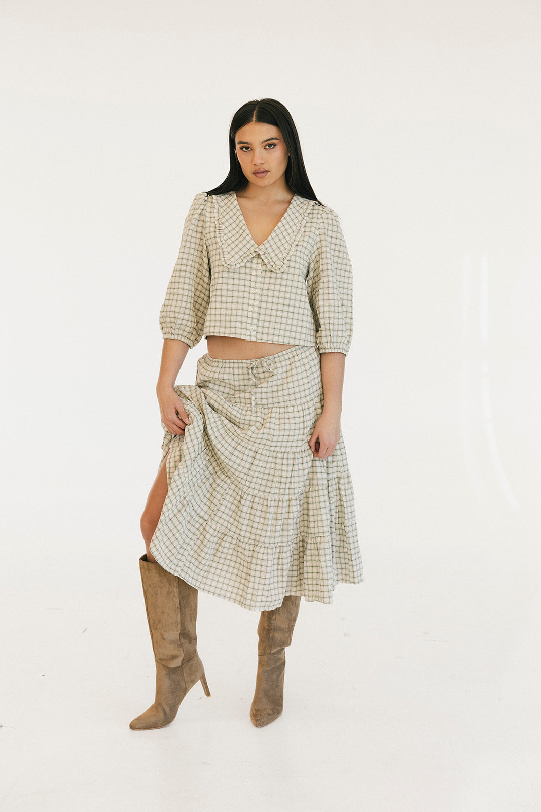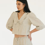 Elevate your everyday wardrobe with this charming Casey Plaid Button Blouse in olive. The allover check pattern brings timeless appeal, while the oversized ruffle-edge sailor collar adds a playful, vintage-inspired touch. Designed for comfort and style, this top features a front button closure, puff 3/4 sleeves with elastic hems for a flattering fit, and a straight hem. Crafted from lightweight woven fabric, it's perfect for layering or wearing solo throughout the seasons. A versatile piece that celebrates your personal style.