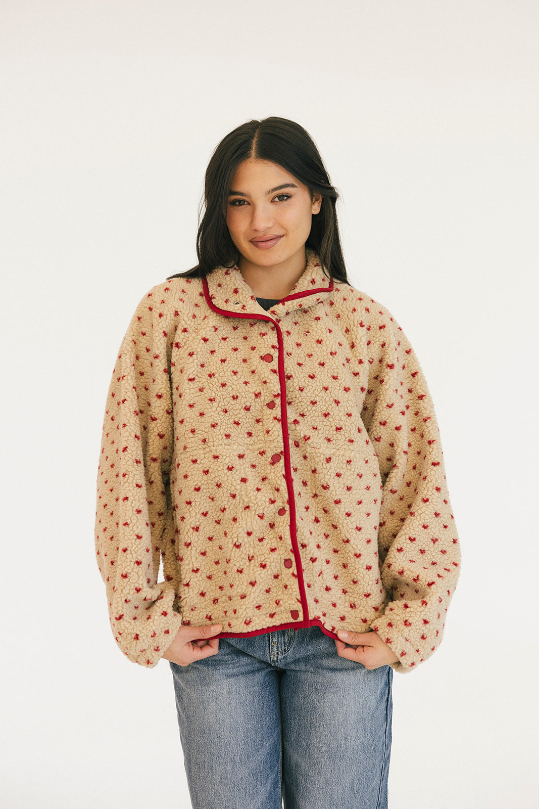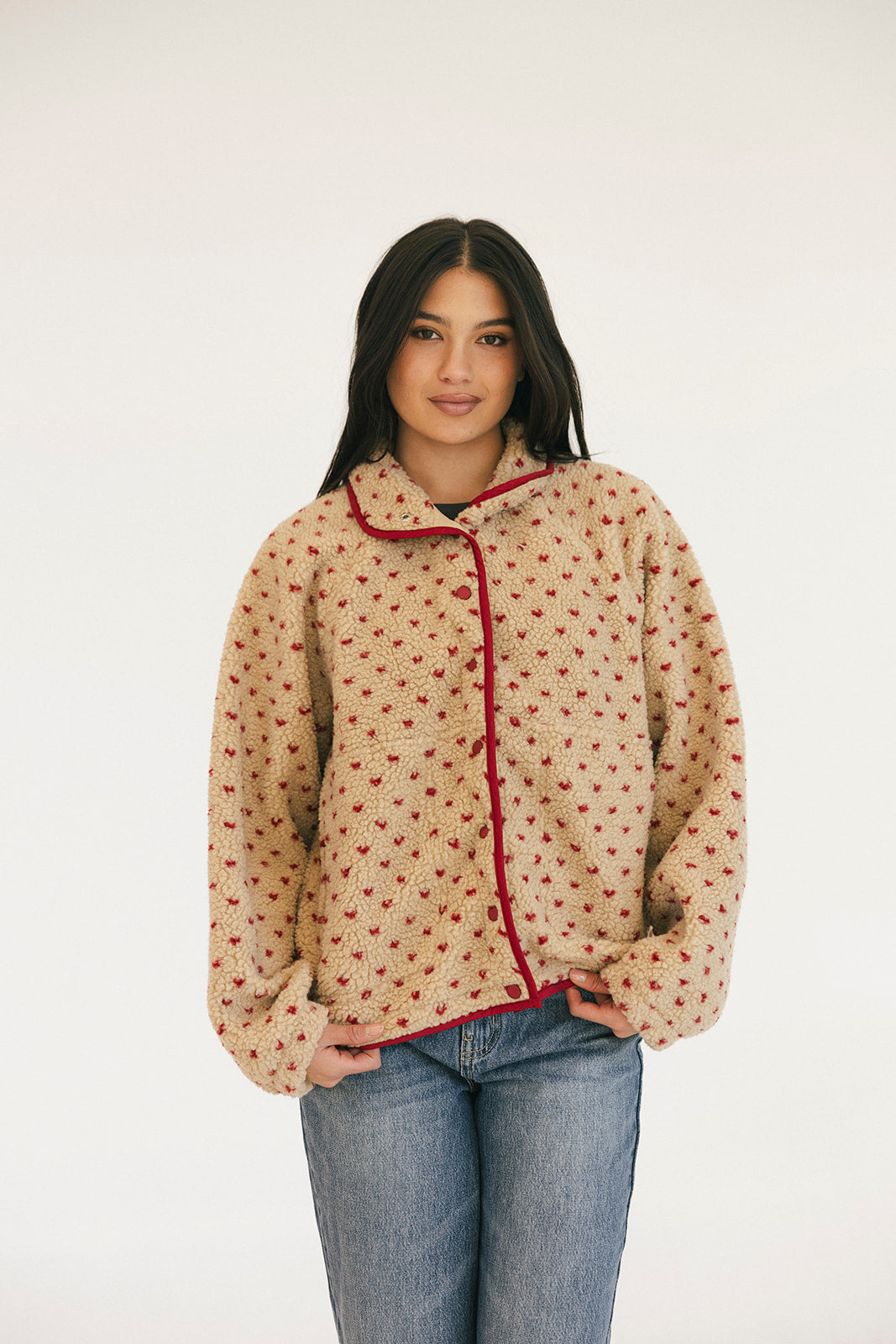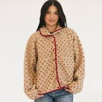 Wrap yourself in comfort with the Courtney Fleece Jacket, featuring soft taupe fleece accented with striking red embroidery and trim details. This cozy layer is perfect for casual days and cool evenings, offering warmth without bulk. The supportive fit runs true to size, so you can confidently choose your usual size for a flattering silhouette. Whether you're heading out for errands or settling in at home, this jacket delivers both style and comfort in one versatile piece.