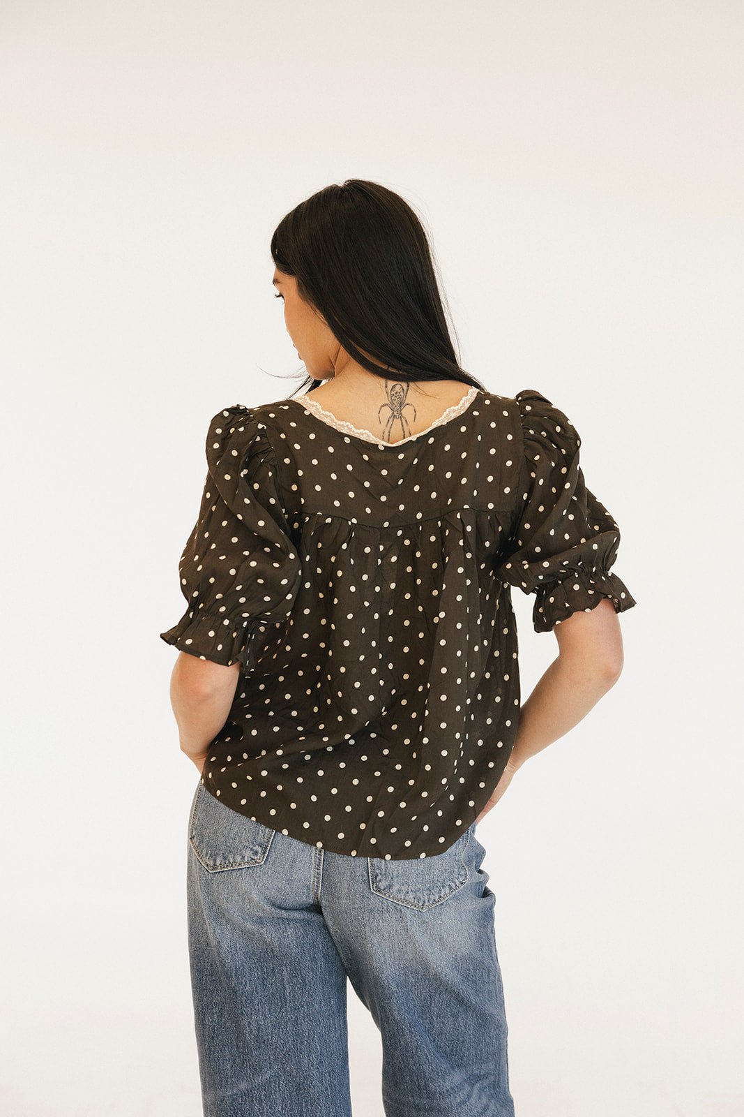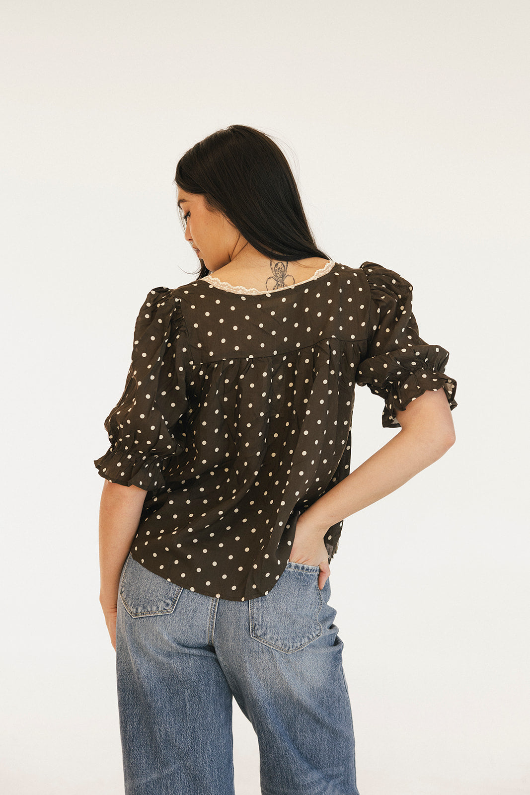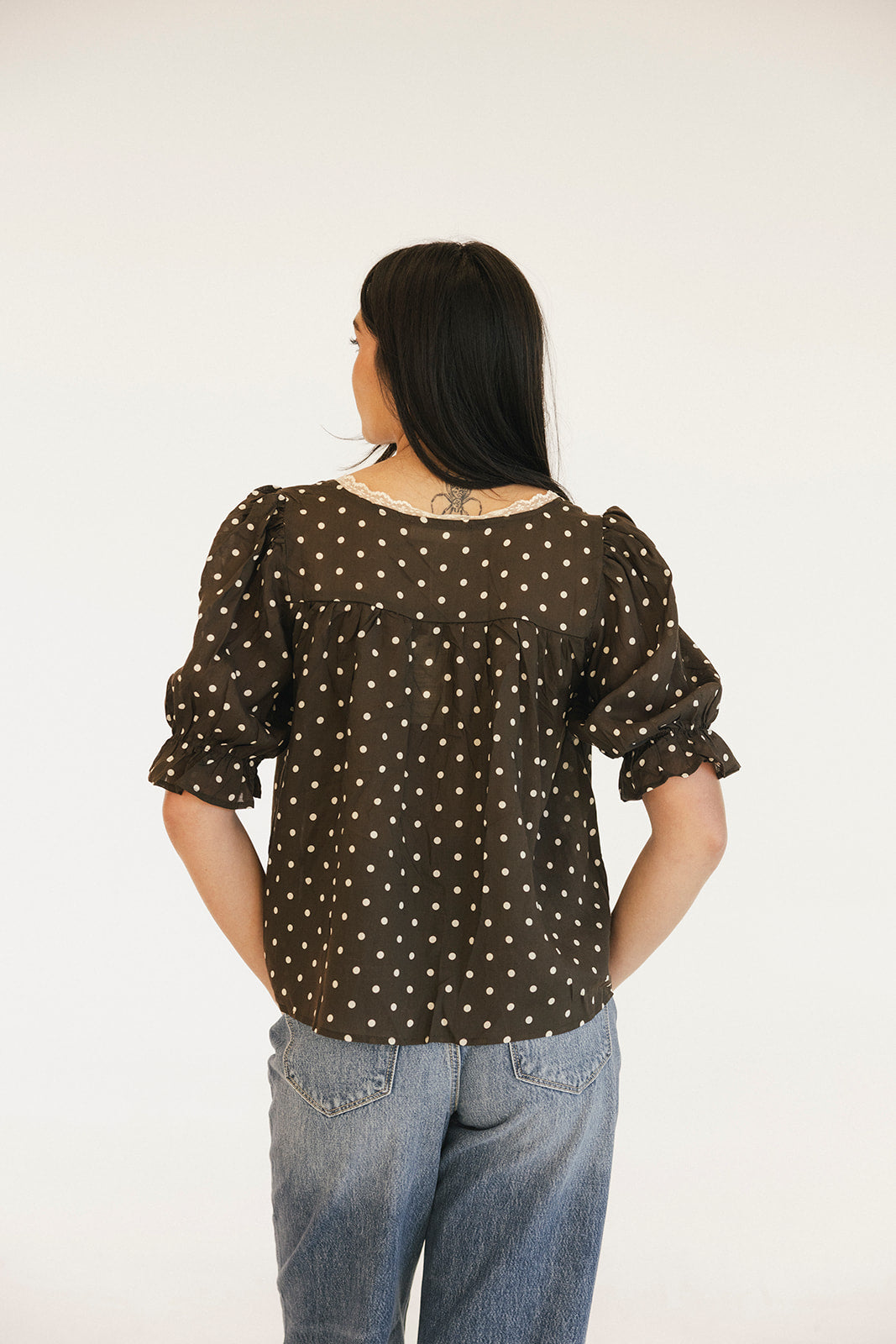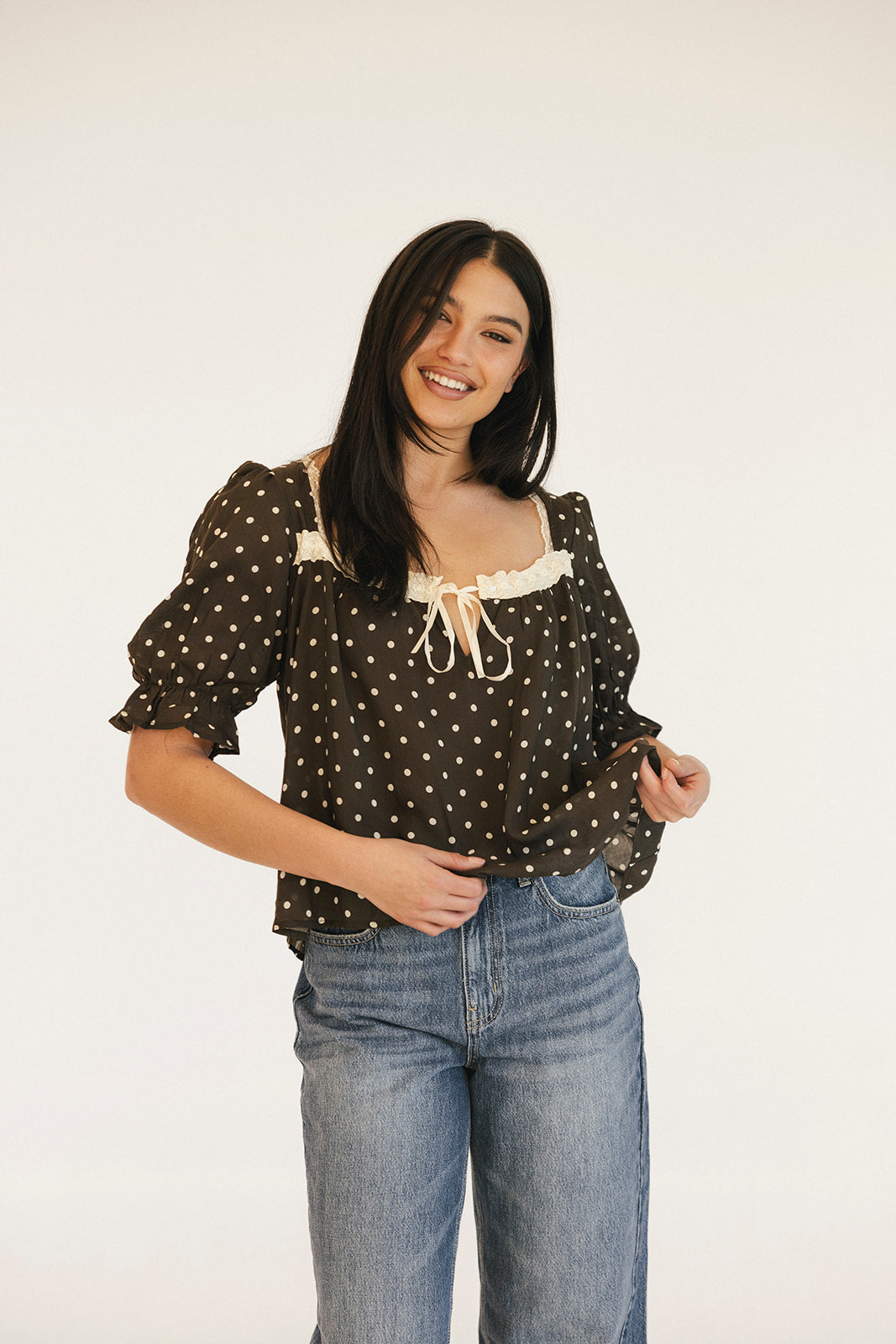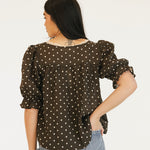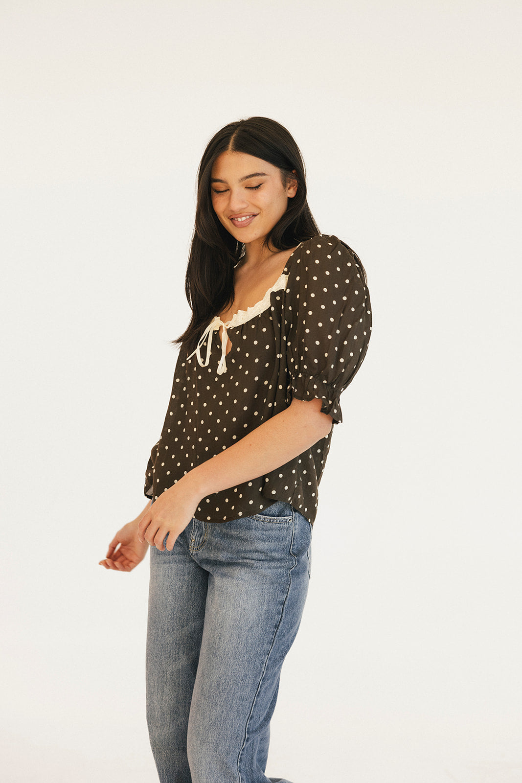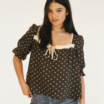 This charming blouse combines timeless style with everyday comfort. Crafted from a soft woven rayon-polyester blend, it features a classic polka dot print in rich dark brown tones. The square neckline and quarter sleeves offer a flattering silhouette, while delicate lace accents and adjustable strap details add feminine flair. Perfect for dressing up or down, this versatile top brings effortless elegance to your wardrobe.