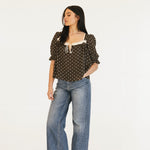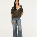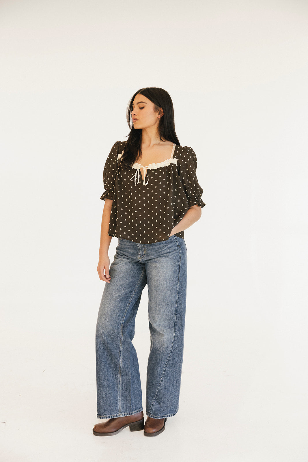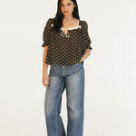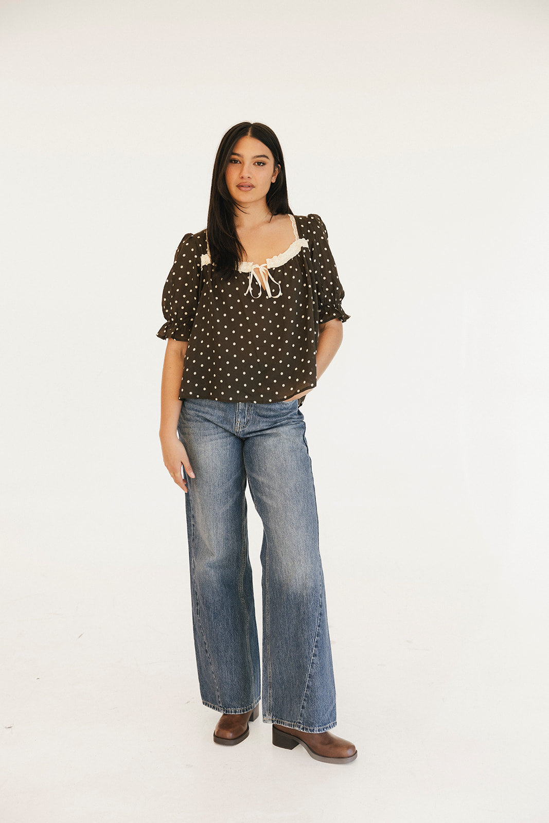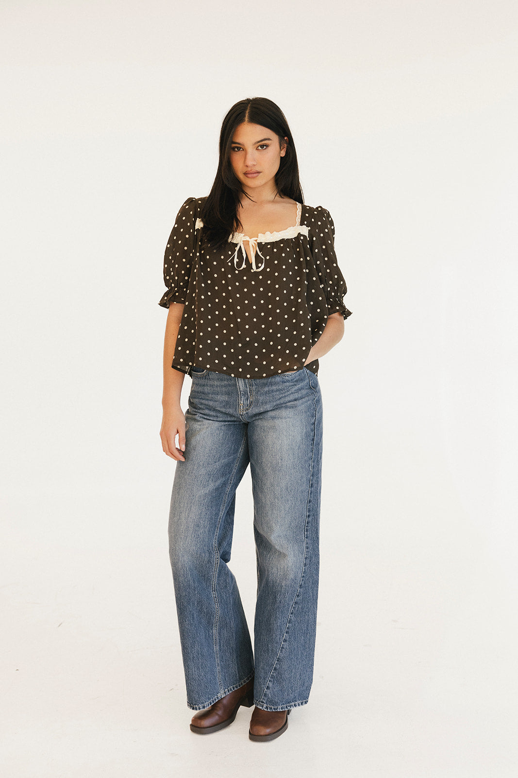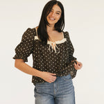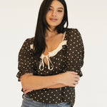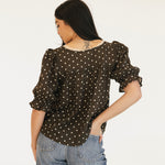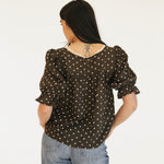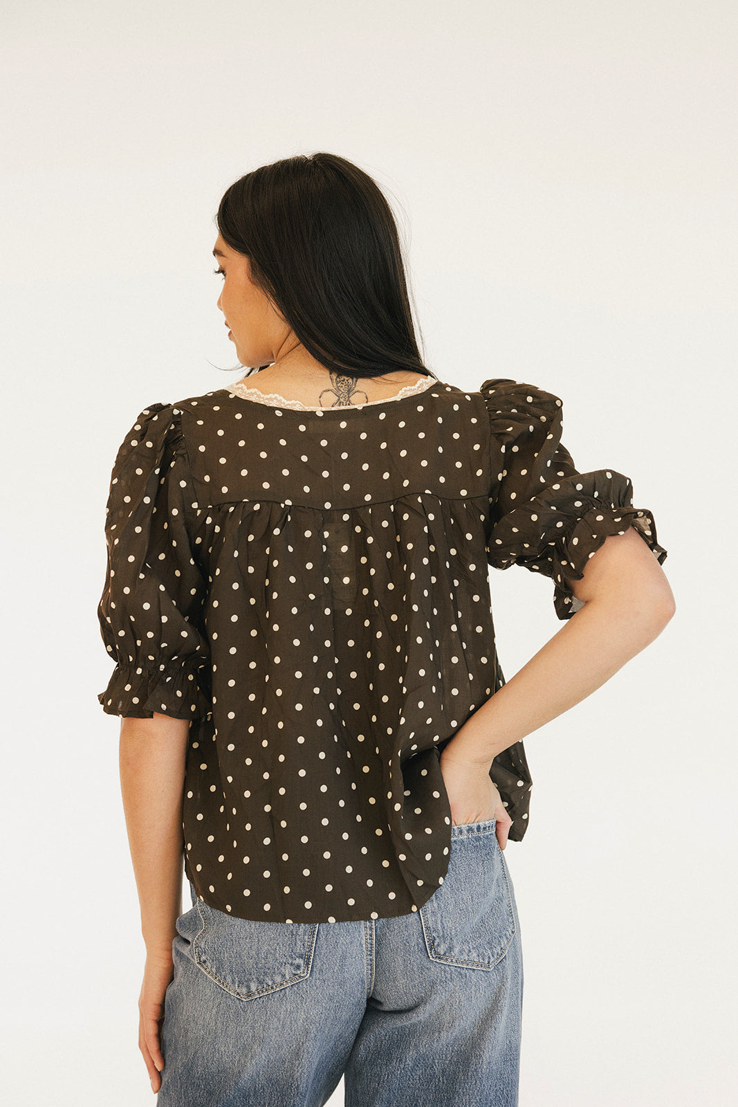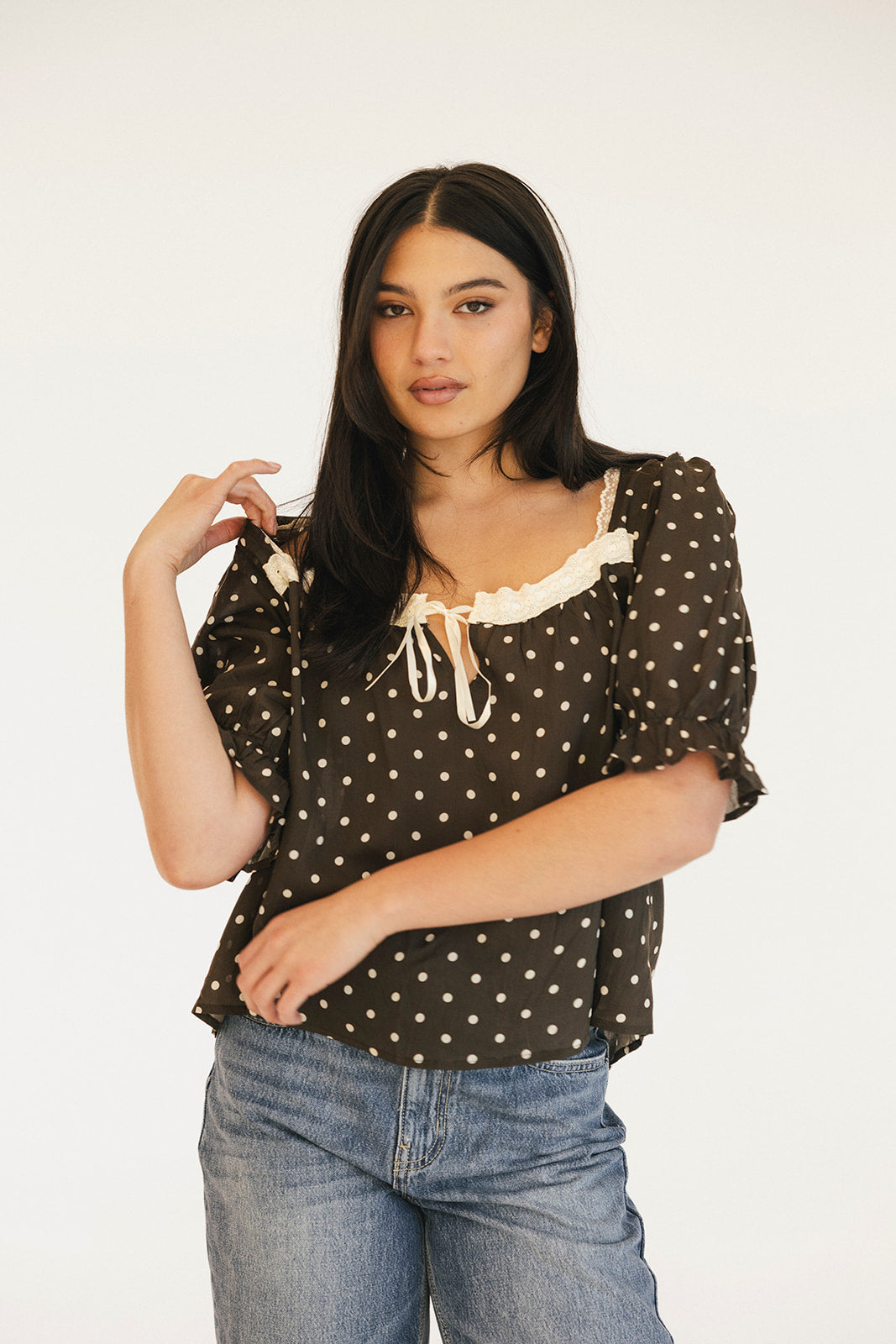 This charming blouse combines timeless style with everyday comfort. Crafted from a soft woven rayon-polyester blend, it features a classic polka dot print in rich dark brown tones. The square neckline and quarter sleeves offer a flattering silhouette, while delicate lace accents and adjustable strap details add feminine flair. Perfect for dressing up or down, this versatile top brings effortless elegance to your wardrobe.