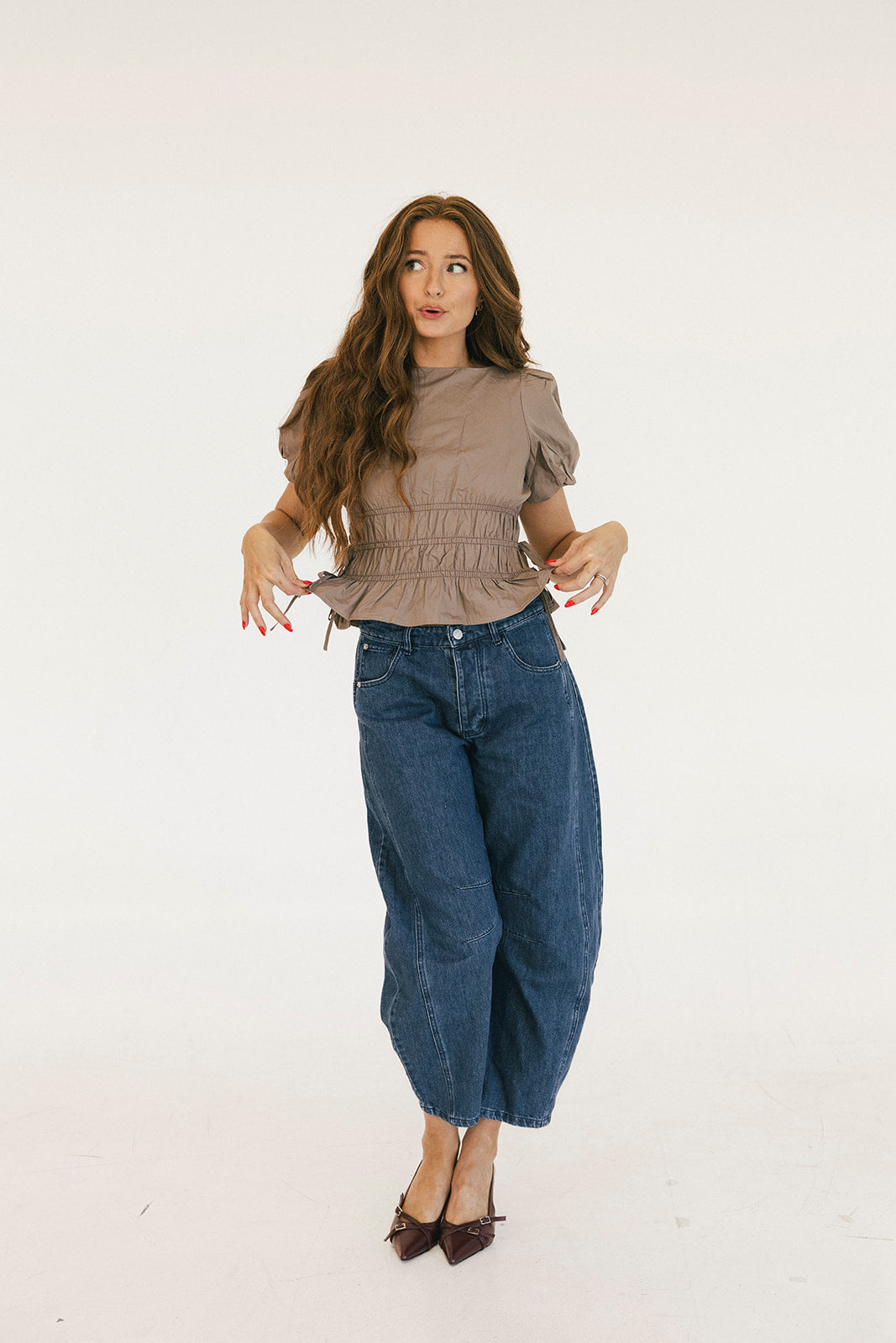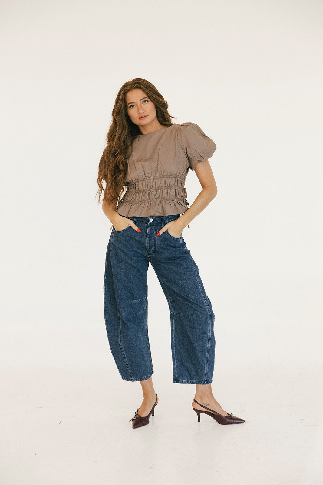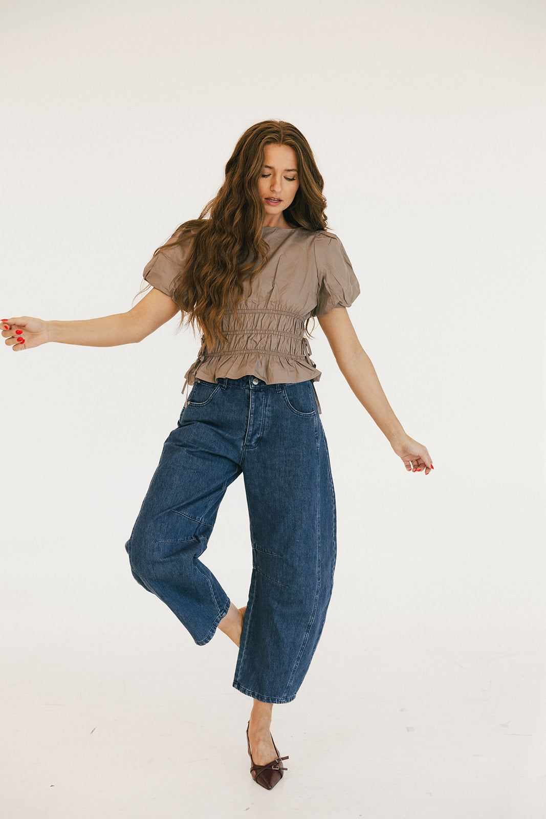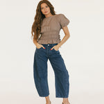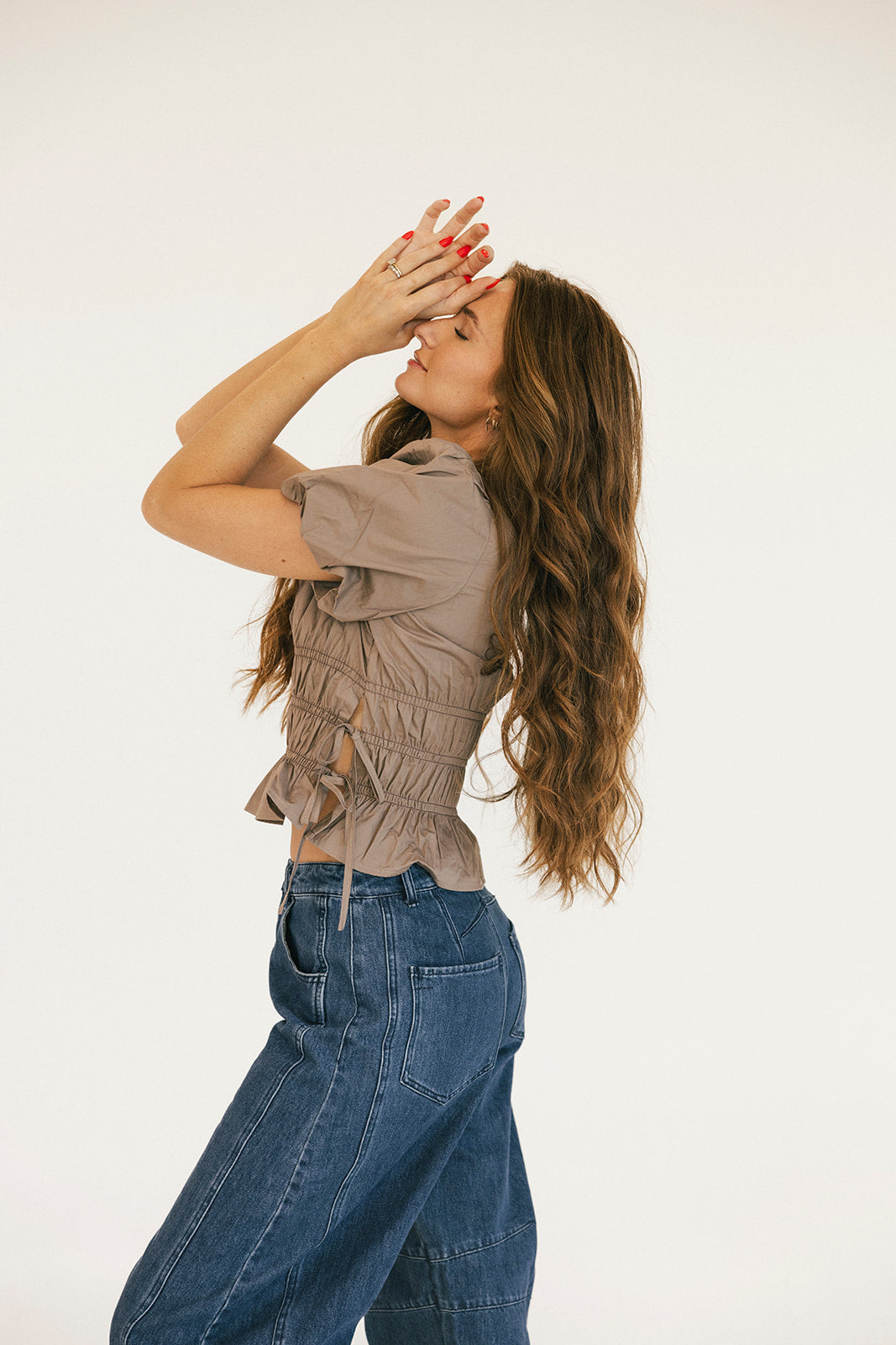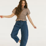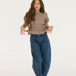 Elevate your everyday wardrobe with this charming Sophie top, designed to make you feel confident and comfortable. The full smocked bodice creates beautiful texture and gentle shaping, while the wide boat neckline offers a flattering, timeless silhouette. Puff short sleeves add a playful touch, and the ruffle hem detail brings movement and dimension. Adjustable side drawstring ties let you customize the fit to your preference. Crafted from lightweight cotton poplin, this cropped top is perfect for warm weather styling and pairs effortlessly with your favorite bottoms.
