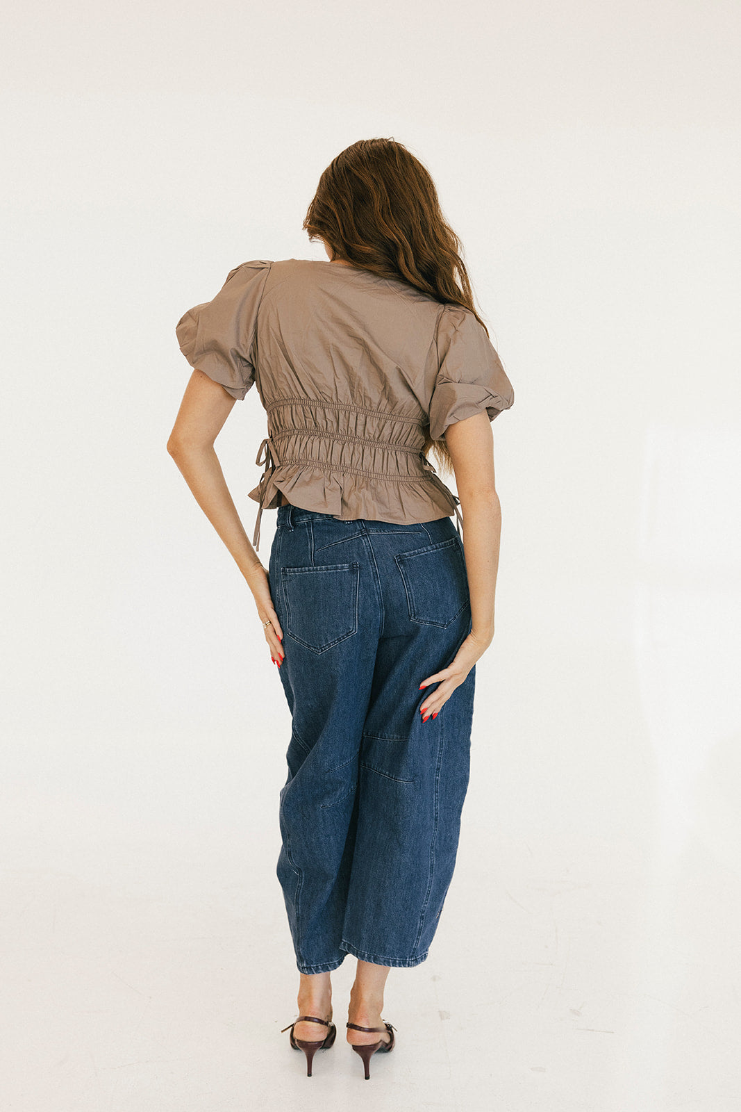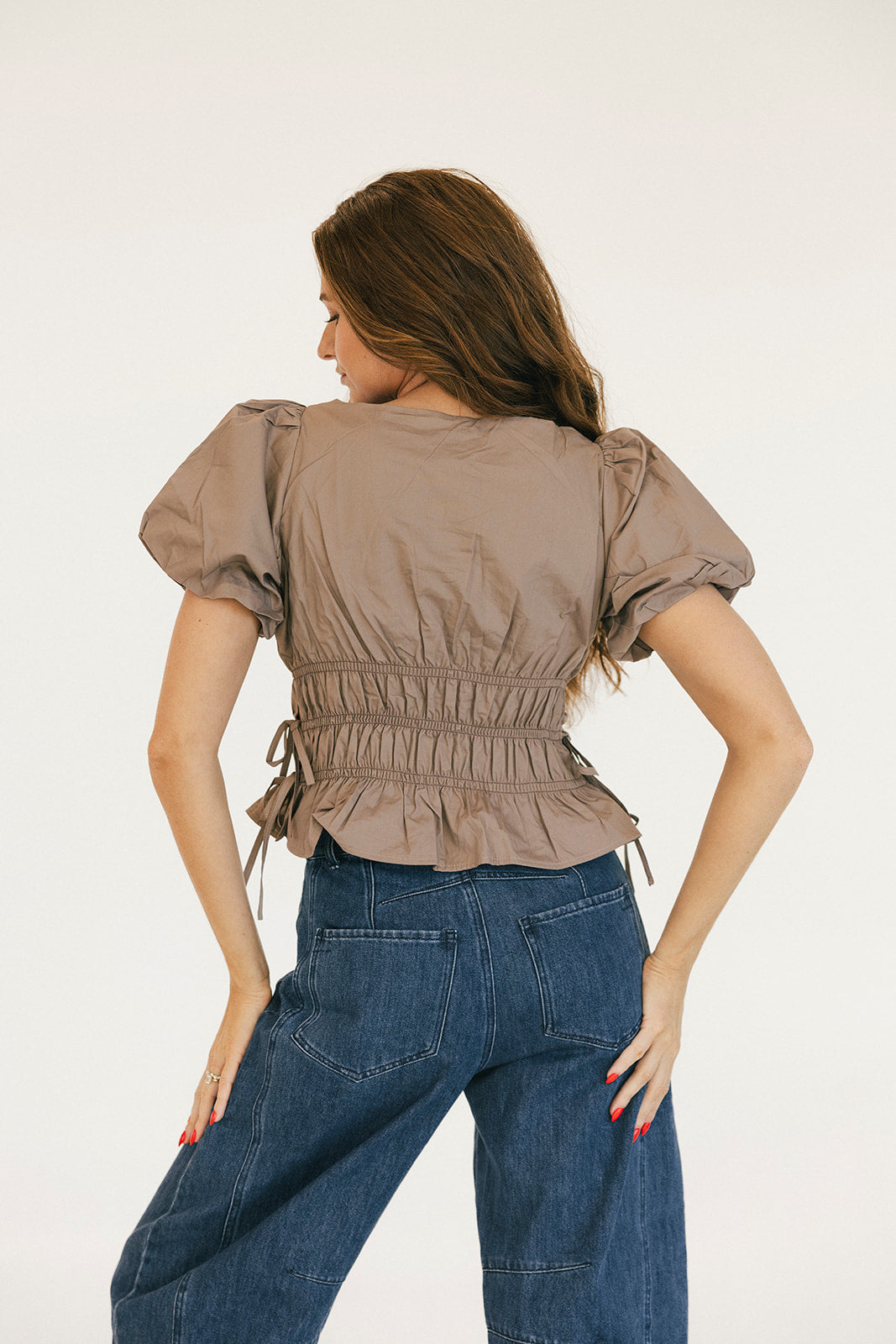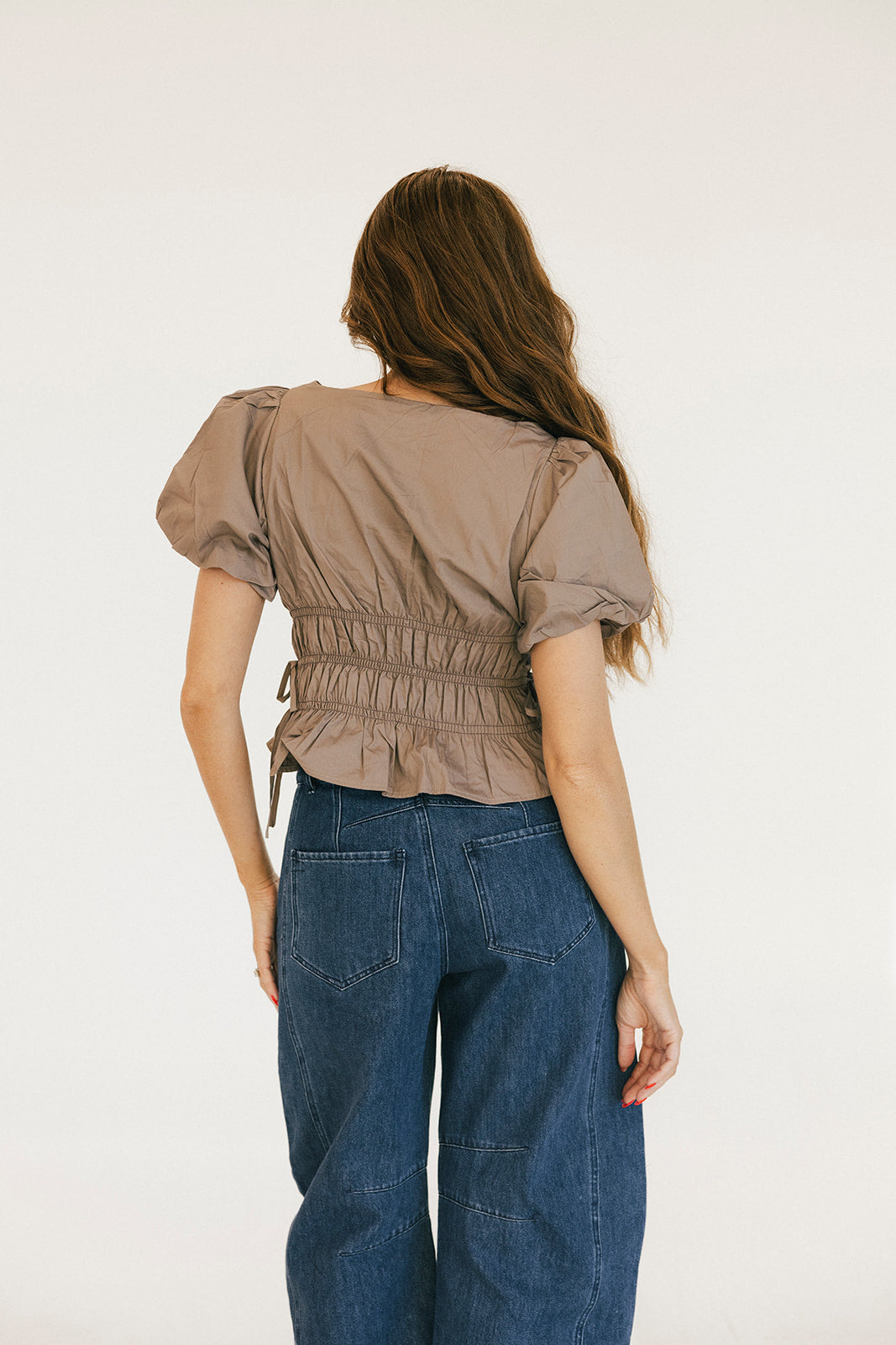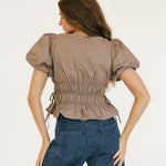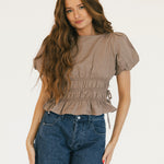 Sophie Boat Neckline Smocked Puff Sleeves Top - Mocha Brown