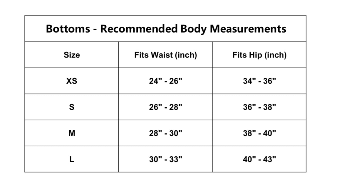 XS - 24"-26" (waist) / 34"-36" (hips)