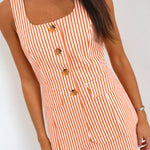This Grace Striped Romper features a comfortable round neckline and sleeveless design, perfect for warm days. The front button closure adds a classic touch, while the hidden side zipper ensures an easy fit. Crafted from stretchy cotton fabric with a chic black and white stripe print, it offers both style and comfort for effortless wear.