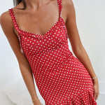 This Ashley Polka Dot Mini Dress in classic red features a flattering V-neck and playful polka dot print. Its sleeveless design with elastic ruffle straps ensures comfortable wear while the ruffle trim adds a feminine touch. Perfect for warm days or layered looks, this dress combines style and ease for your everyday wardrobe.