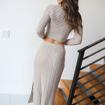 This mocha-colored set features a ribbed knit long sleeve asymmetrical crop top paired with a matching midi skirt. The wrap-style top offers a flattering fit, while the skirt includes a side slit for added comfort and movement. Together, they create a stylish and cohesive look that's perfect for both casual outings and dressed-up occasions.
