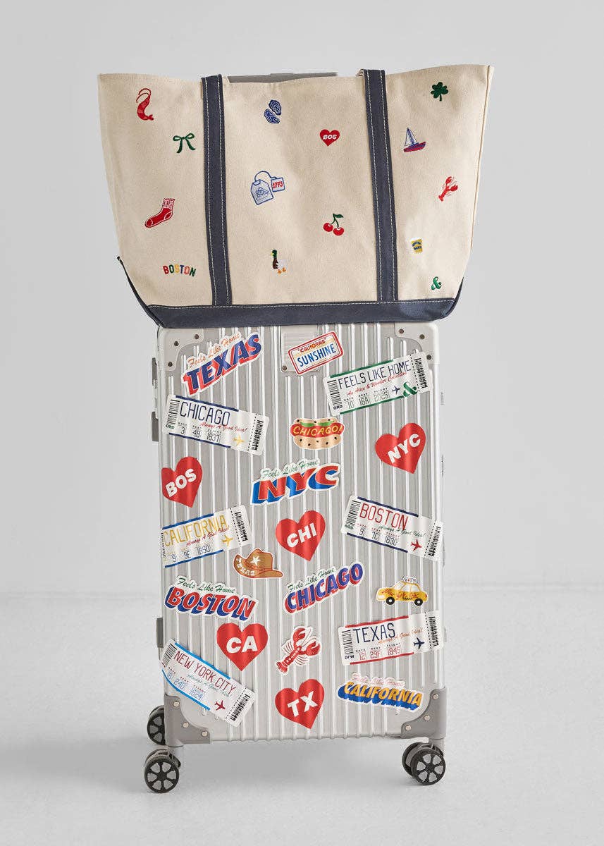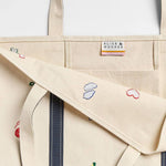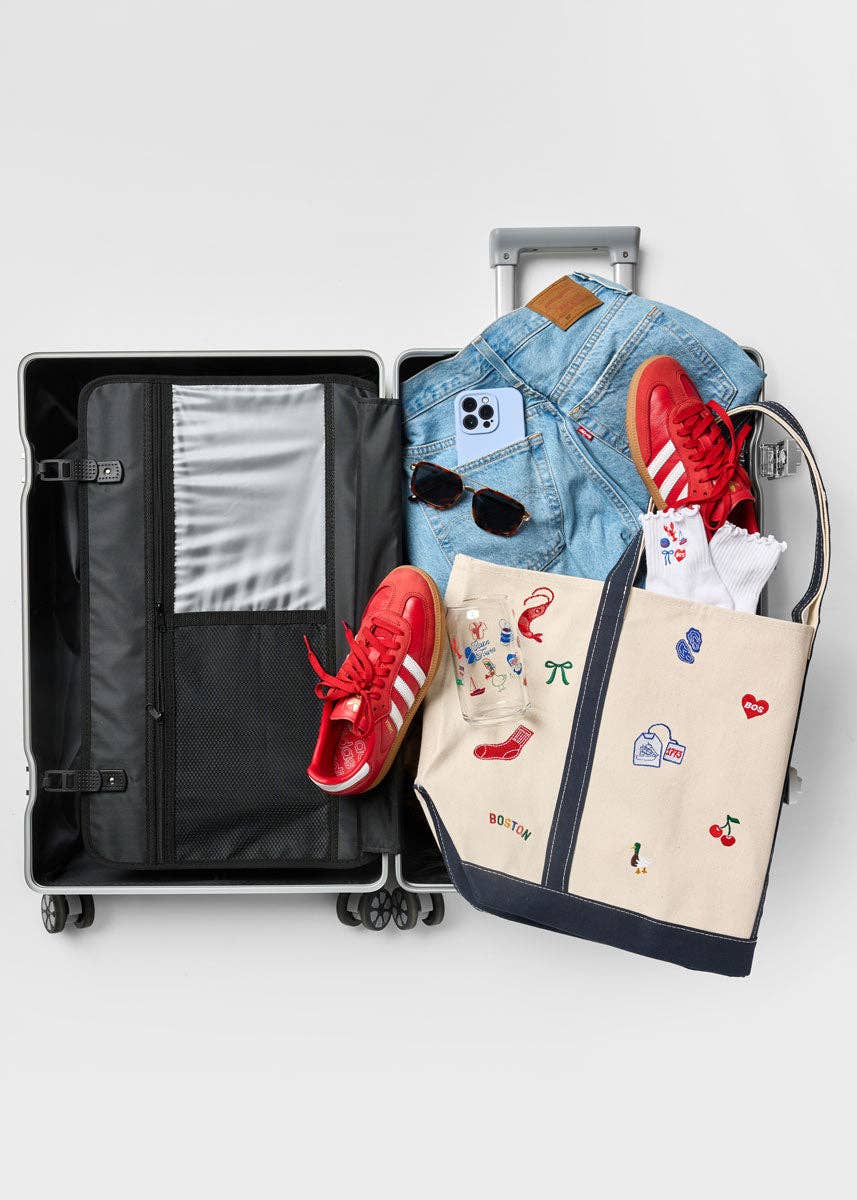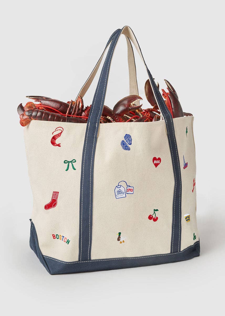 The perfect carryall for harbor days, farmer's market strolls and running all the errands. No matter where you go, it feels like home. Natural embroidered Boston icons tote. Navy shoulder straps reinforced and double stitched. Interior pocket. Heavyweight cotton canvas. Spot clean.