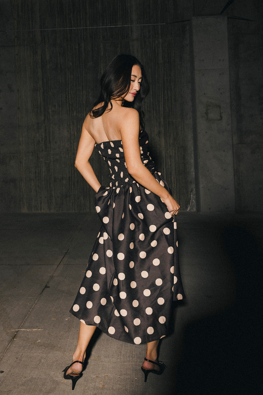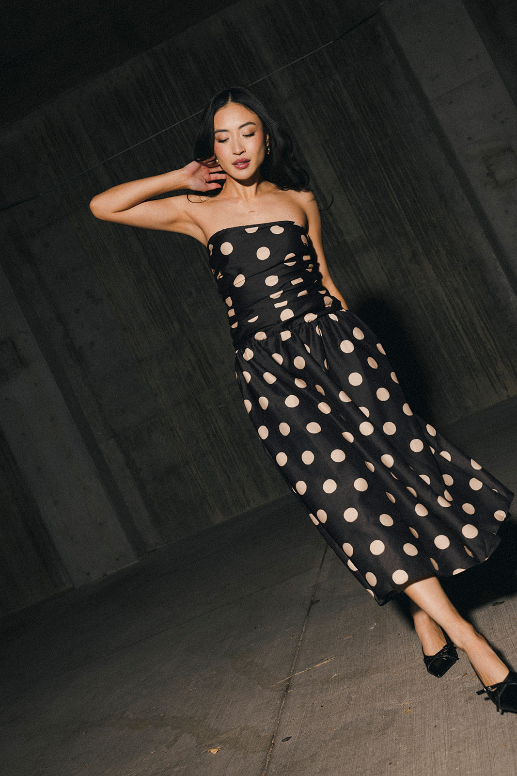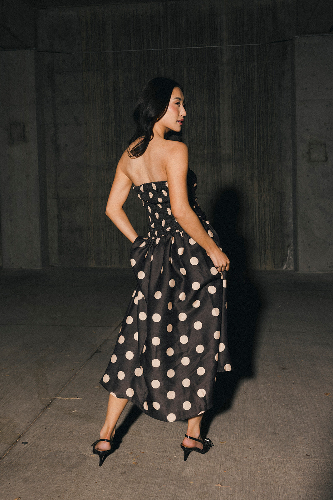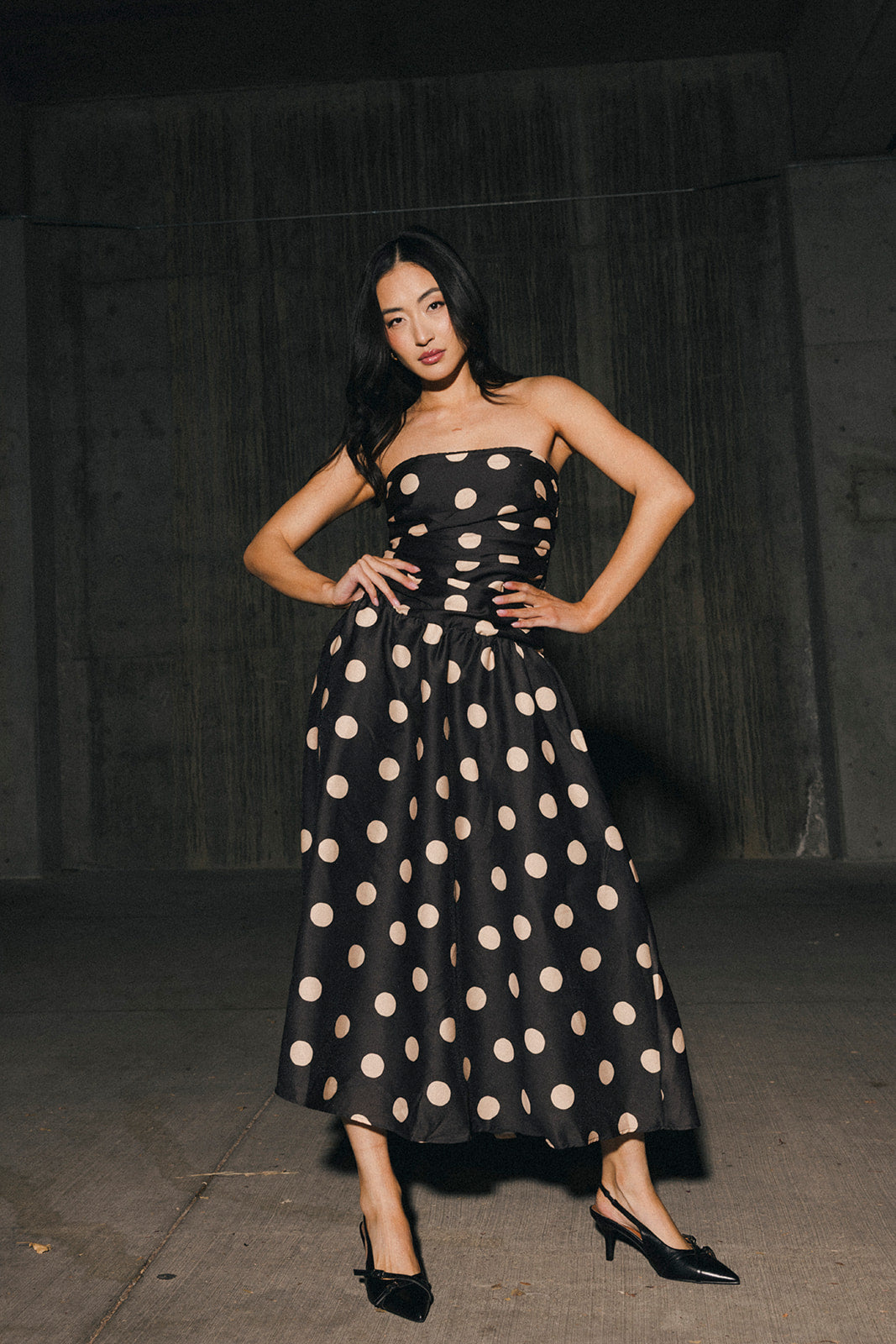 Celebrate the season in effortless elegance with the Brittany Polka Dot Midi Dress. This strapless midi silhouette features a timeless polka dot pattern on a sleek black background, making it the perfect choice for holiday gatherings and special occasions. The supportive strapless design keeps you comfortable all night long, while the midi length offers a sophisticated, flattering fit. Whether you're heading to a festive party or an intimate dinner, this versatile piece transitions beautifully from day to evening wear. Dress it up with heels and statement jewelry for maximum impact.