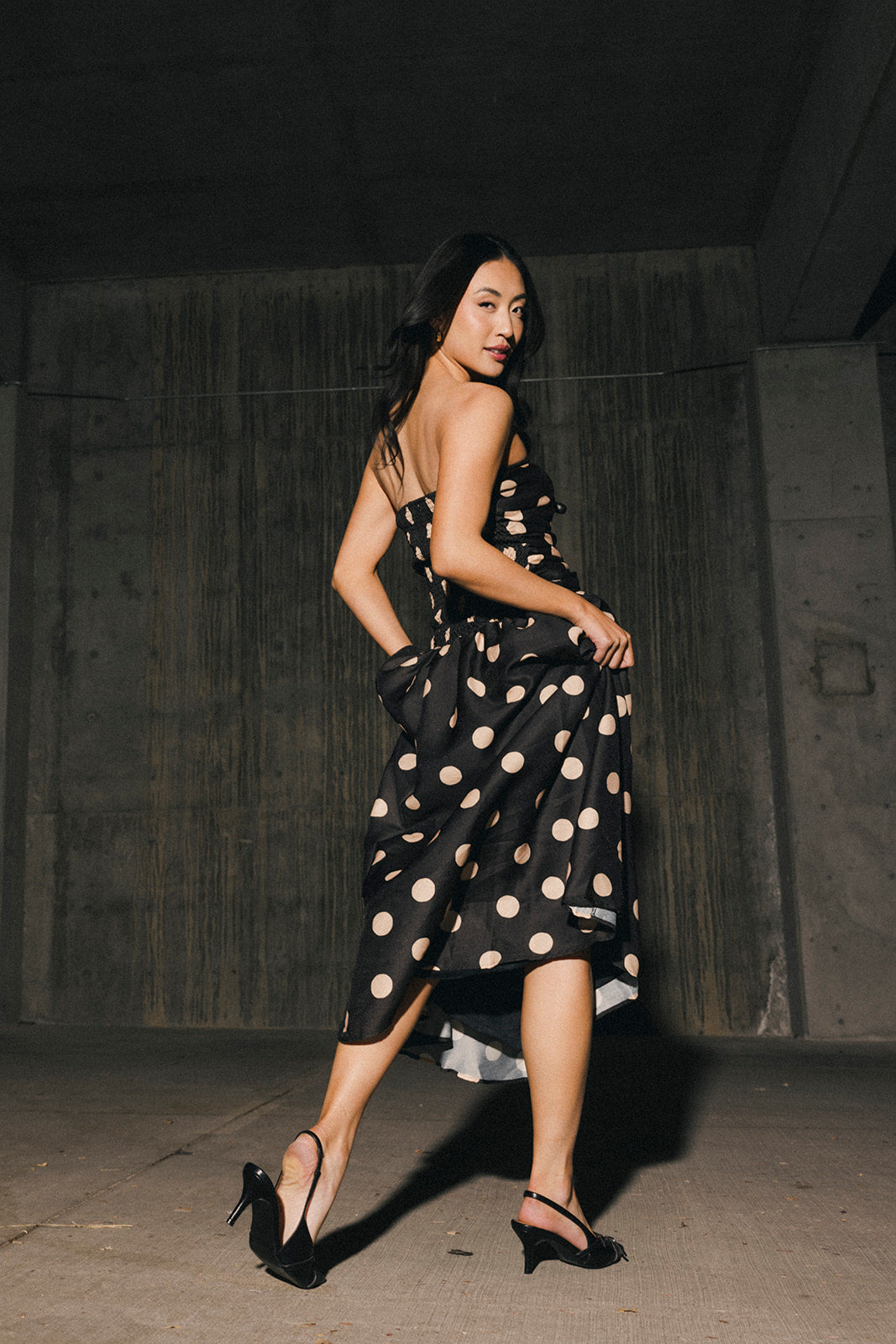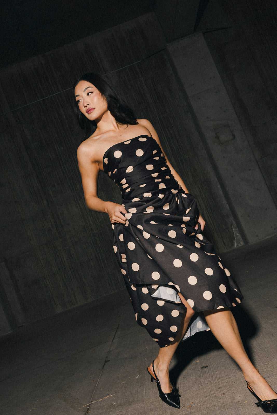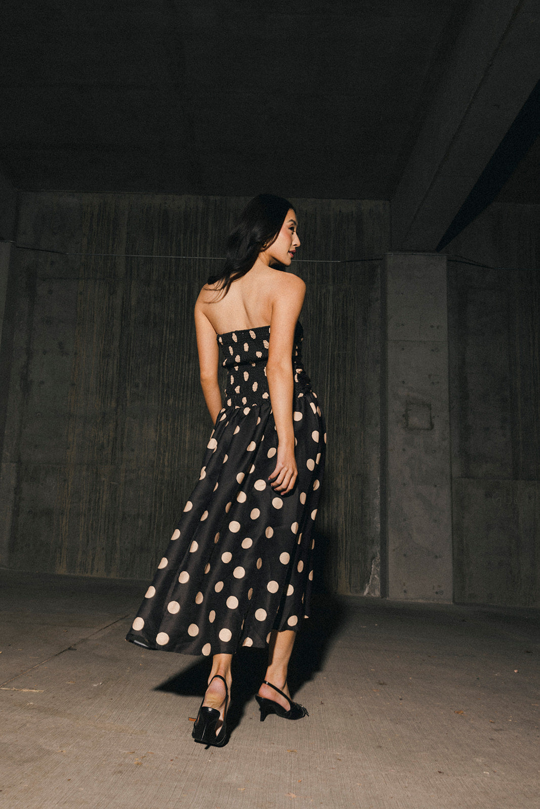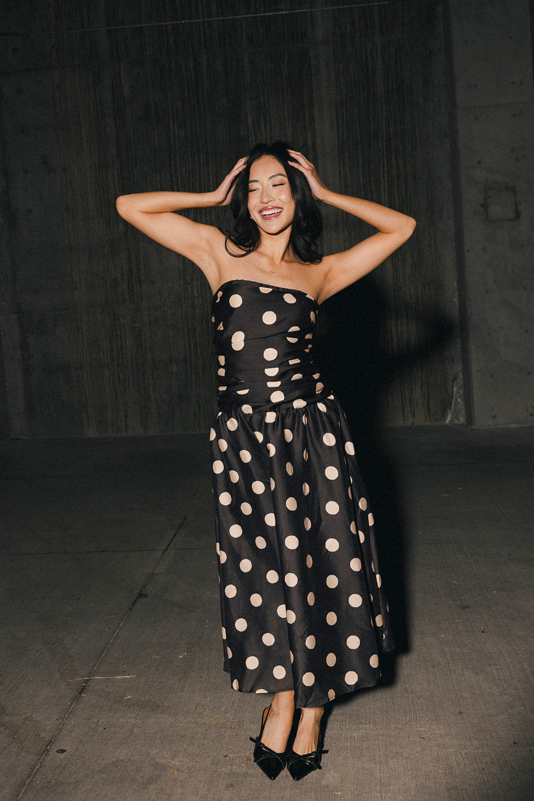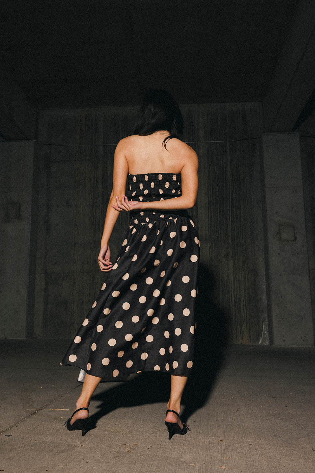 Celebrate the season in effortless elegance with the Brittany Polka Dot Midi Dress. This strapless midi silhouette features a timeless polka dot pattern on a sleek black background, making it the perfect choice for holiday gatherings and special occasions. The supportive strapless design keeps you comfortable all night long, while the midi length offers a sophisticated, flattering fit. Whether you're heading to a festive party or an intimate dinner, this versatile piece transitions beautifully from day to evening wear. Dress it up with heels and statement jewelry for maximum impact.