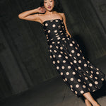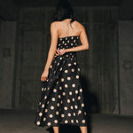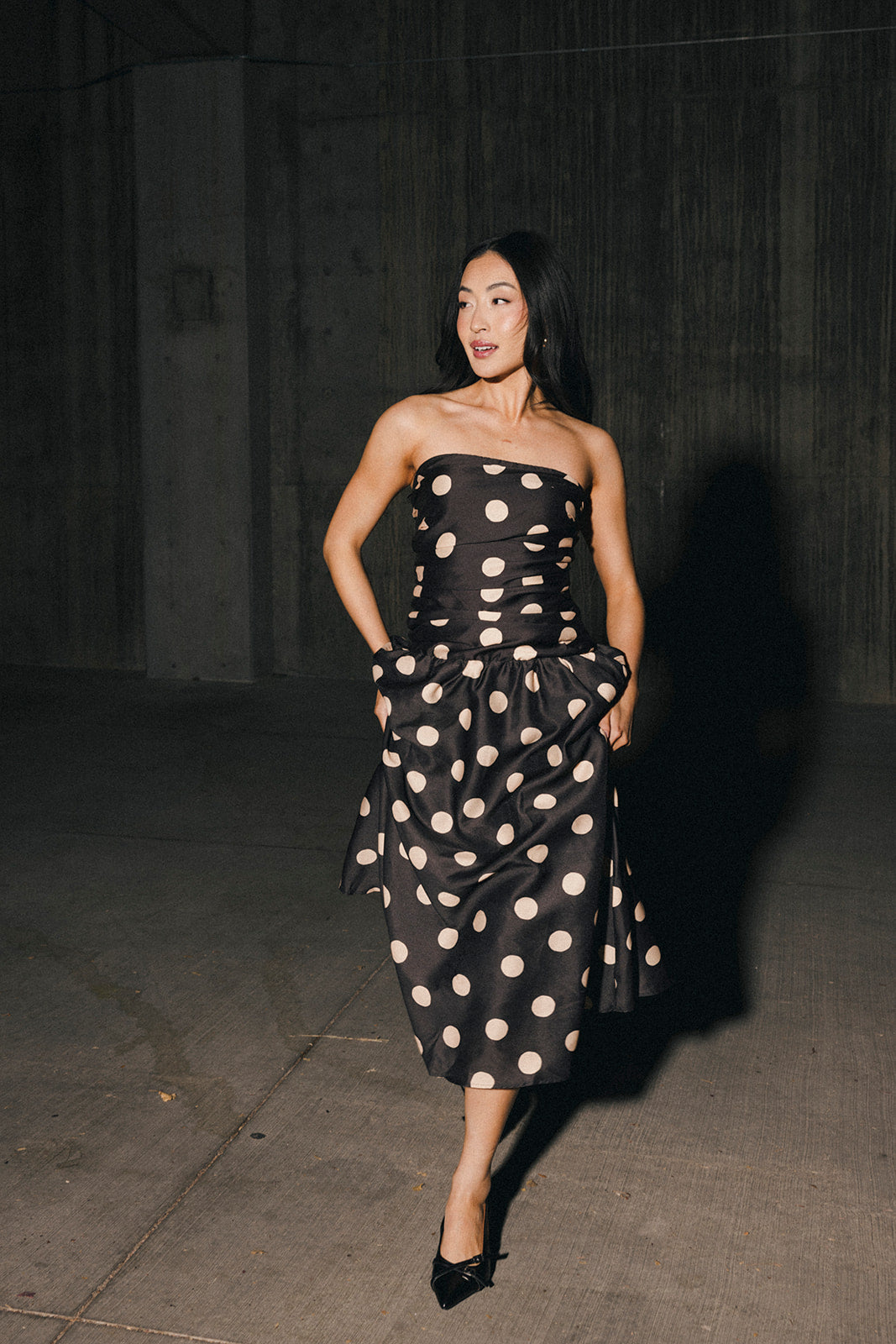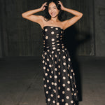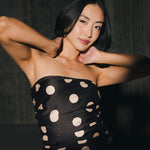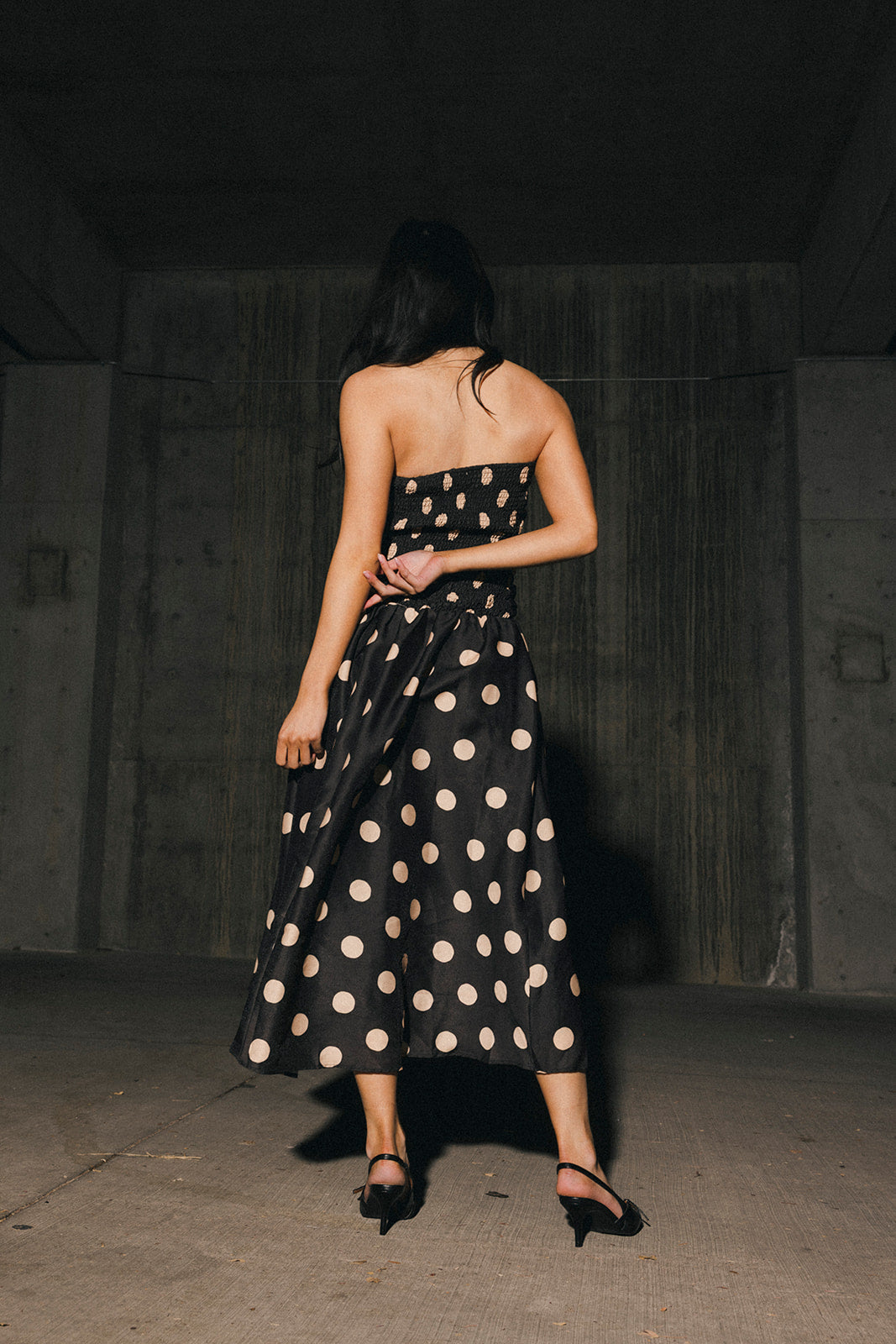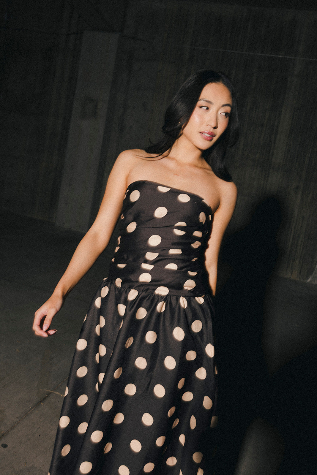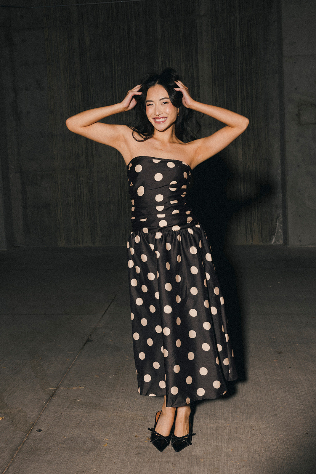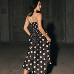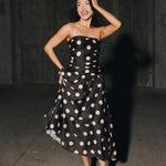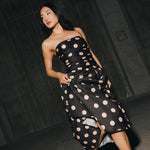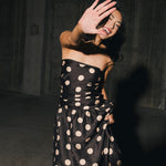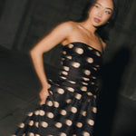 Celebrate the season in effortless elegance with the Brittany Polka Dot Midi Dress. This strapless midi silhouette features a timeless polka dot pattern on a sleek black background, making it the perfect choice for holiday gatherings and special occasions. The supportive strapless design keeps you comfortable all night long, while the midi length offers a sophisticated, flattering fit. Whether you're heading to a festive party or an intimate dinner, this versatile piece transitions beautifully from day to evening wear. Dress it up with heels and statement jewelry for maximum impact.