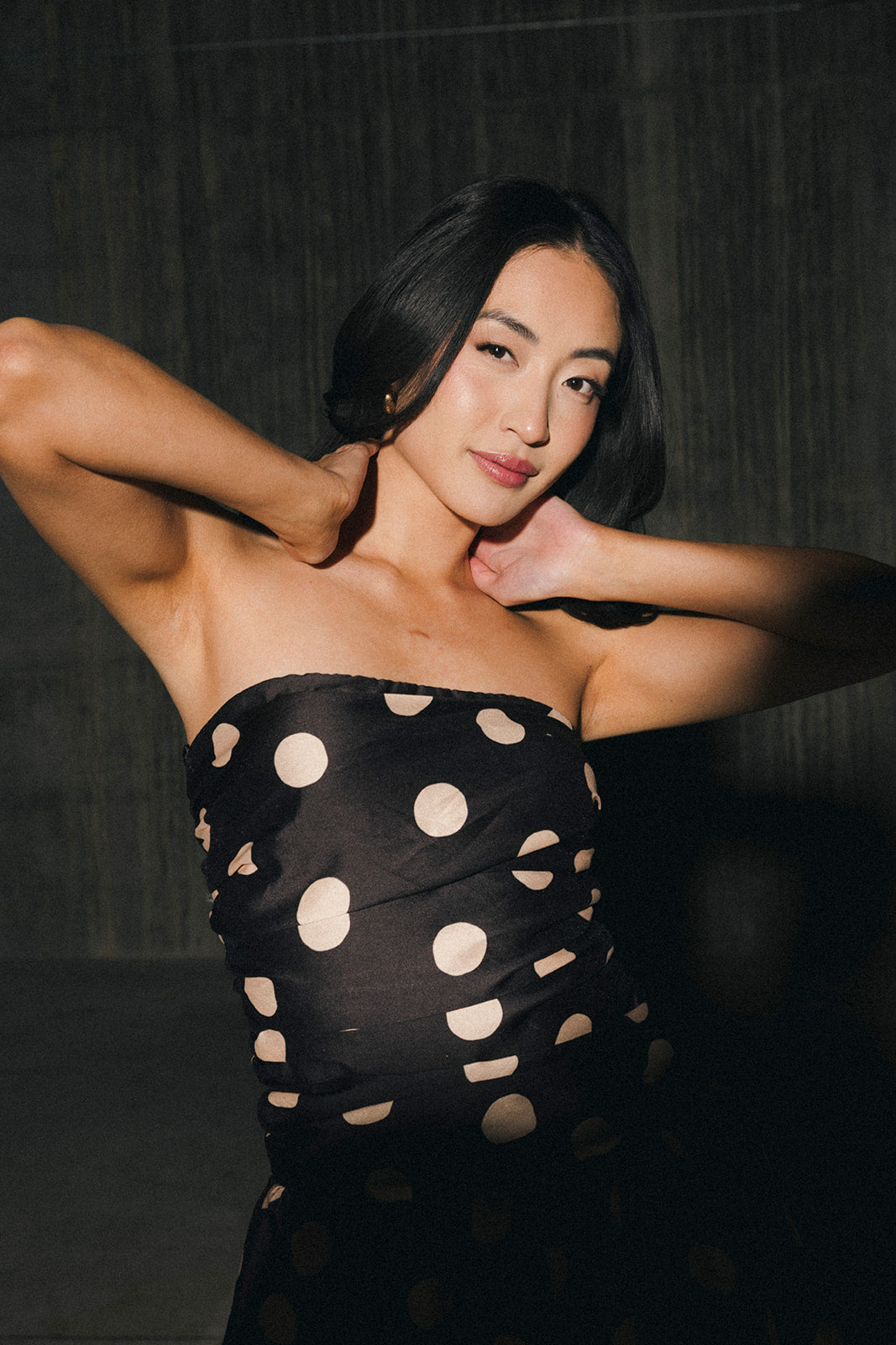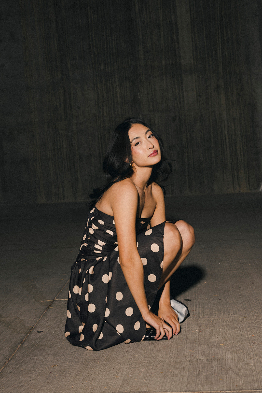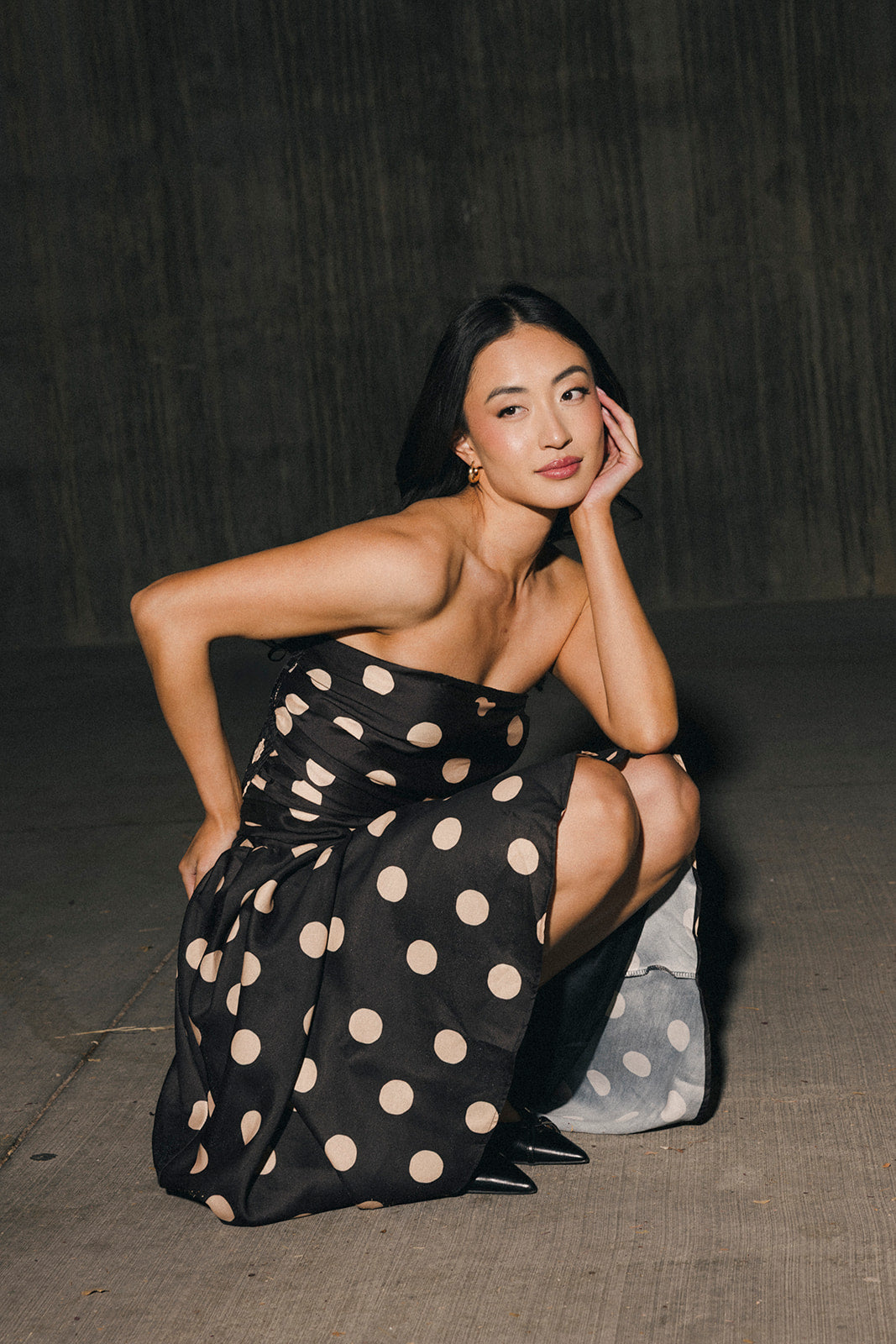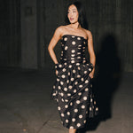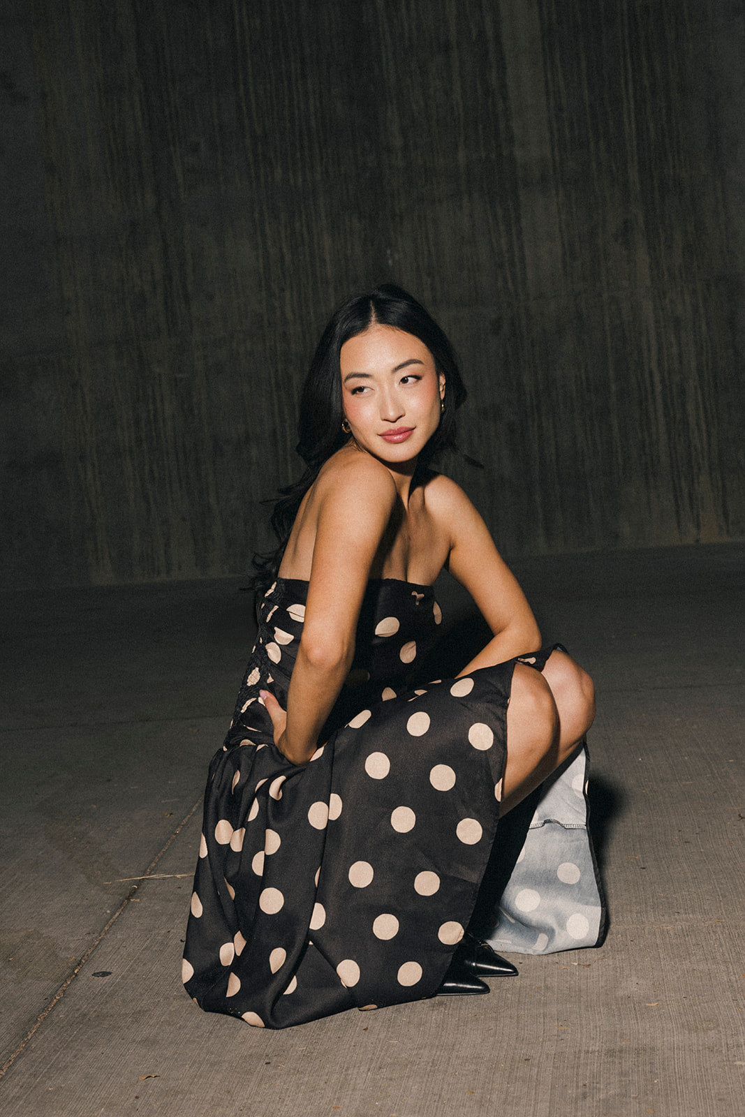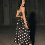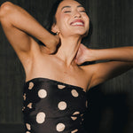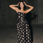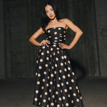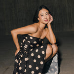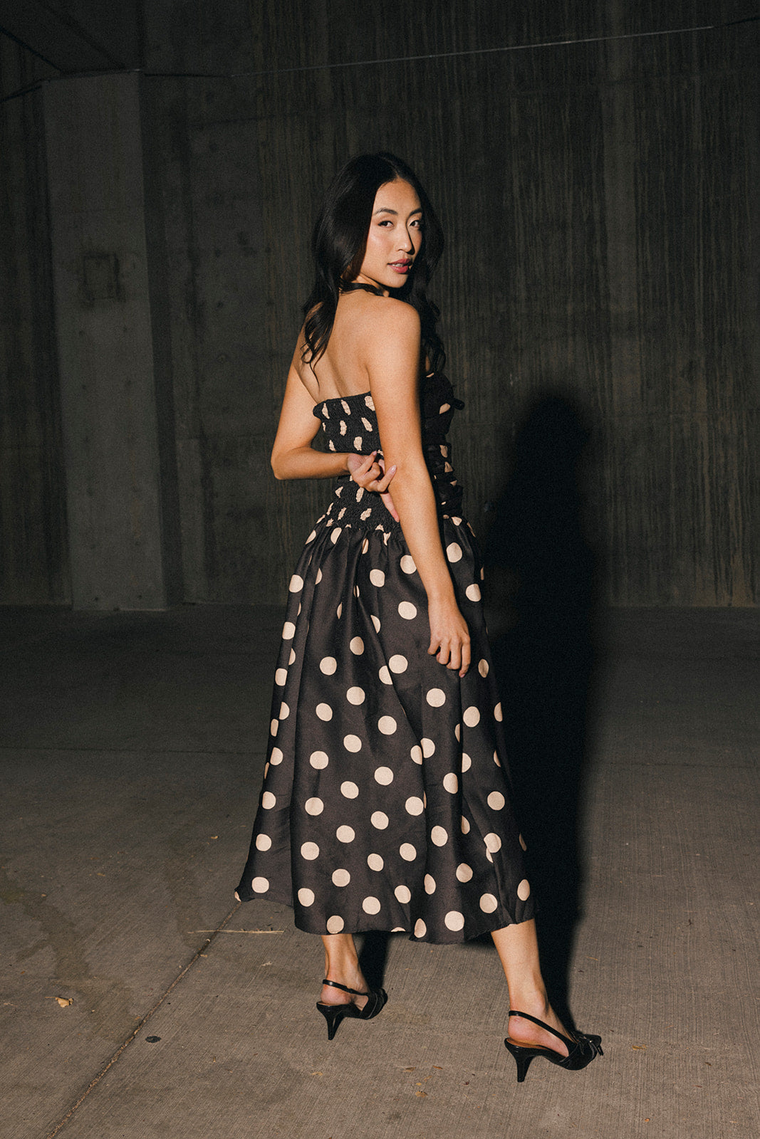 Celebrate the season in effortless elegance with the Brittany Polka Dot Midi Dress. This strapless midi silhouette features a timeless polka dot pattern on a sleek black background, making it the perfect choice for holiday gatherings and special occasions. The supportive strapless design keeps you comfortable all night long, while the midi length offers a sophisticated, flattering fit. Whether you're heading to a festive party or an intimate dinner, this versatile piece transitions beautifully from day to evening wear. Dress it up with heels and statement jewelry for maximum impact.