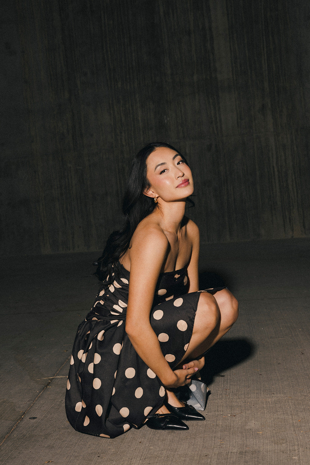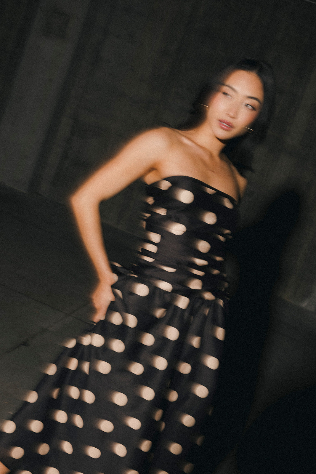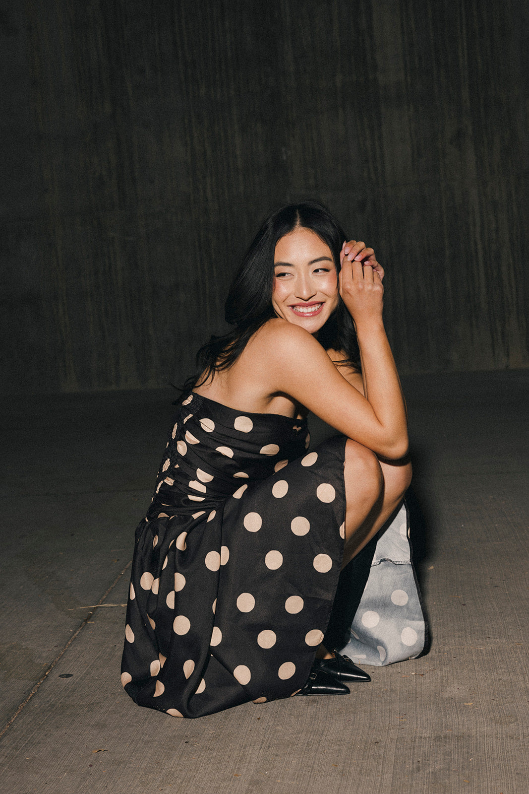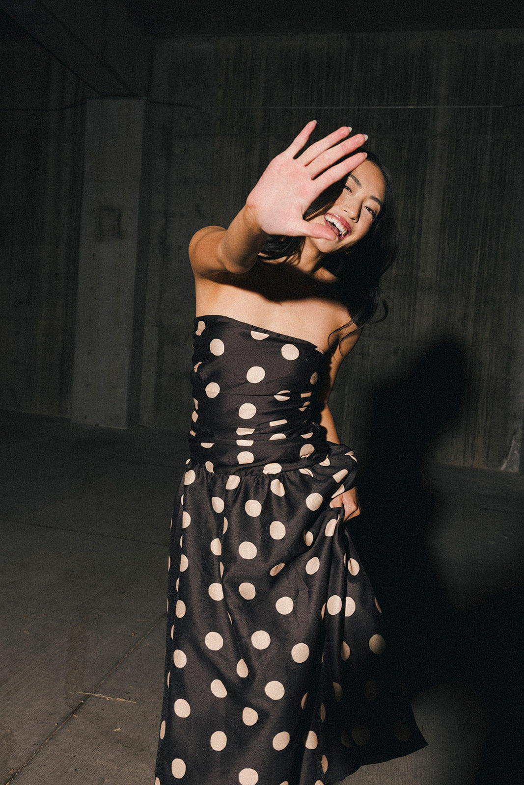 Celebrate the season in effortless elegance with the Brittany Polka Dot Midi Dress. This strapless midi silhouette features a timeless polka dot pattern on a sleek black background, making it the perfect choice for holiday gatherings and special occasions. The supportive strapless design keeps you comfortable all night long, while the midi length offers a sophisticated, flattering fit. Whether you're heading to a festive party or an intimate dinner, this versatile piece transitions beautifully from day to evening wear. Dress it up with heels and statement jewelry for maximum impact.