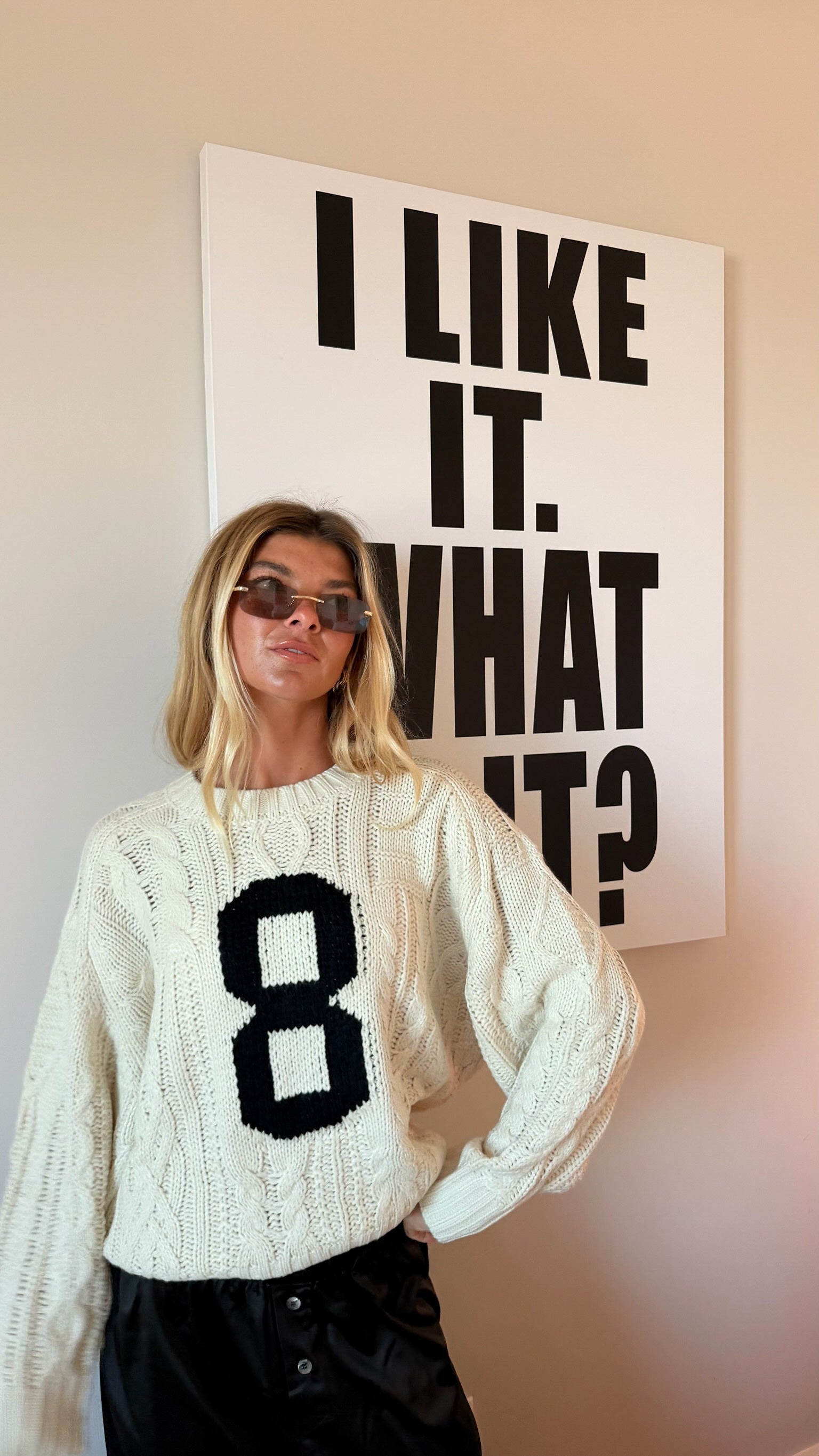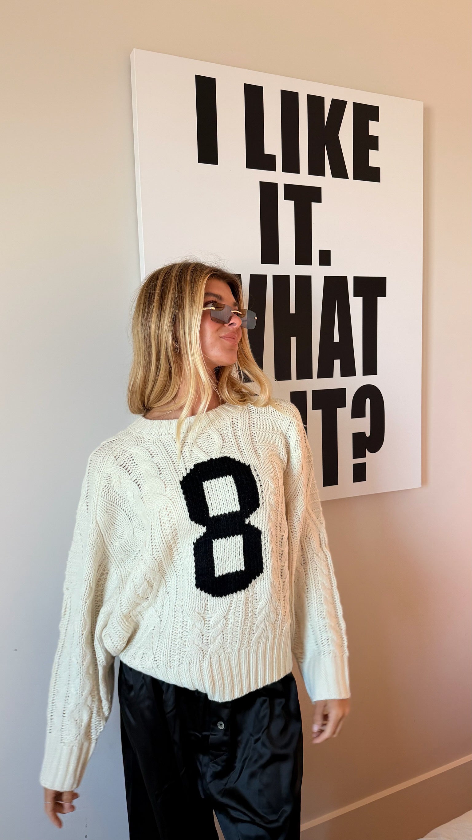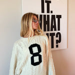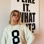 Cozy up in this ivory cable knit sweater, featuring a bold intarsia number "8" on the front for a sporty, playful vibe. The classic cable knit texture provides warmth and timeless style, while the eye-catching numeral adds personality to your everyday wardrobe. Perfect for layering or wearing solo, this versatile piece transitions seamlessly from casual outings to relaxed weekends. Embrace comfort without compromising on style.