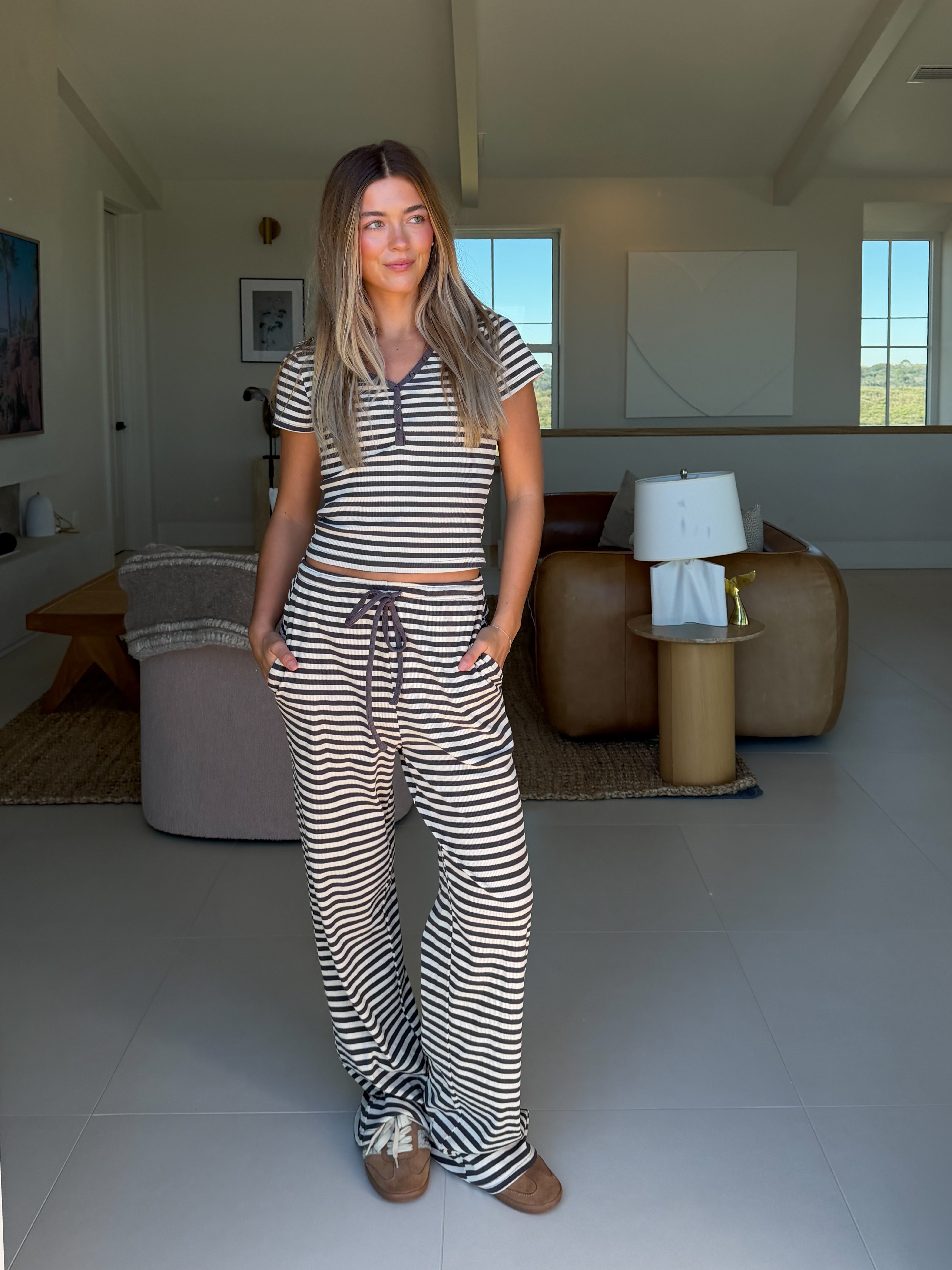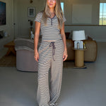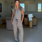 Charlie Striped Knit Pants - Charcoal Elevate your everyday comfort with these beautifully striped knit pants in a calming blue jay hue. Crafted from soft, breathable fabric, they feature a convenient drawstring waist for a customizable fit that moves with you throughout your day. The classic striped pattern adds visual interest while remaining versatile enough to pair with virtually any top in your wardrobe. Perfect for relaxed weekends, work-from-home days, or casual outings, these pants deliver the cozy feel you deserve without compromising on style. A wardrobe essential that supports both comfort and confidence.