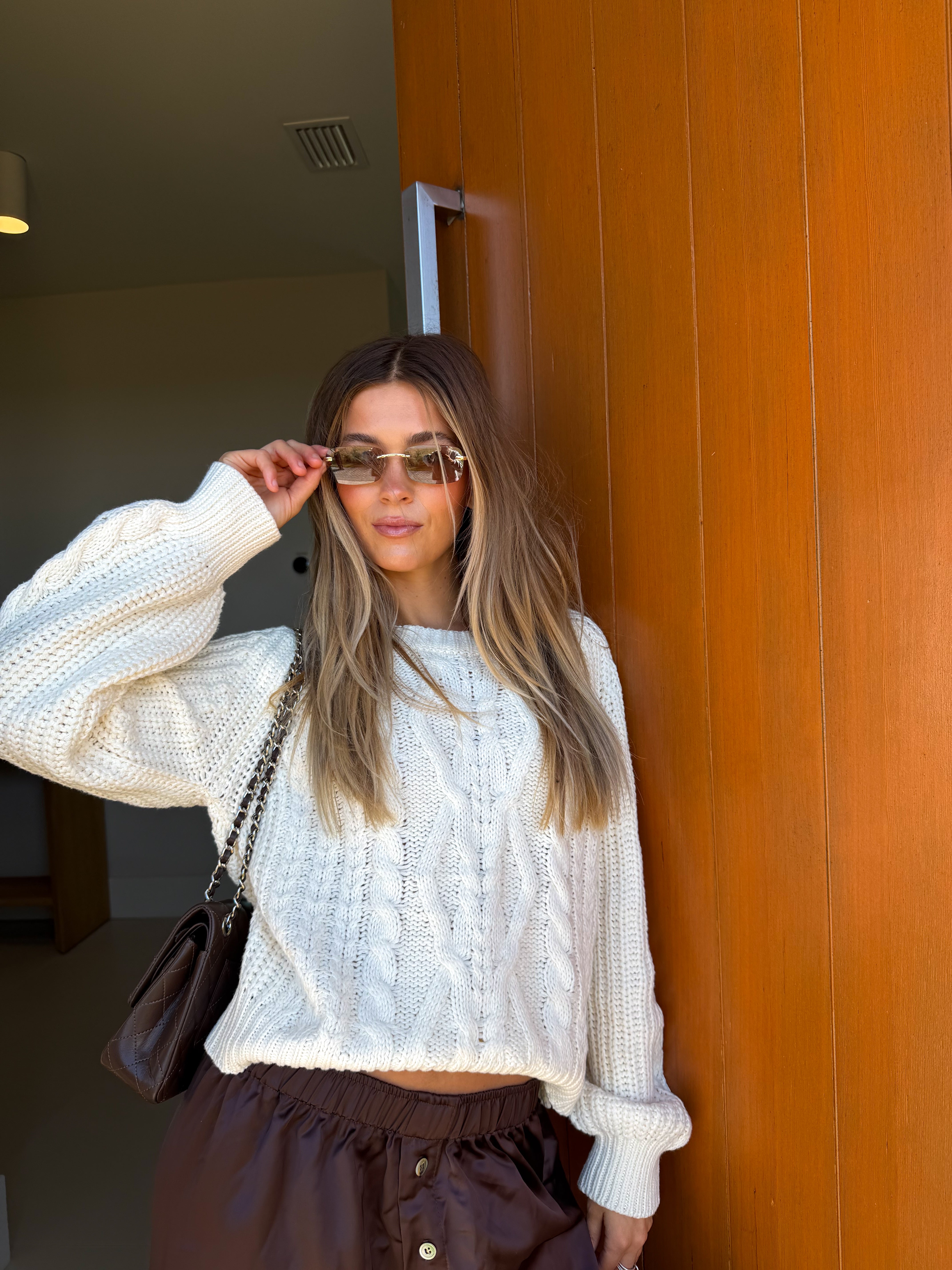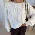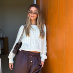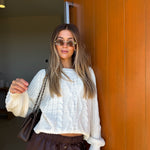 Elevate your everyday style with the Connie Cable Knit Sweater in a timeless cream shade. This cropped silhouette features intricate cable braid crochet detailing that adds texture and visual interest to any outfit. The cozy knit construction provides warmth without bulk, making it perfect for layering or wearing solo. Whether you're dressing up for a night out or keeping it casual, this versatile sweater top works beautifully with jeans, skirts, or tailored trousers. Embrace comfort and sophistication in one piece.