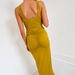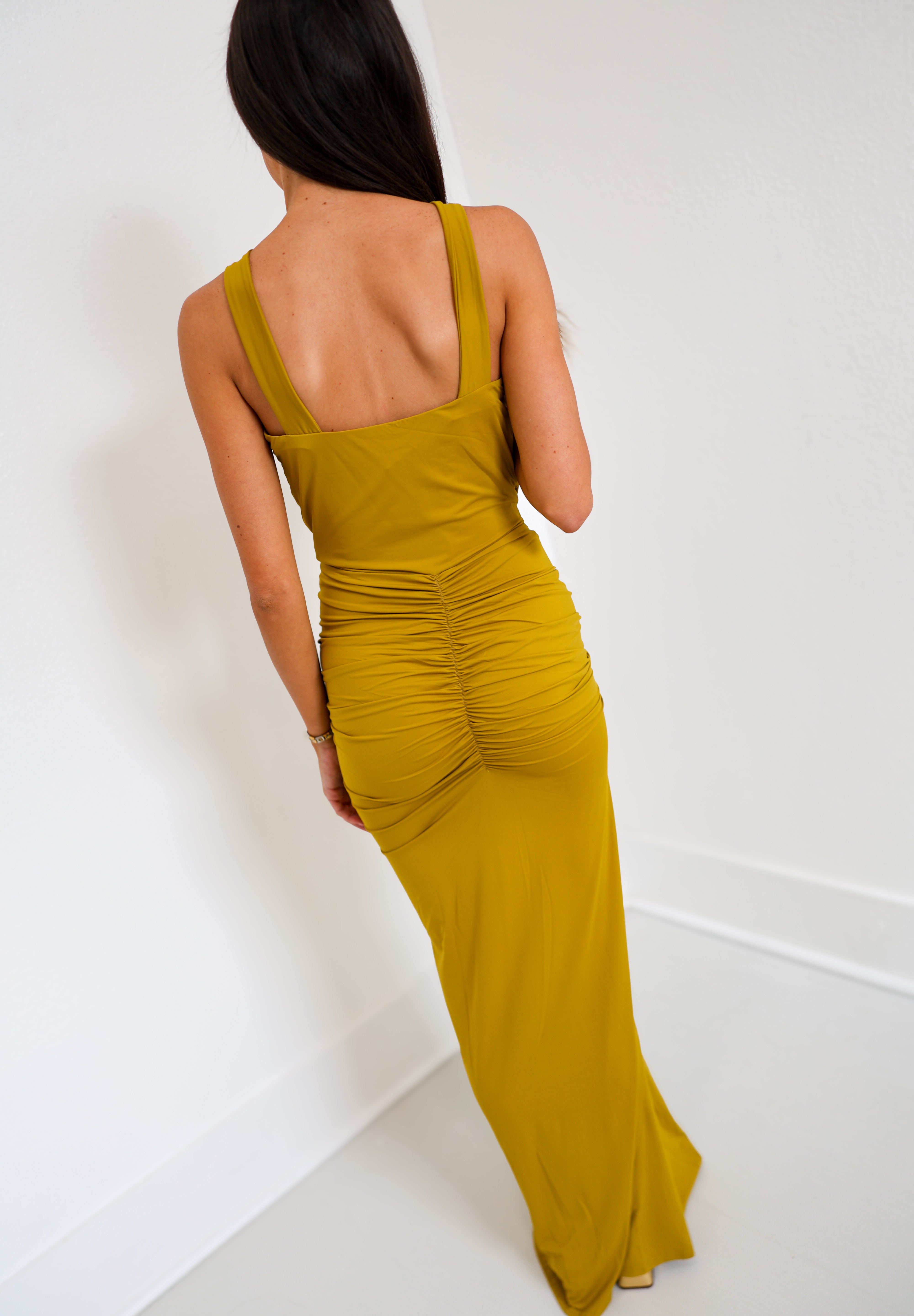 This maxi dress features a graceful neck line and elegant drape design, accented by a refined gold trim that adds a touch of sophistication. Its flowing silhouette ensures comfort and ease, making it perfect for both formal occasions and stylish everyday wear. The timeless details promise a flattering fit that enhances your natural elegance.