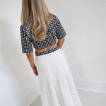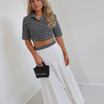The Delaney Double Layer Pleated Maxi Skirt in White and black Gingham offers a charming, layered design that adds depth and movement to your look. Its soft pleats create a graceful silhouette, while the light, breathable fabric ensures comfort throughout the day. Perfect for casual outings or special occasions, this skirt combines style and ease, helping you feel confident and effortlessly chic.
