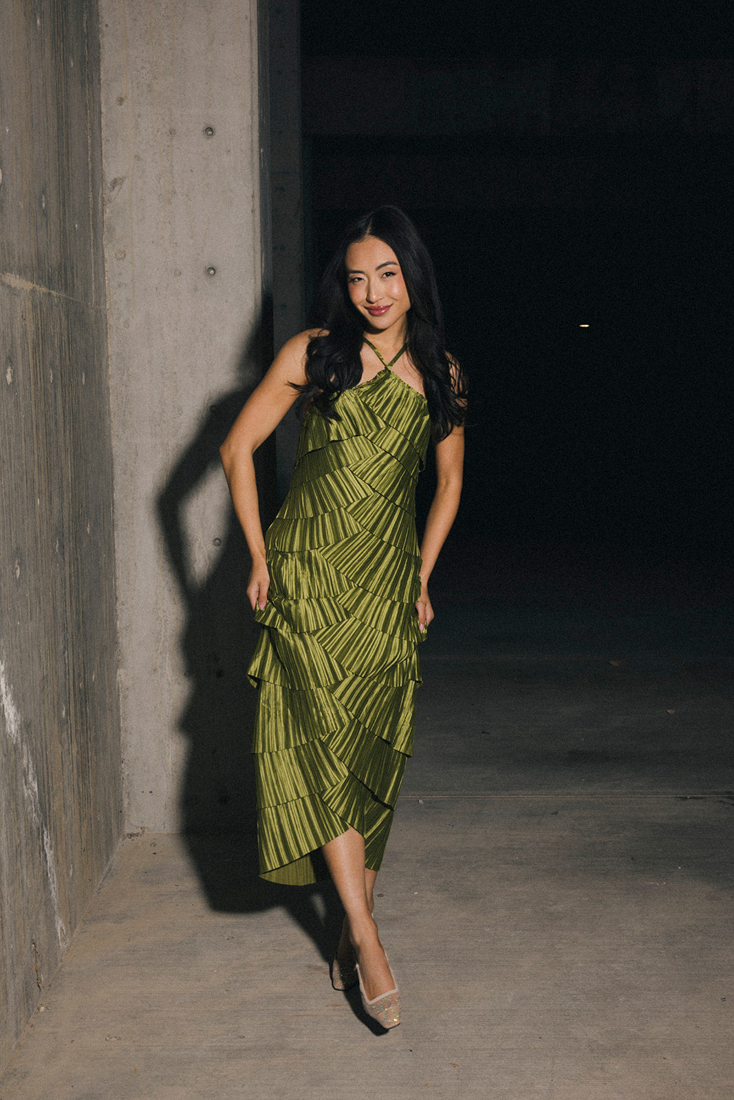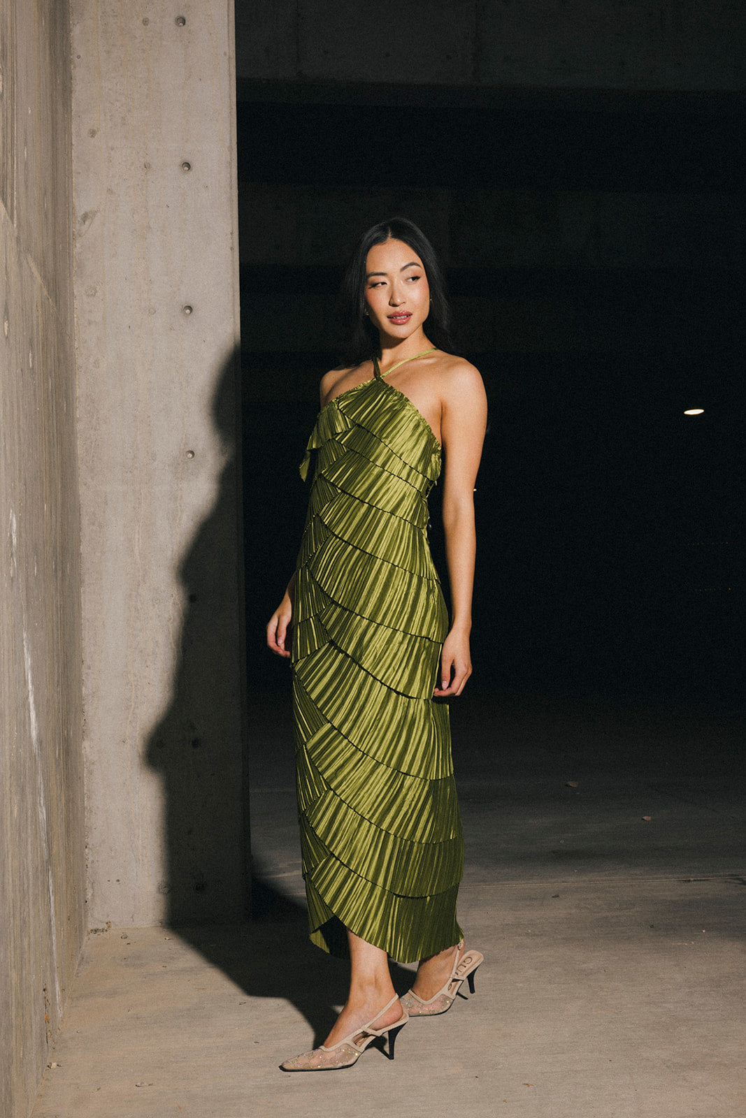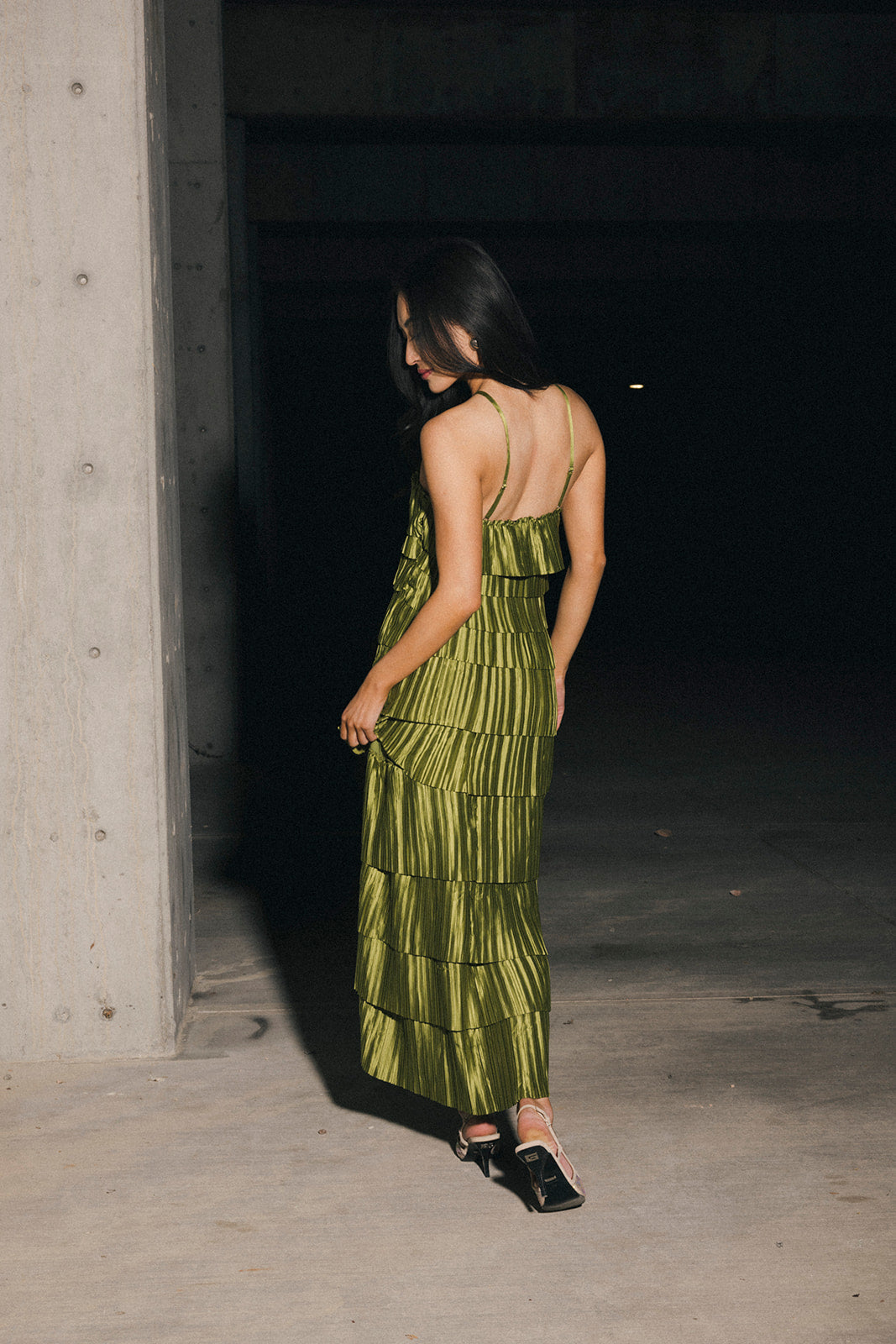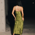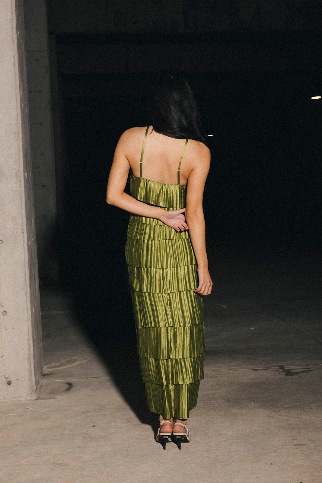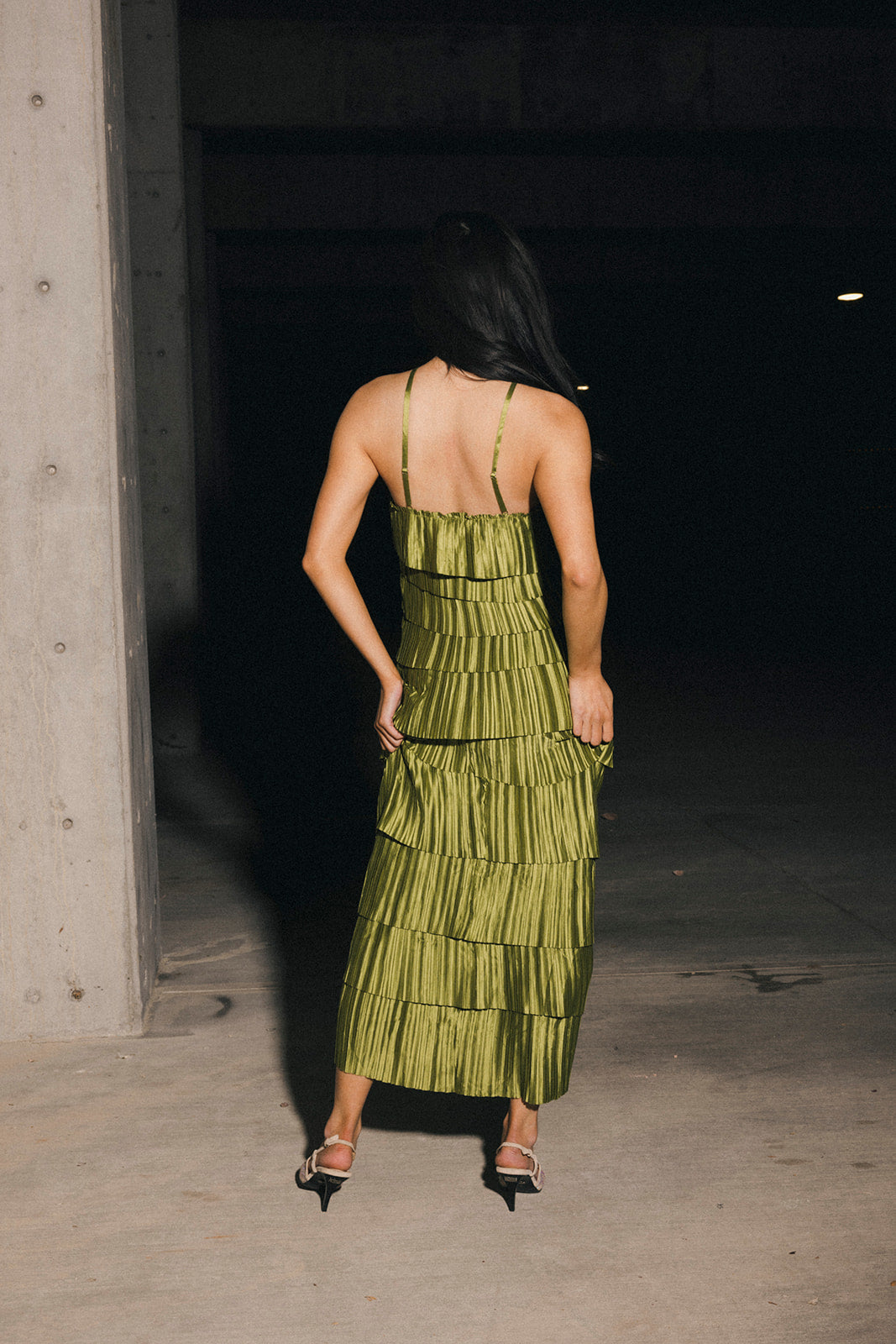 Demi Pleated Satin Tiered Midi Dress - Forest Green