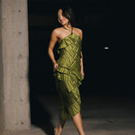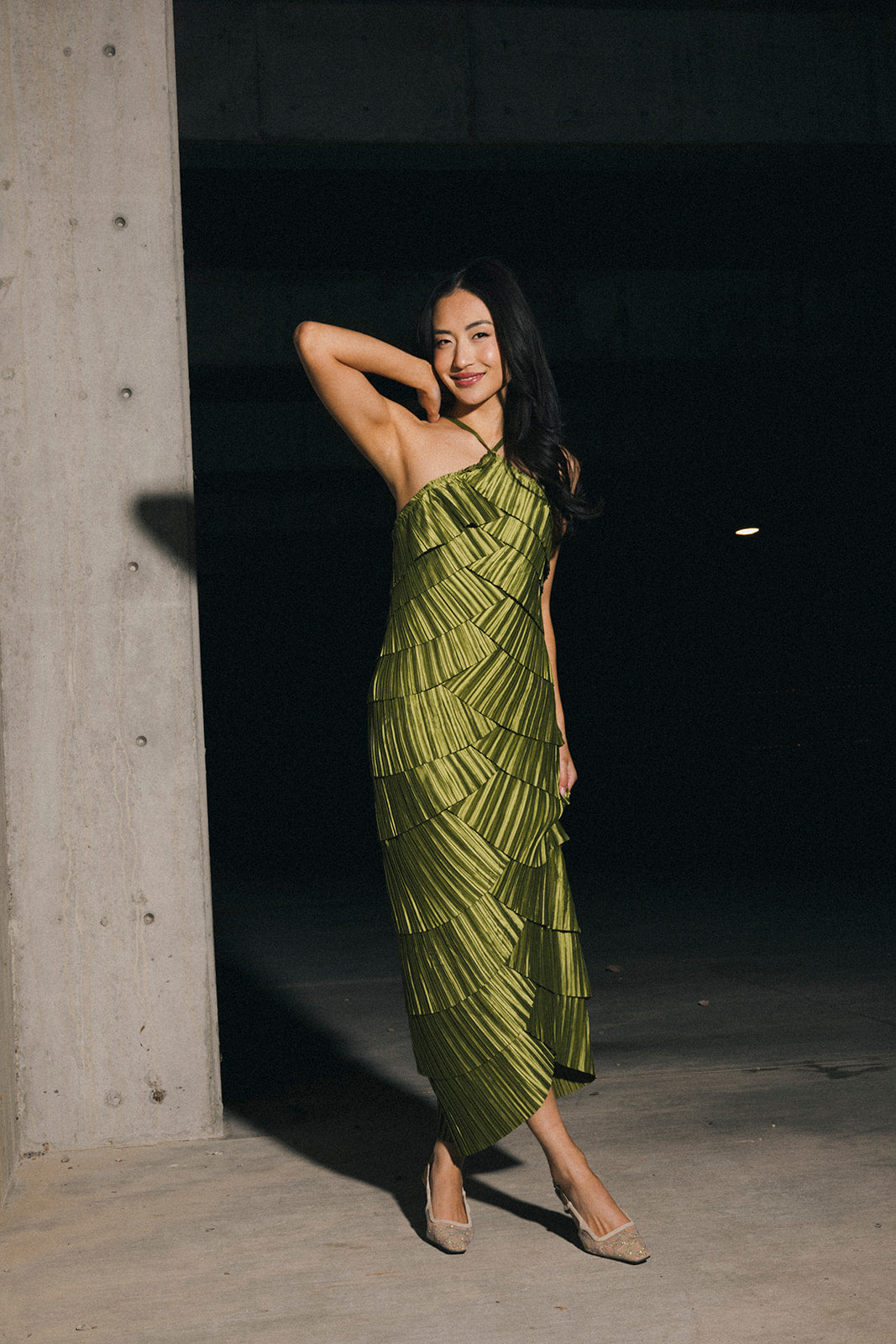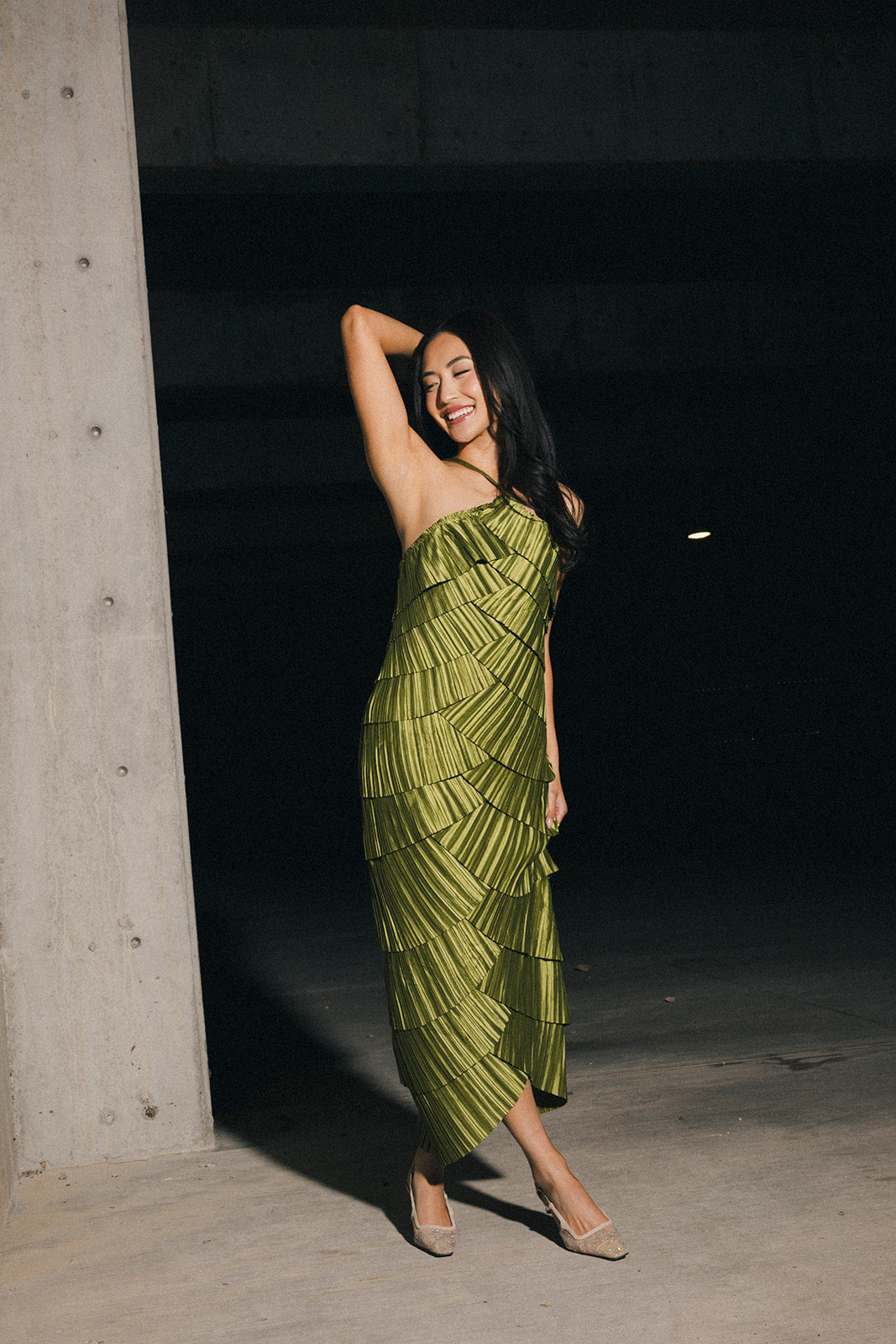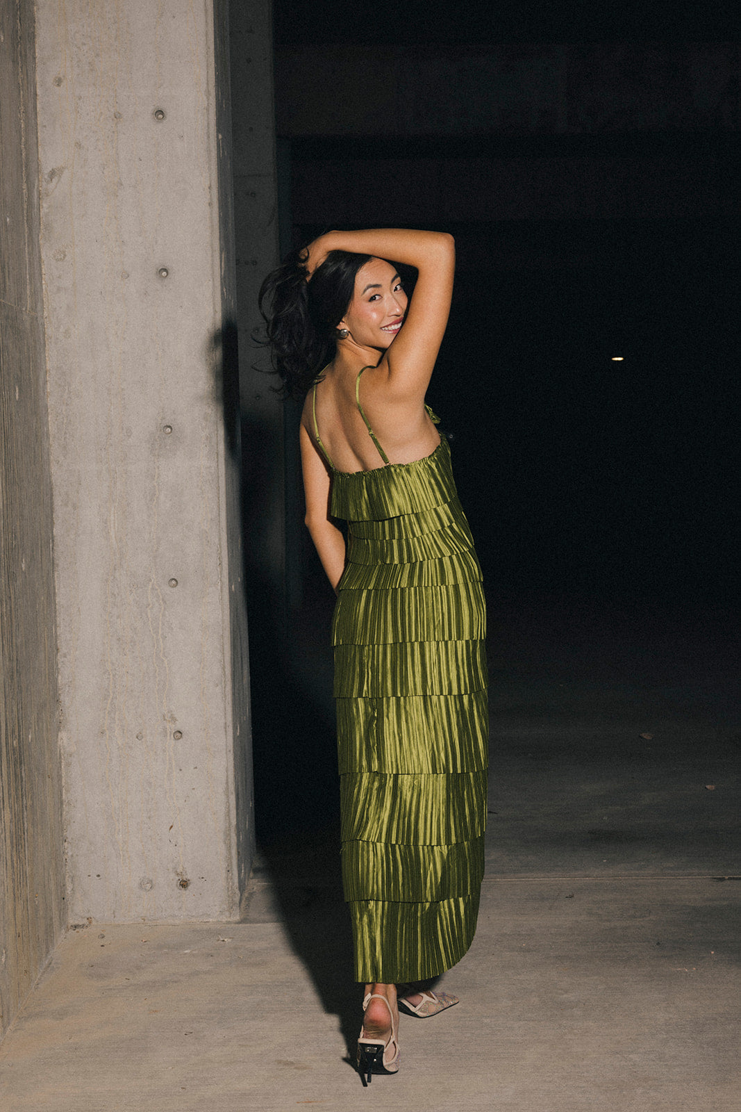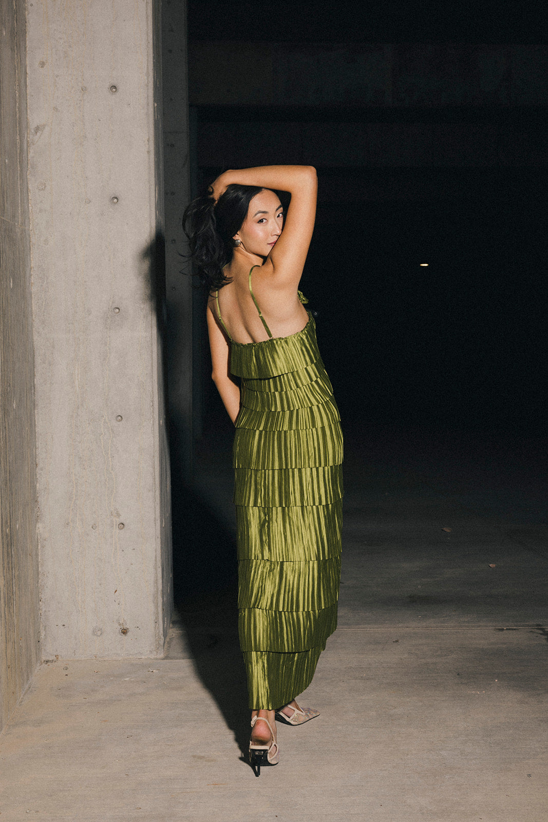 Demi Pleated Satin Tiered Midi Dress - Forest Green