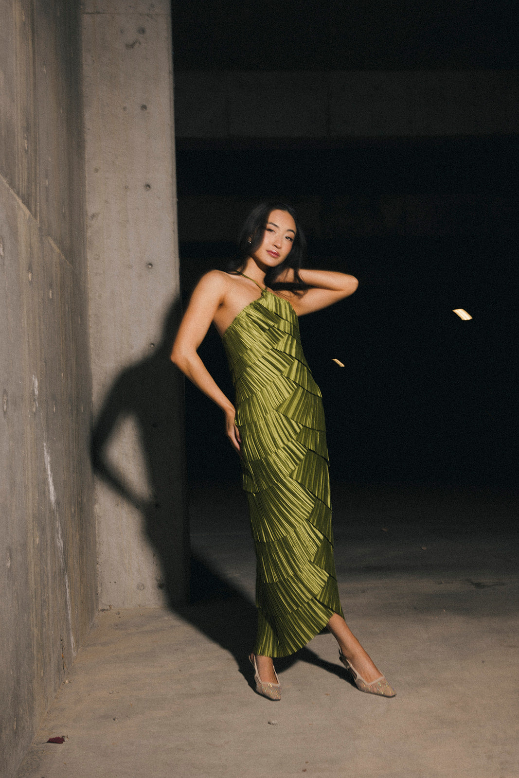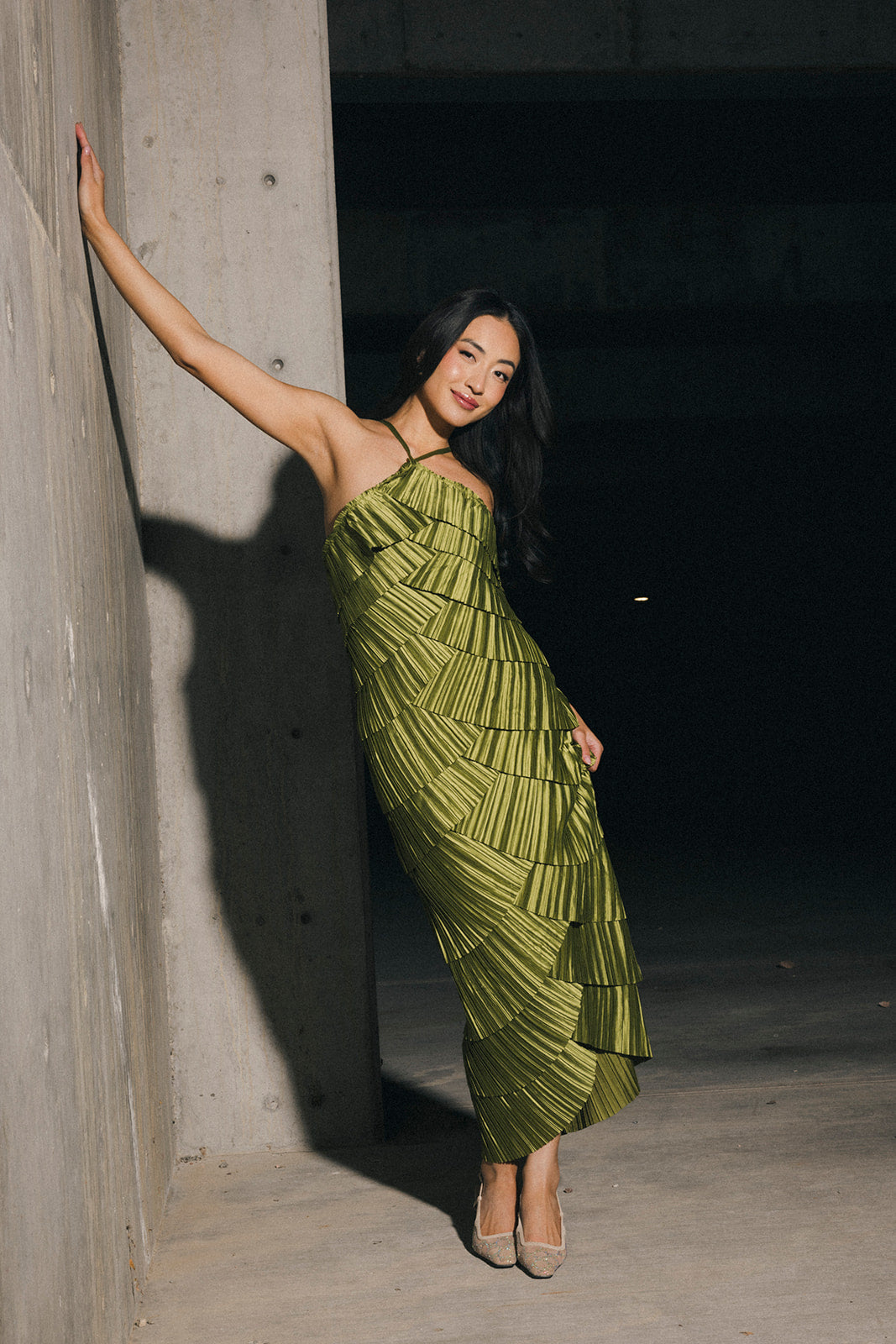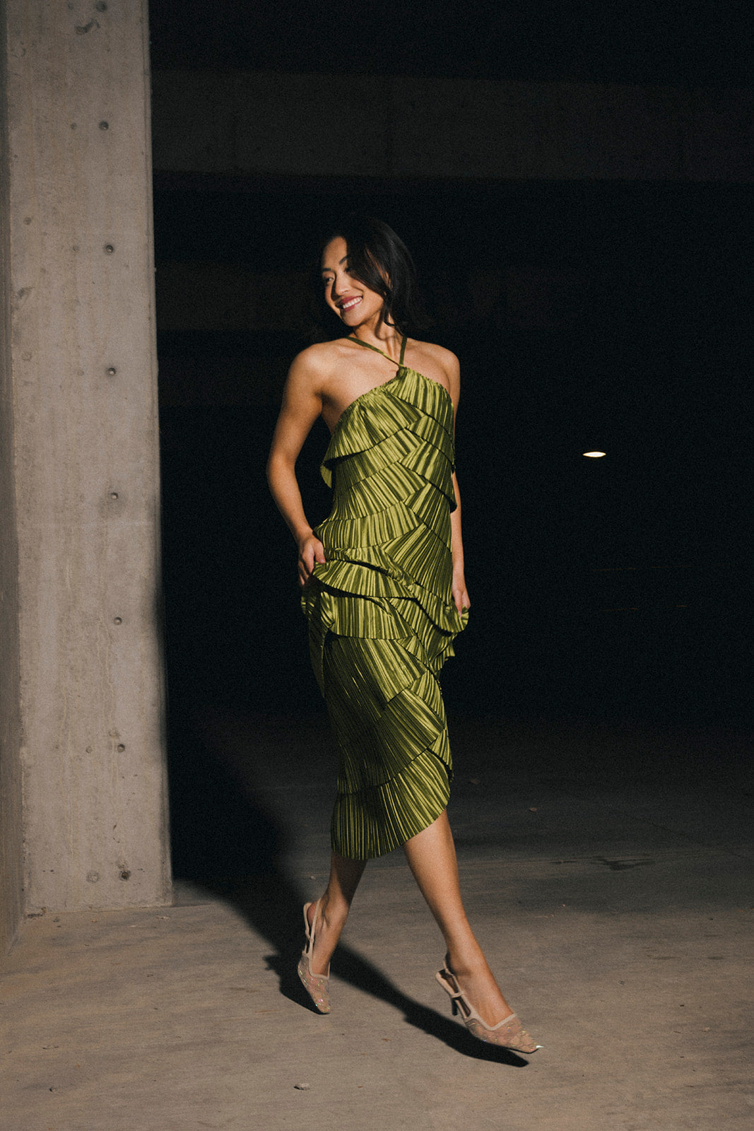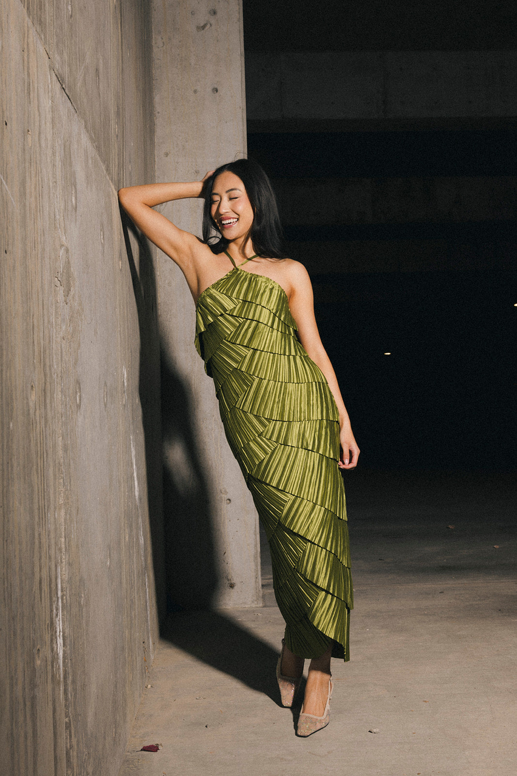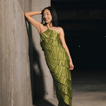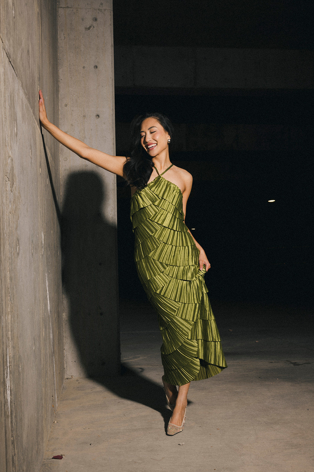 Demi Pleated Satin Tiered Midi Dress - Forest Green
