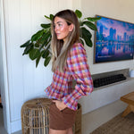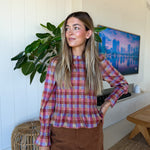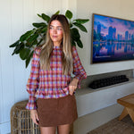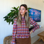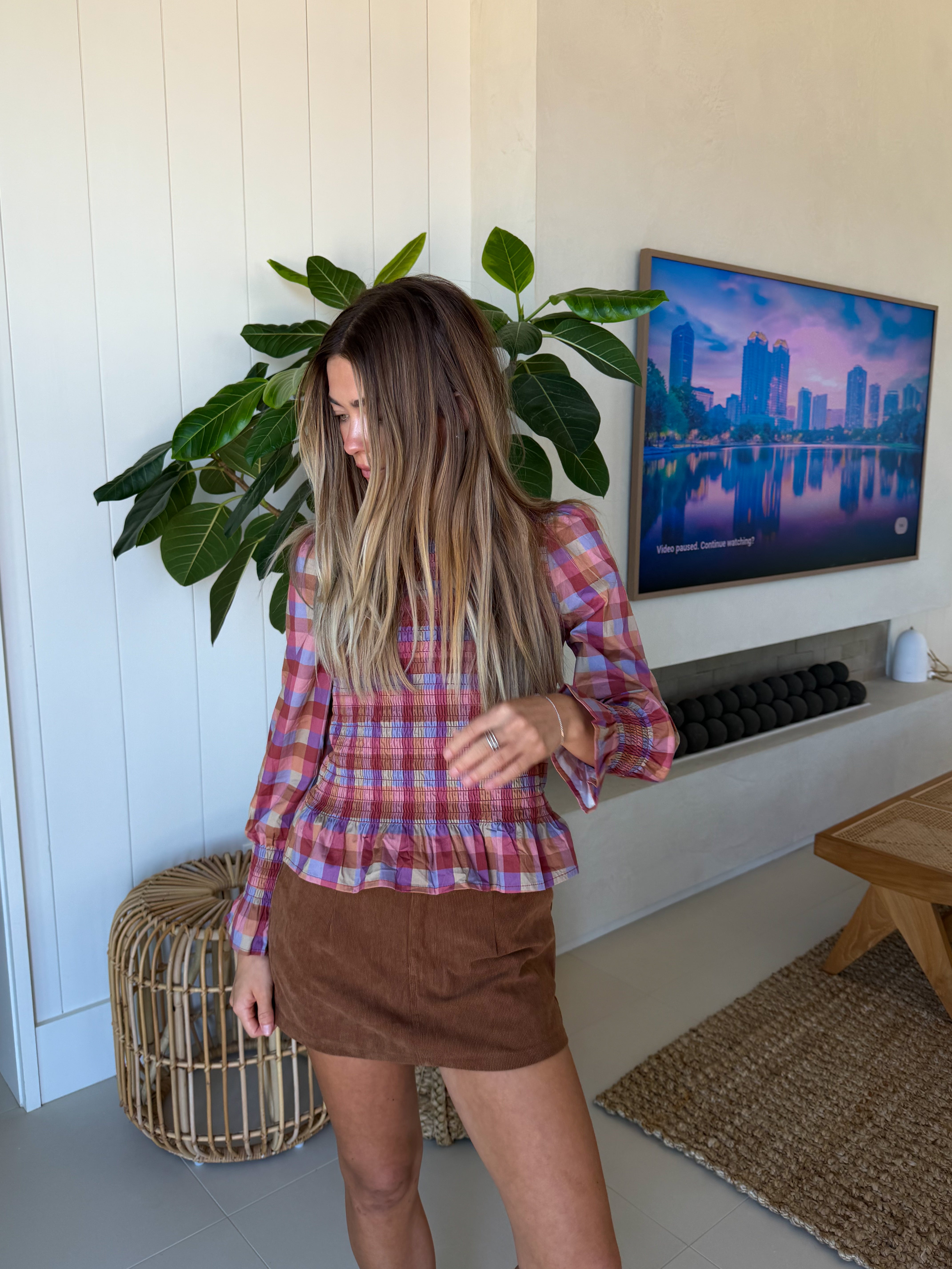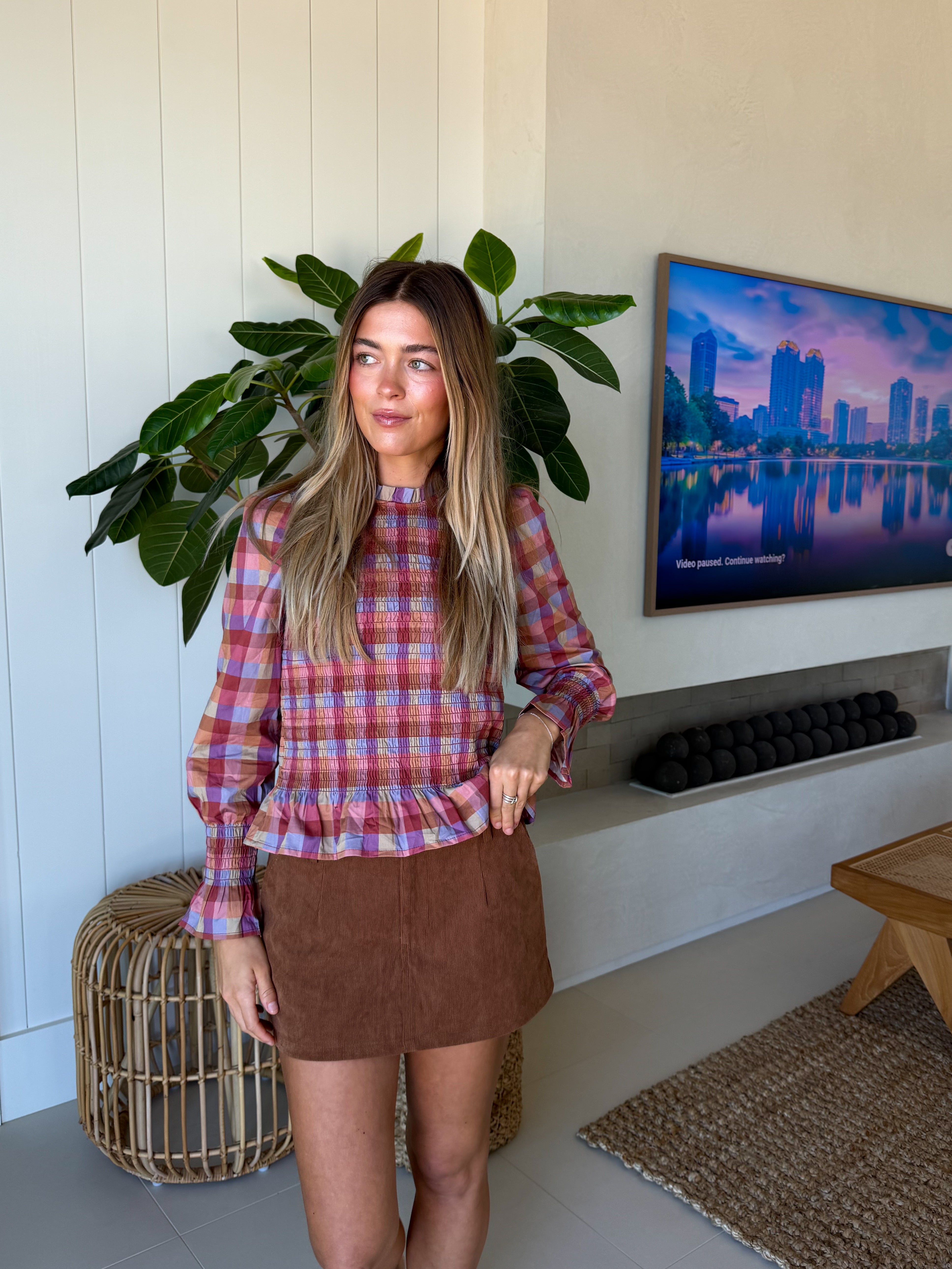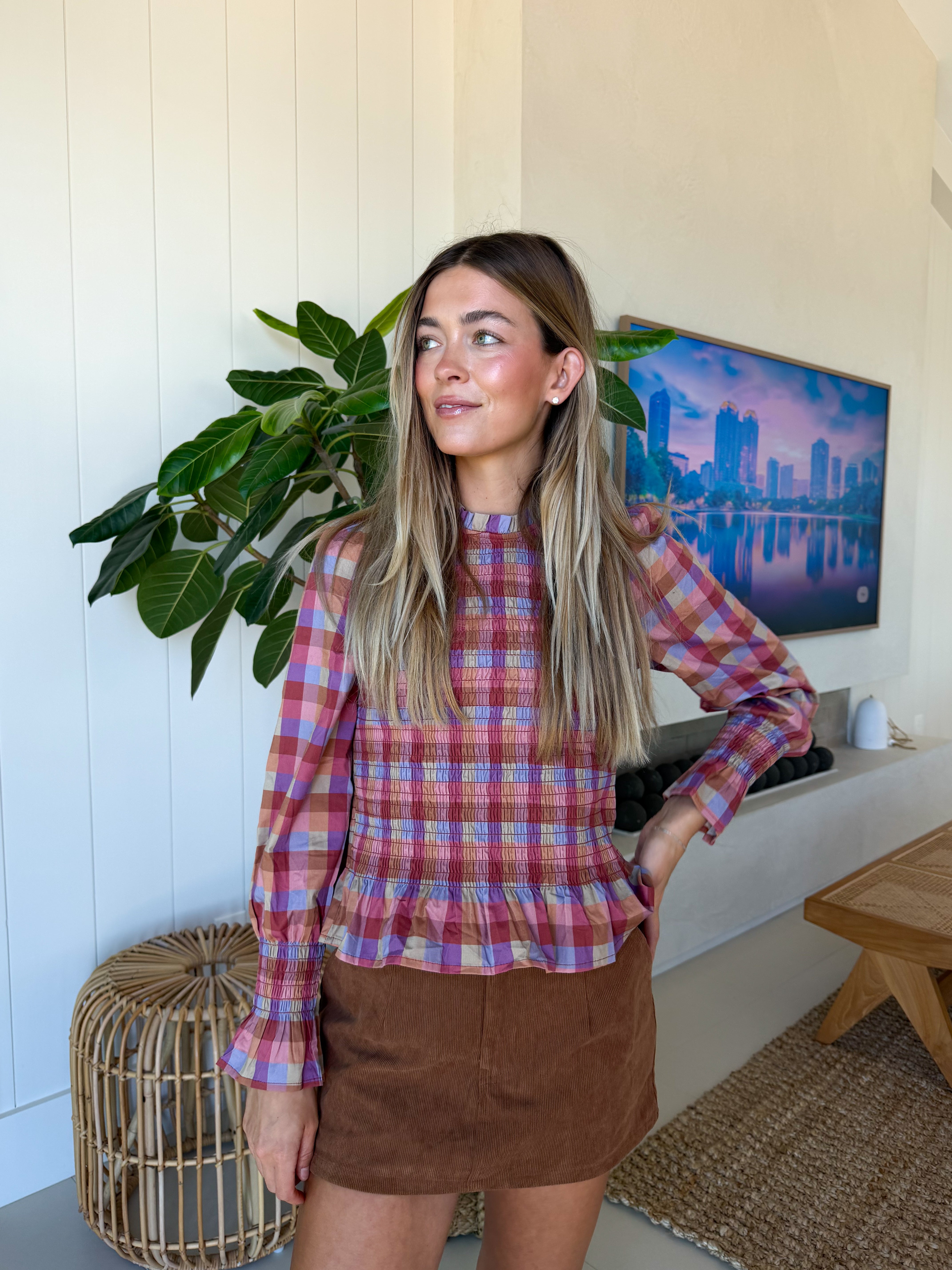 Elevate your wardrobe with the Emely Gingham Smocked Top, a charming piece that celebrates timeless style. This thoughtfully designed top features a classic checkered pattern in rich shades of blue, burgundy, and lilac that work beautifully together. Delicate ruffles frame the neckline and hem, while coordinating ruffle details at the cuffs add a touch of feminine elegance. The smocked construction provides comfortable, flattering wear for any occasion. Whether you're dressing up for a special event or keeping things casual, this versatile top brings effortless sophistication to your everyday looks.