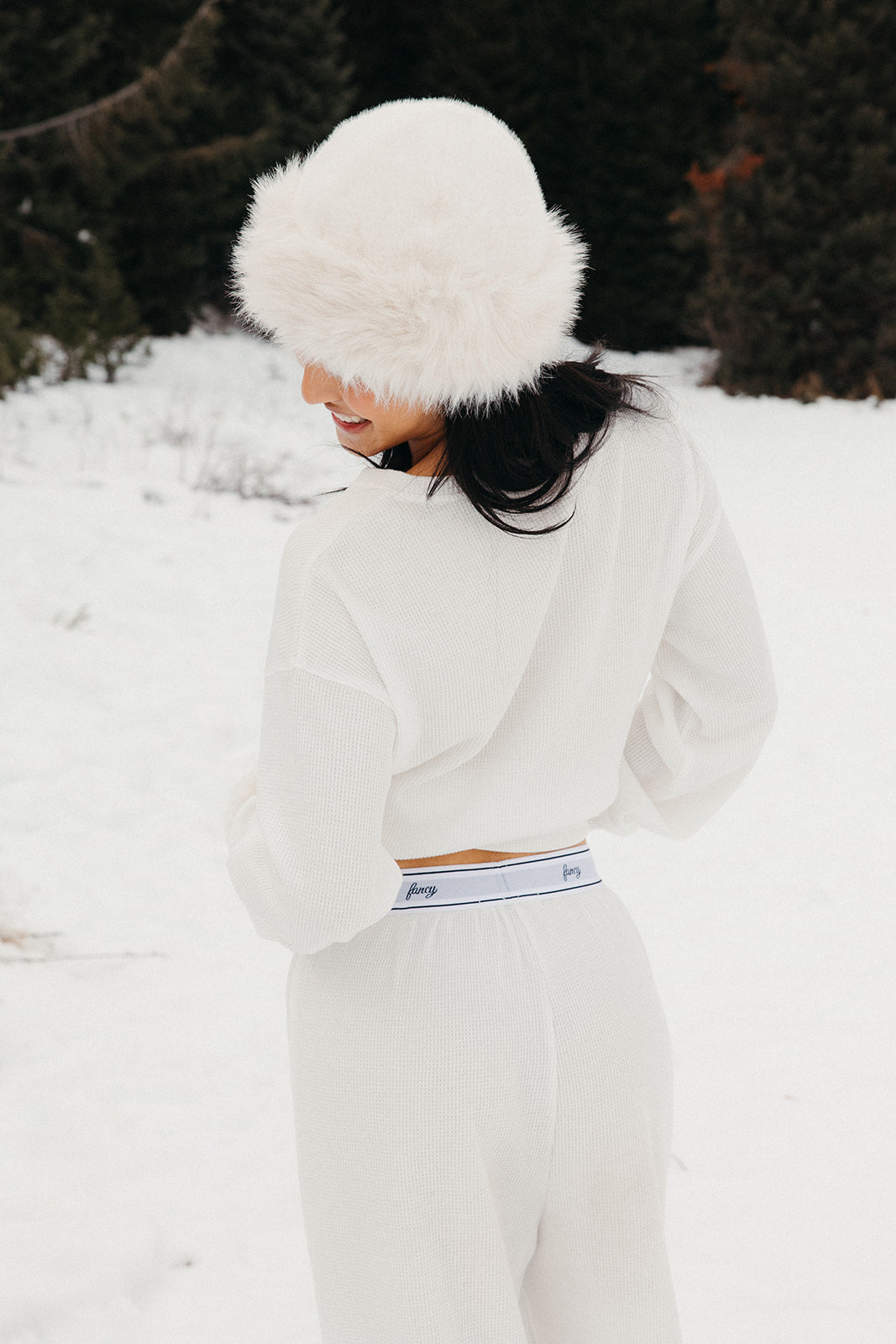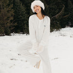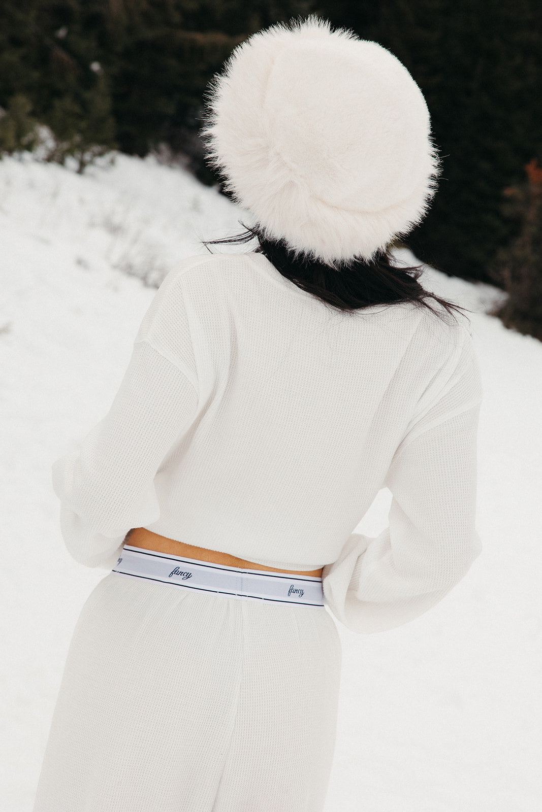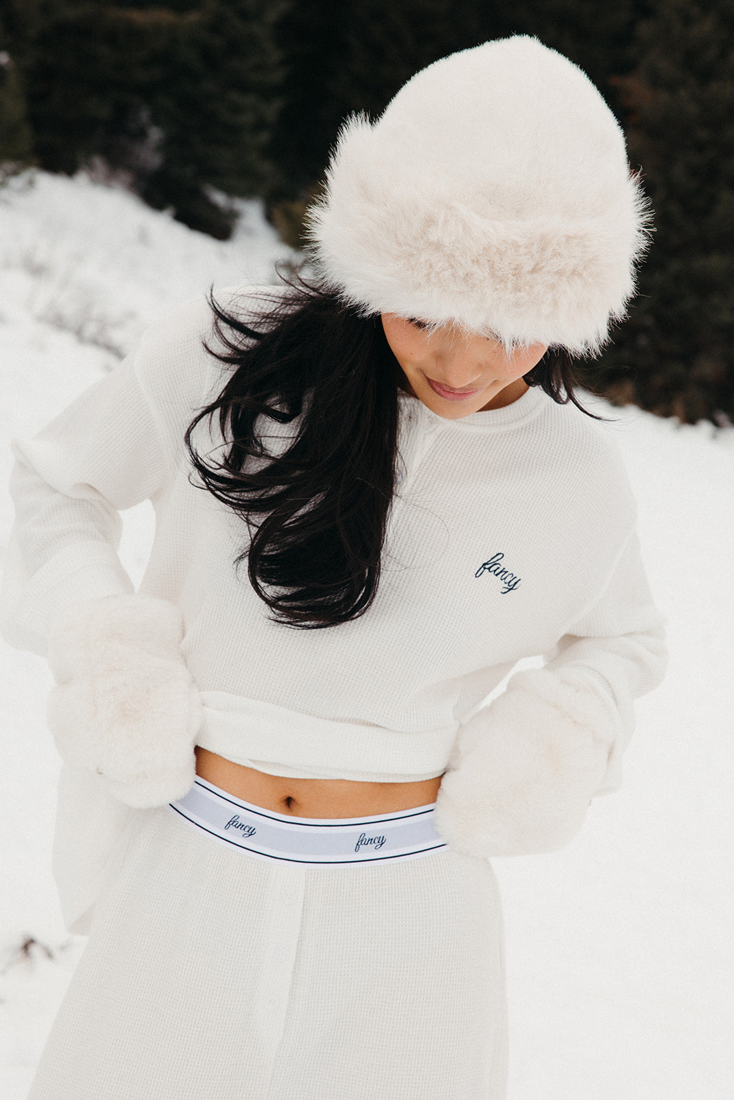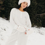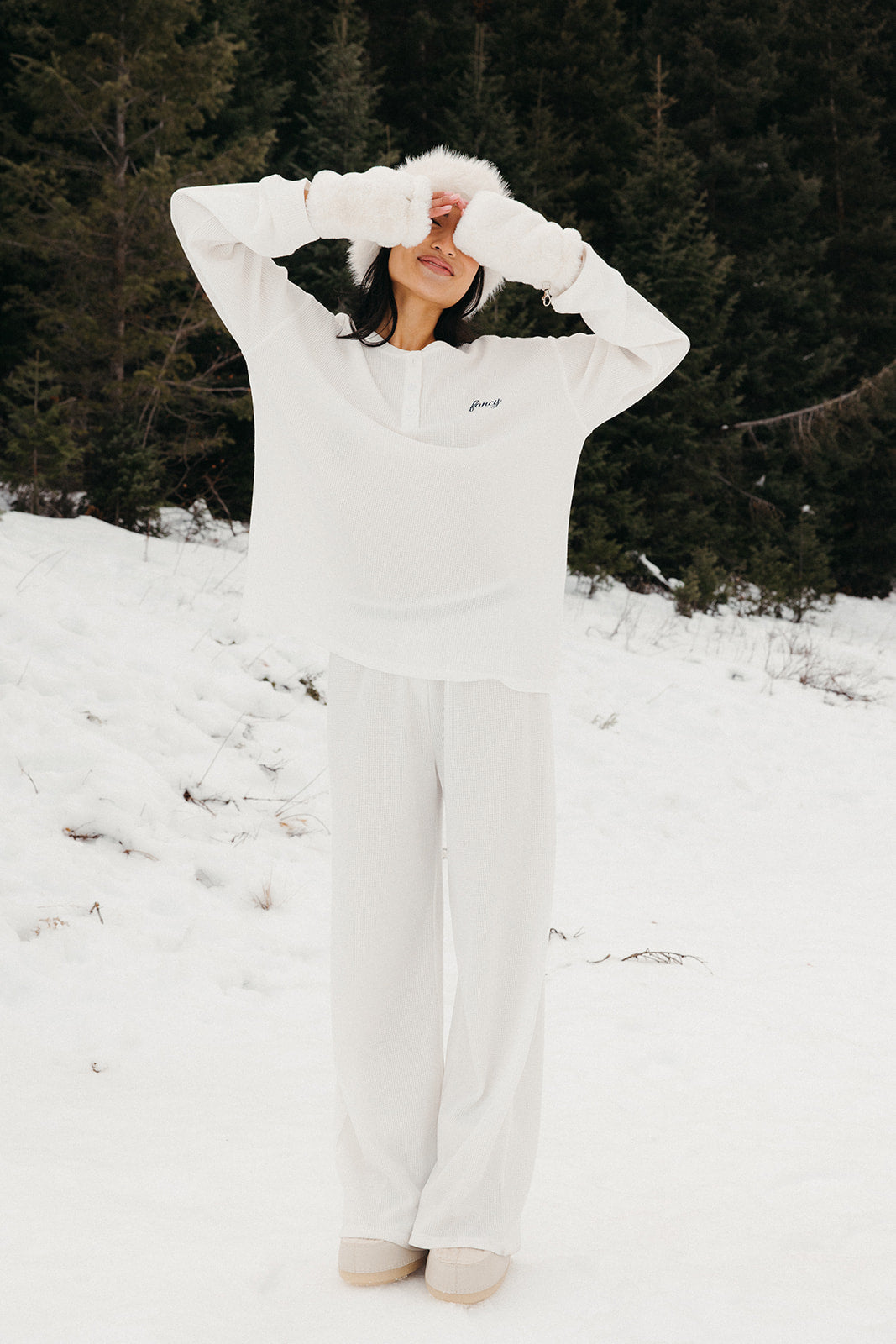 Meet your go-to comfort long sleeve for every season. These lightweight waffle-knit pants deliver a relaxed fit and soft feel, finished with a bold elastic waistband featuring “FANCY” woven throughout for a fun, elevated touch. From cozy days at home to casual outings, they’re made to move with you—especially when paired with the matching pants. In classic white, this waffle set is perfect for winter and effortlessly carries you into spring and summer.