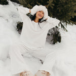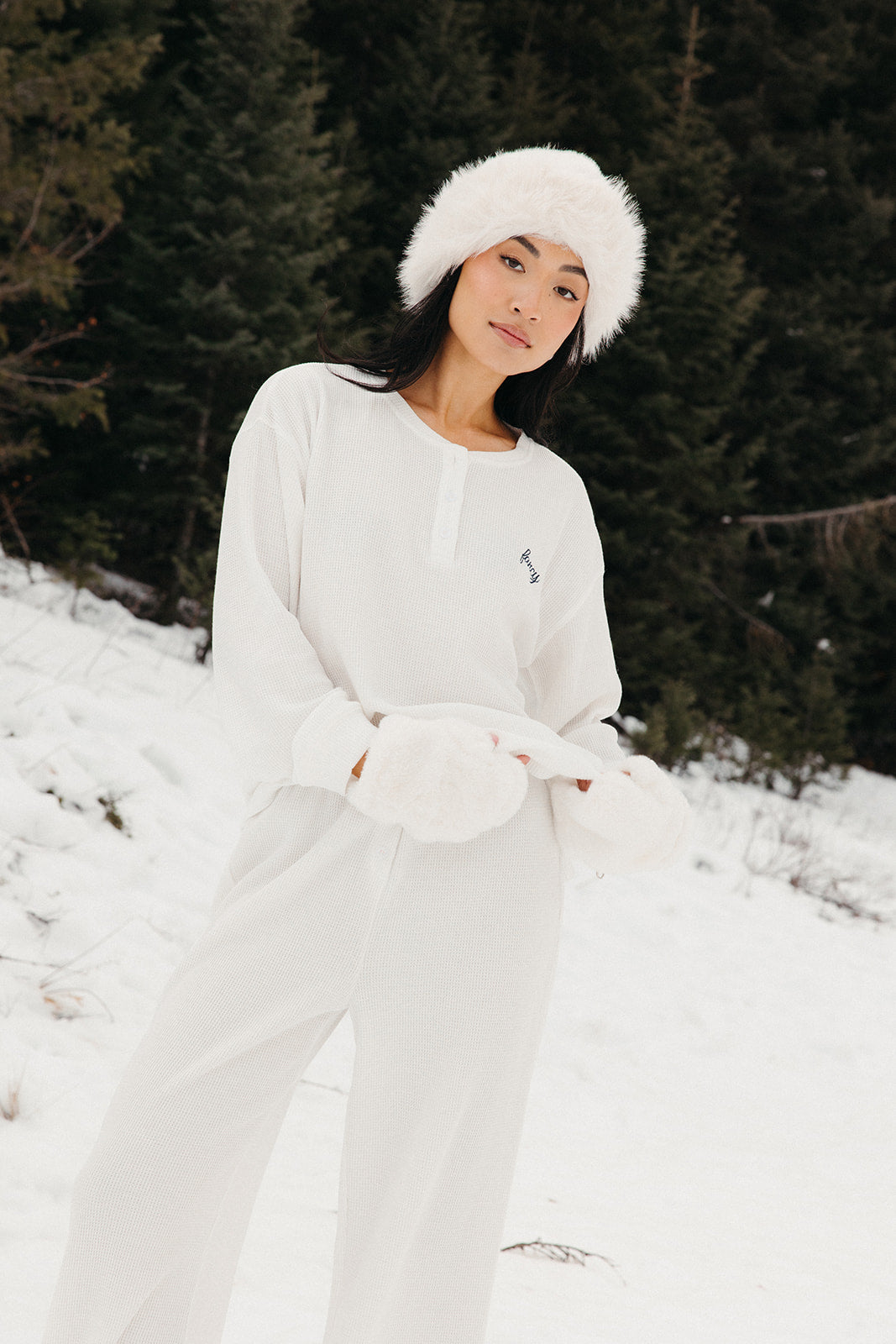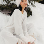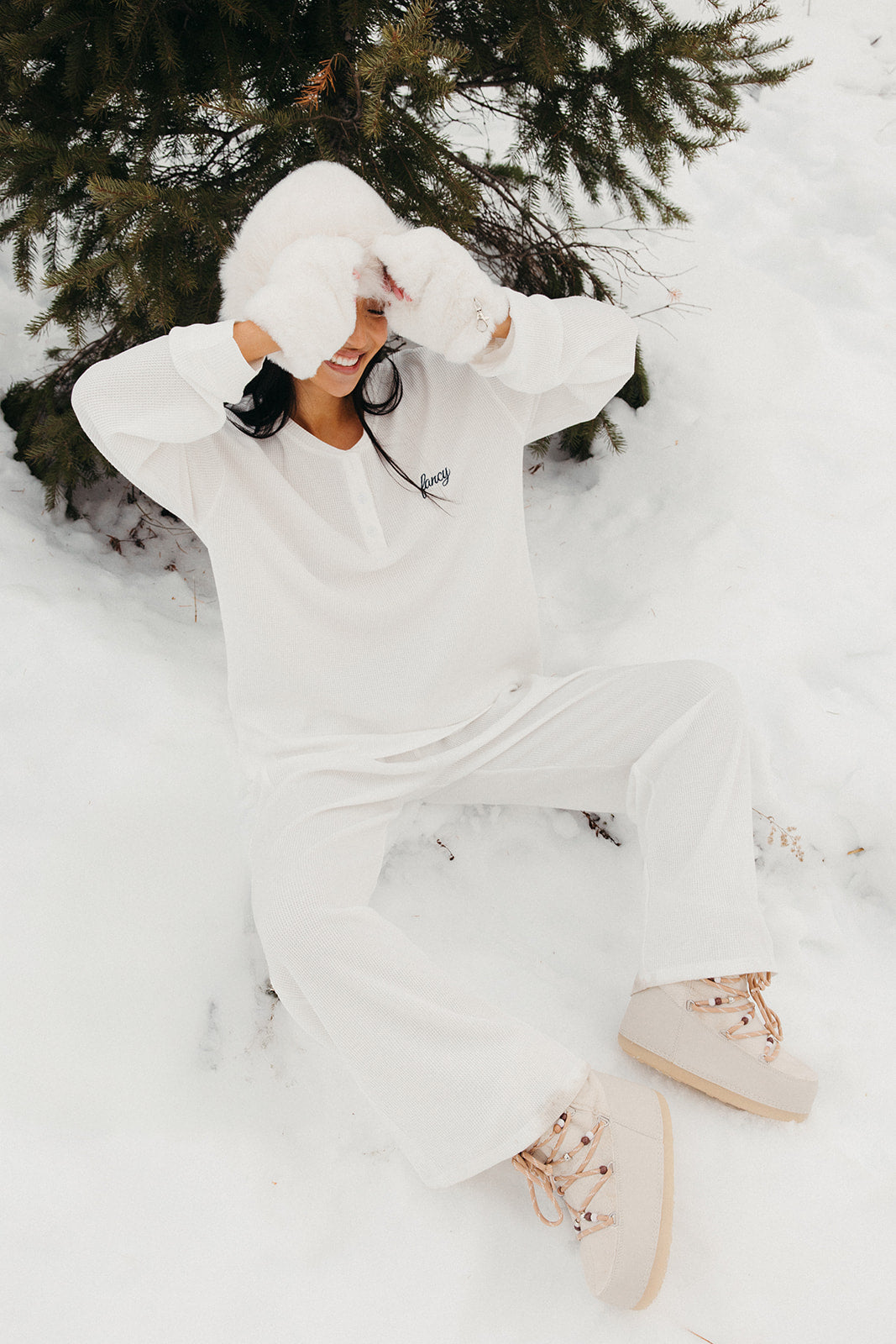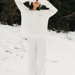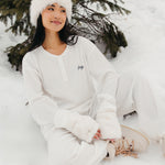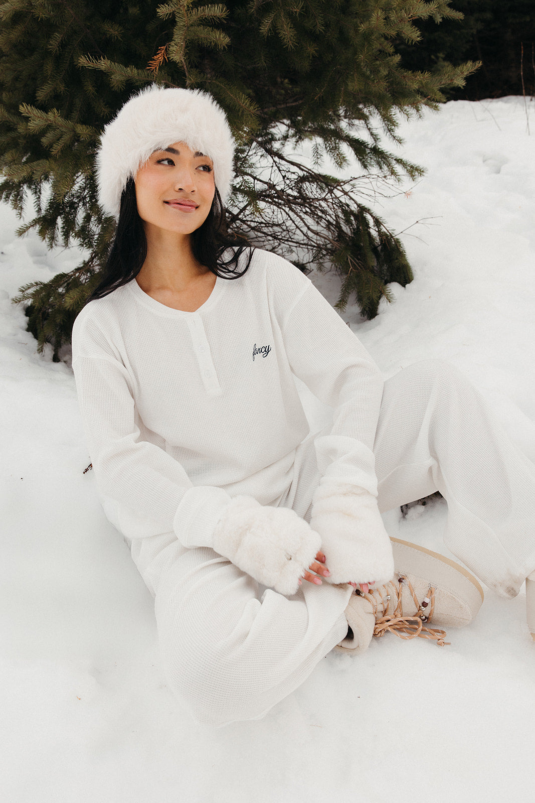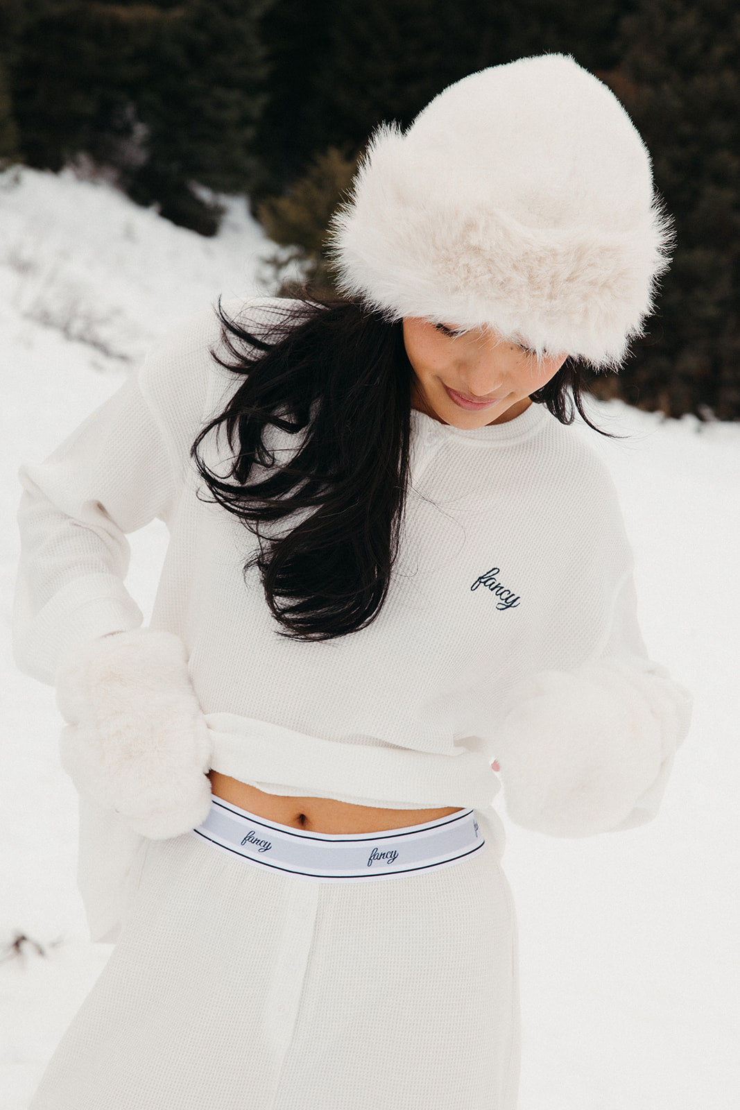 Meet your go-to comfort long sleeve for every season. These lightweight waffle-knit pants deliver a relaxed fit and soft feel, finished with a bold elastic waistband featuring “FANCY” woven throughout for a fun, elevated touch. From cozy days at home to casual outings, they’re made to move with you—especially when paired with the matching pants. In classic white, this waffle set is perfect for winter and effortlessly carries you into spring and summer.