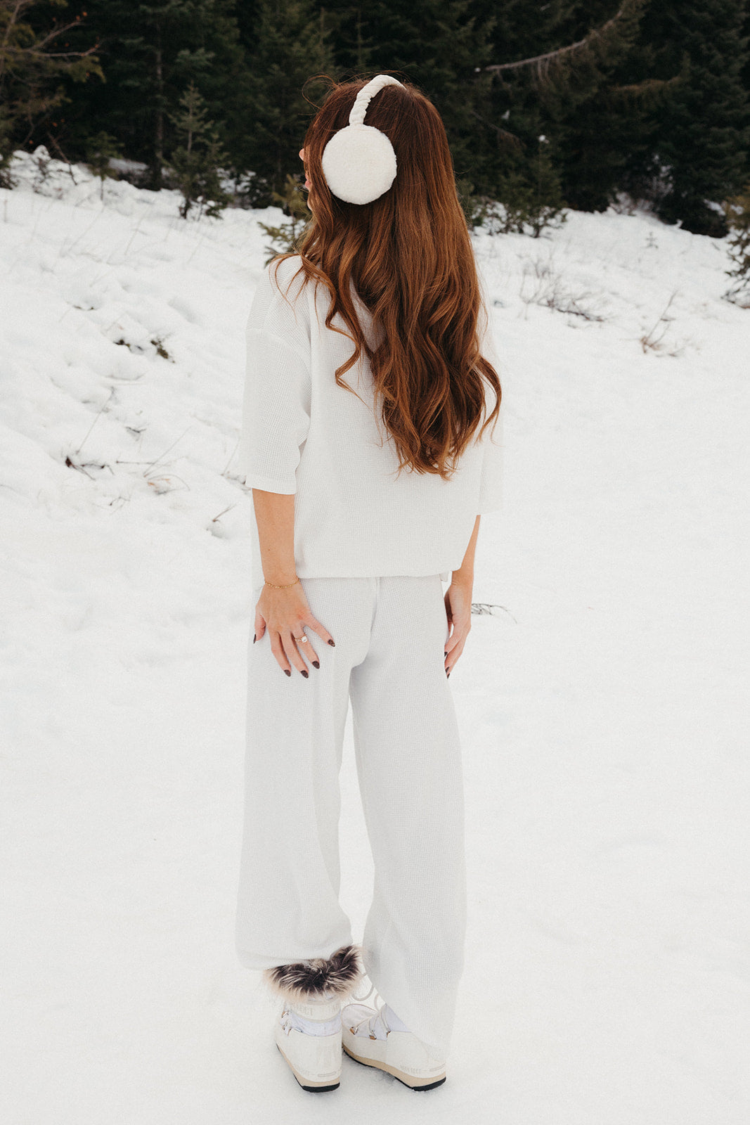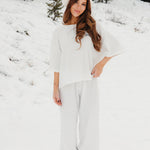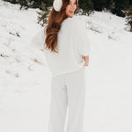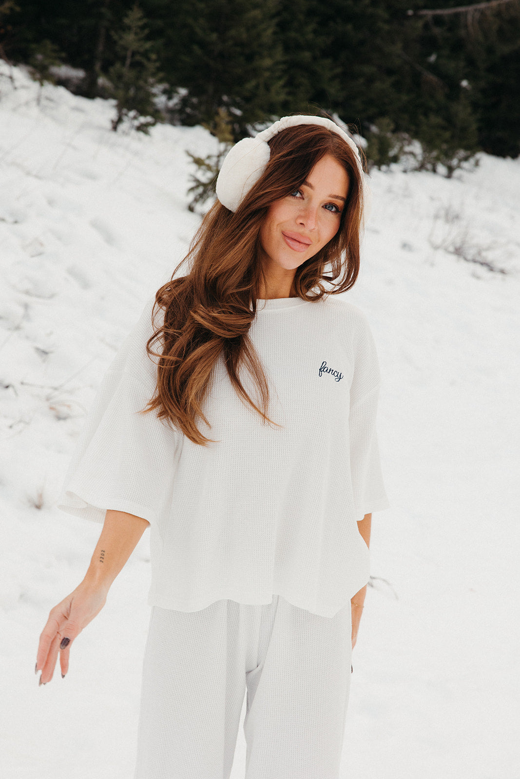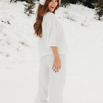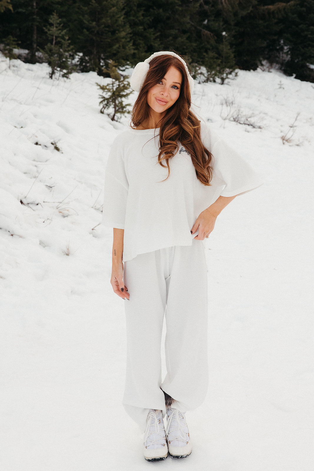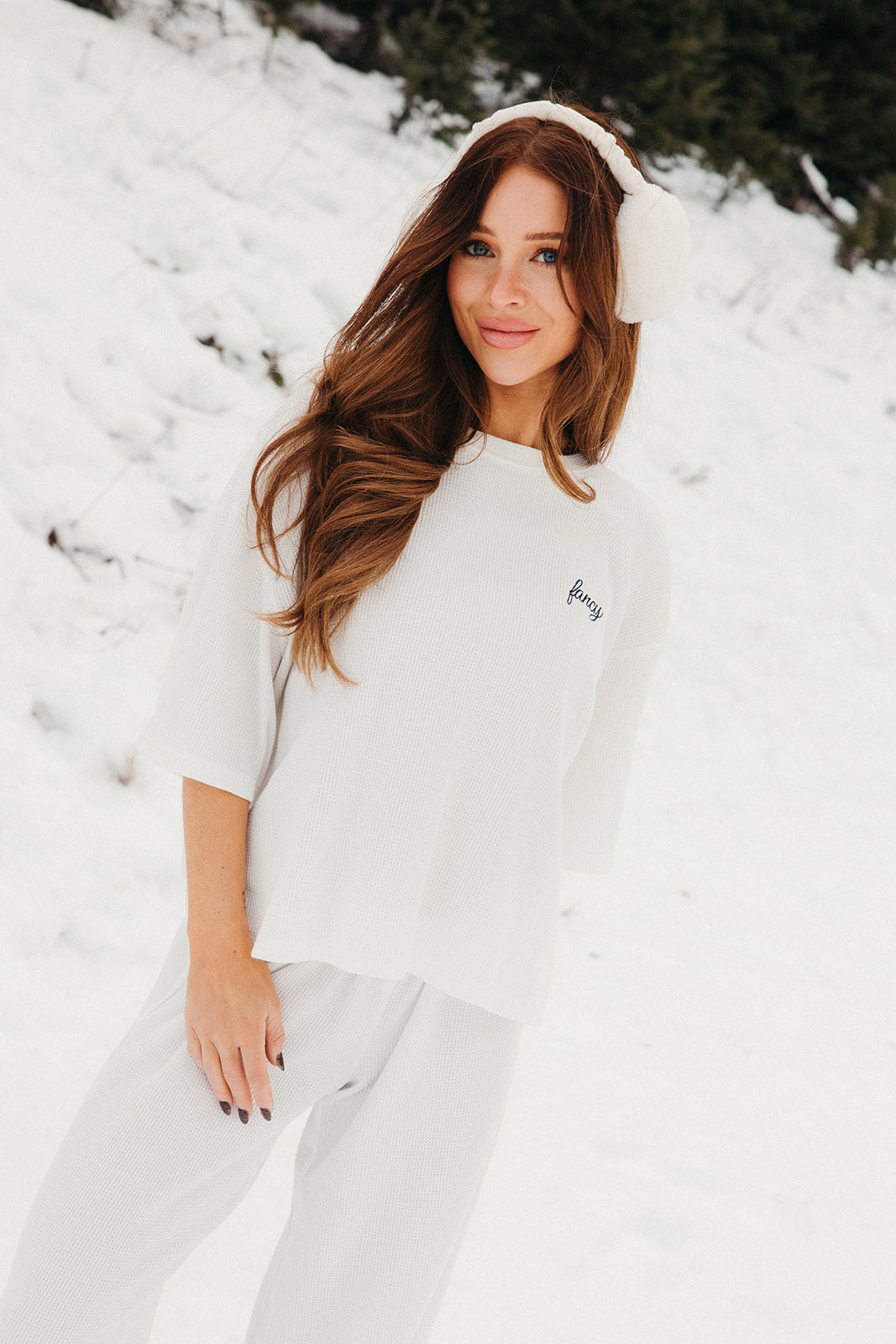 Meet your go-to comfort long sleeve for every season. These lightweight waffle-knit pants deliver a relaxed fit and soft feel, finished with a bold elastic waistband featuring “FANCY” woven throughout for a fun, elevated touch. From cozy days at home to casual outings, they’re made to move with you—especially when paired with the matching pants. In classic white, this waffle set is perfect for winter and effortlessly carries you into spring and summer.