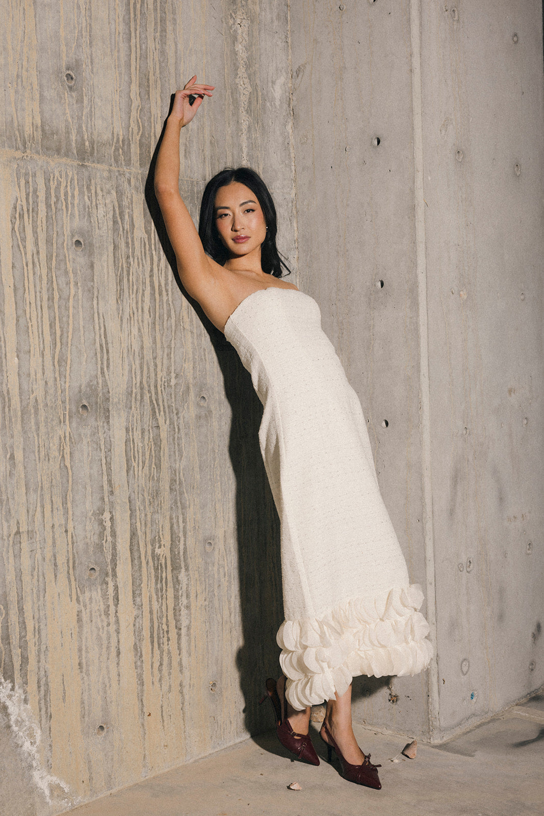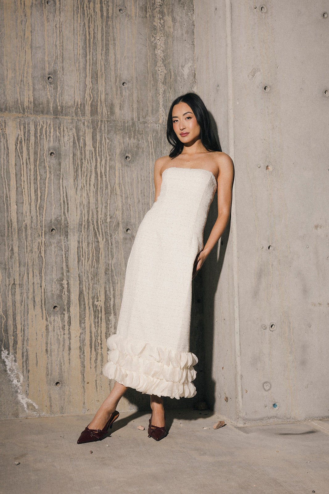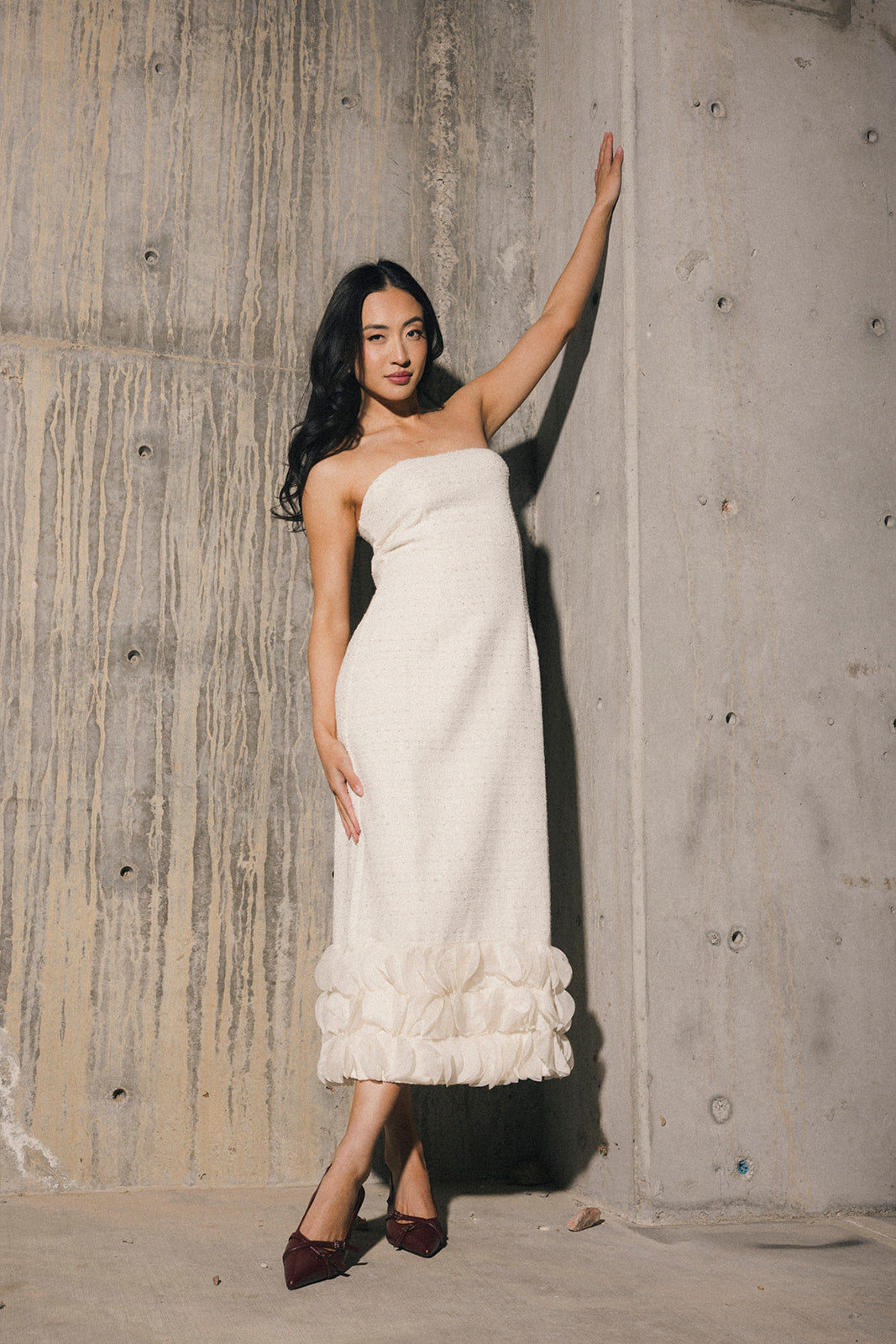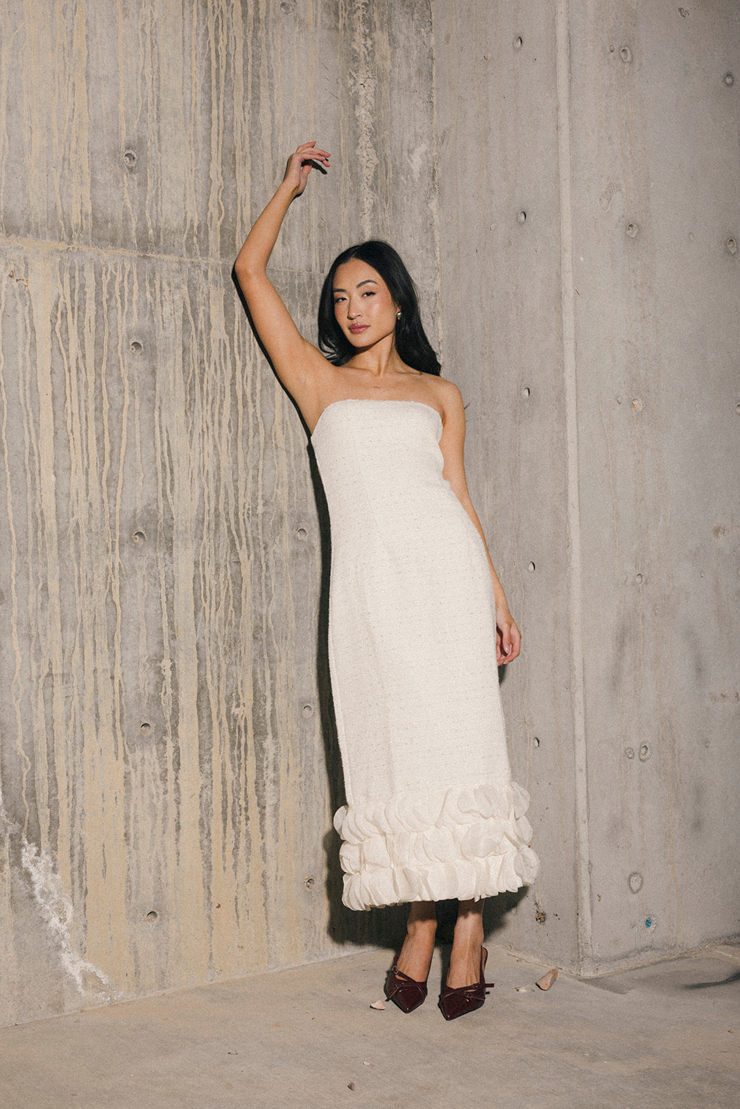 Effortlessly elevate your look with the Kyla Tweed Strapless Dress. The 3D floral texture adds a touch of elegance, while the maxi length and back split hem provide a flattering silhouette. The tweed material ensures both comfort and style, making this the perfect dress for any occasion.
