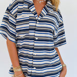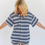 Experience comfort and style with the Lana Striped French Terry Set in blue. This cozy set features a multi-color striped fabric that adds a playful touch to your casual wardrobe. The collared button-down top offers an oversized fit for relaxed ease, perfectly paired with matching shorts for effortless lounging or casual outings. Designed to keep you comfortable while looking chic, this set is a versatile addition to your everyday collection.