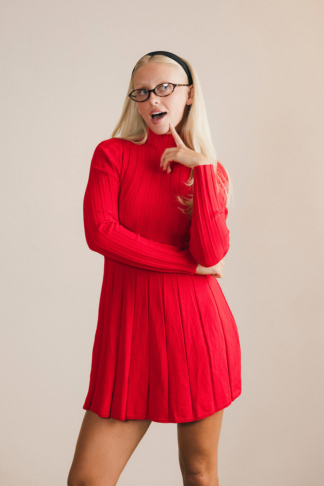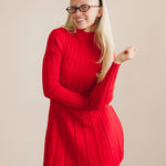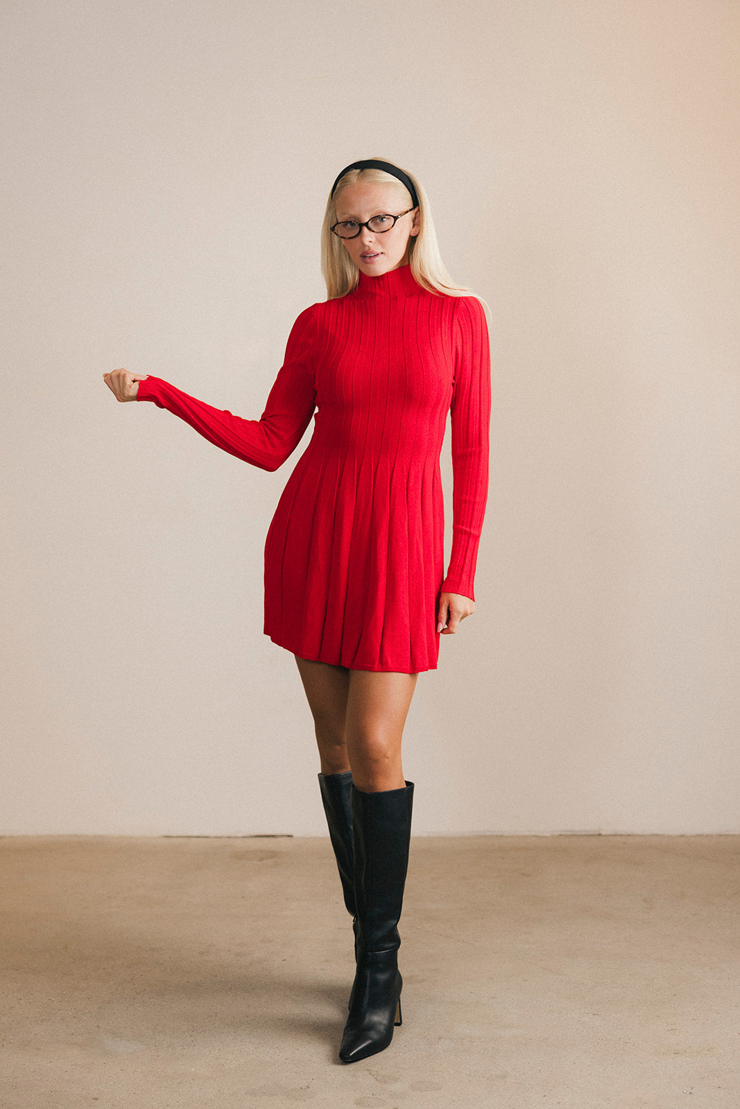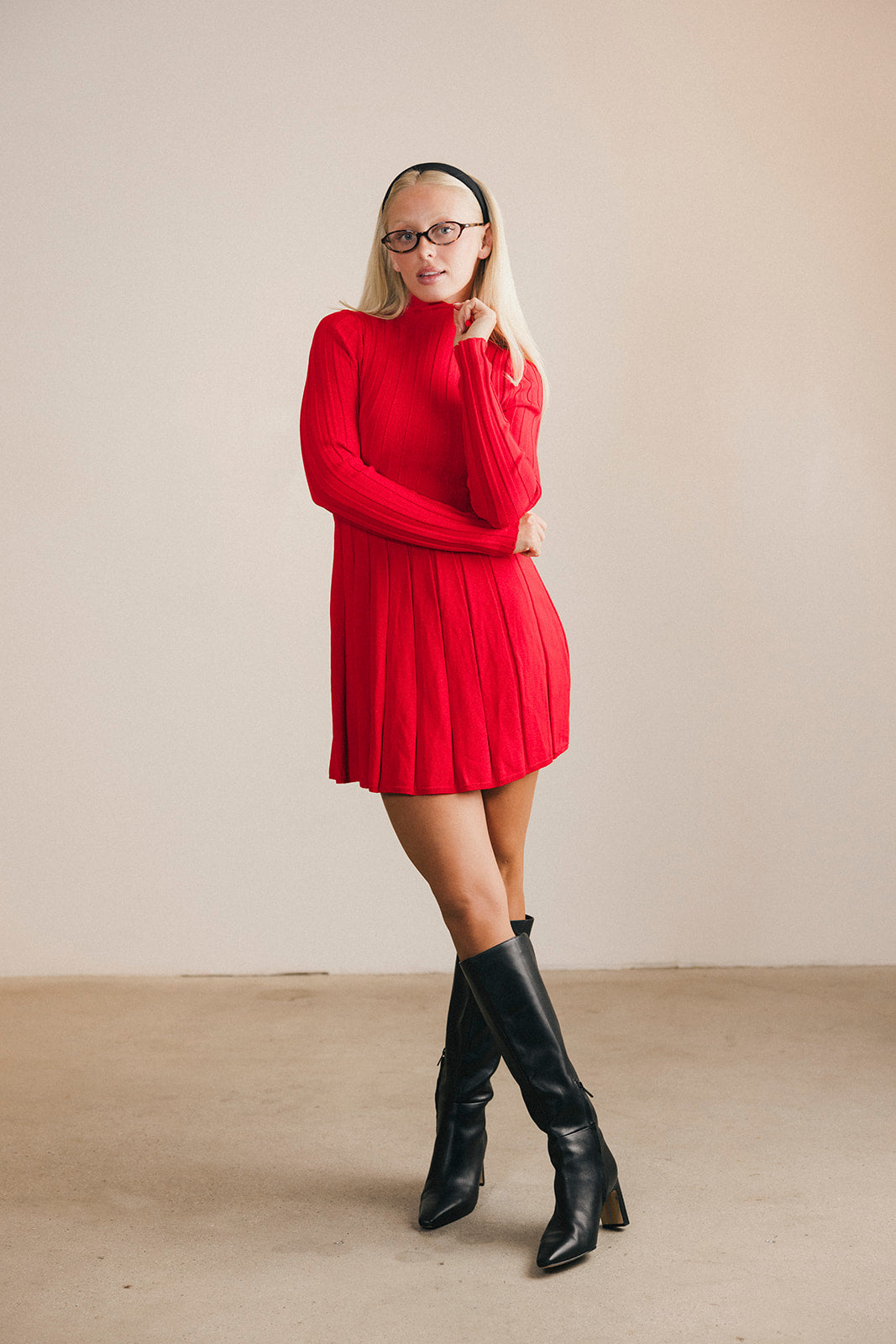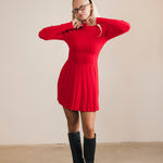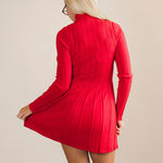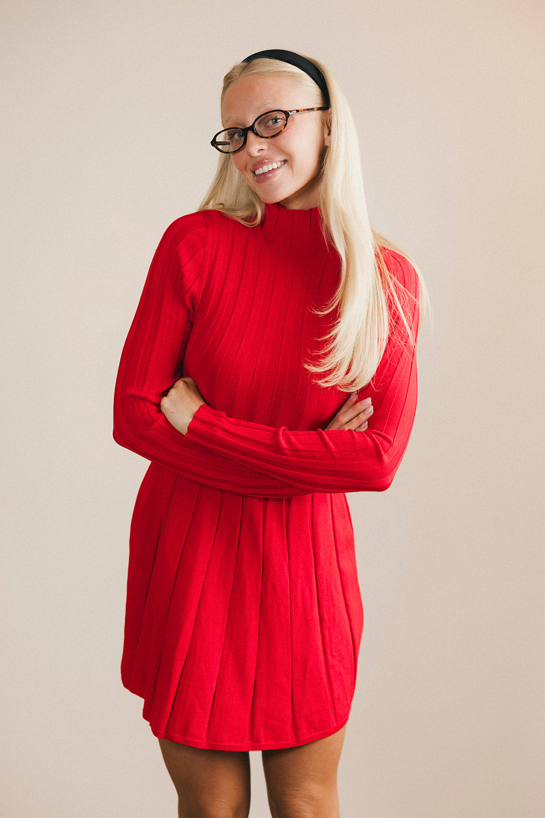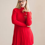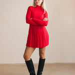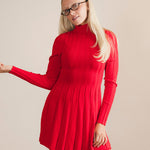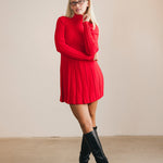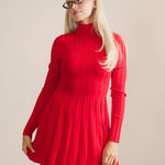 Elevate your everyday wardrobe with this sophisticated long sleeve sweater dress. The graceful pleated detailing adds dimension and movement, while the mock neck provides a polished, refined silhouette perfect for both office settings and casual outings. Crafted for comfort and style, this versatile piece transitions seamlessly from season to season, making it an essential addition to any closet. Layer it with tights and boots for a chic fall look, or pair with sneakers for effortless weekend elegance.