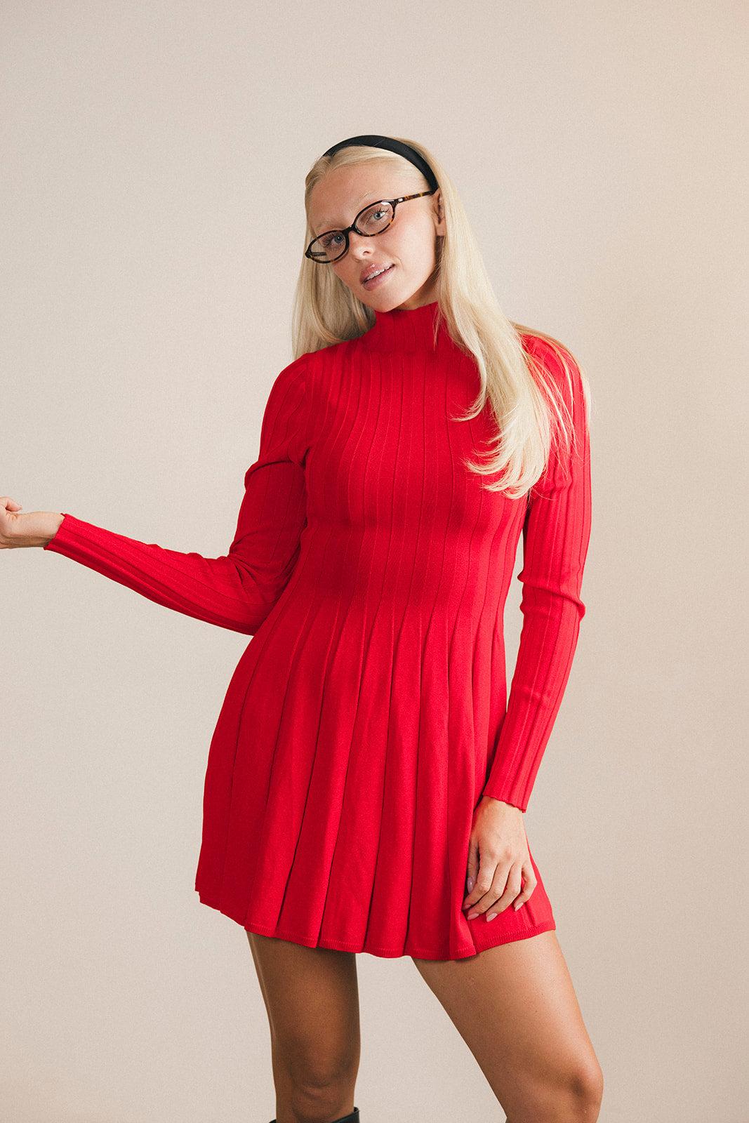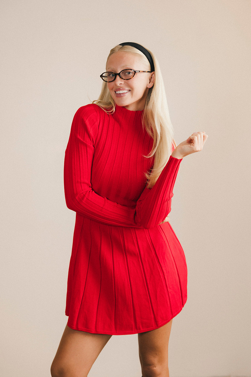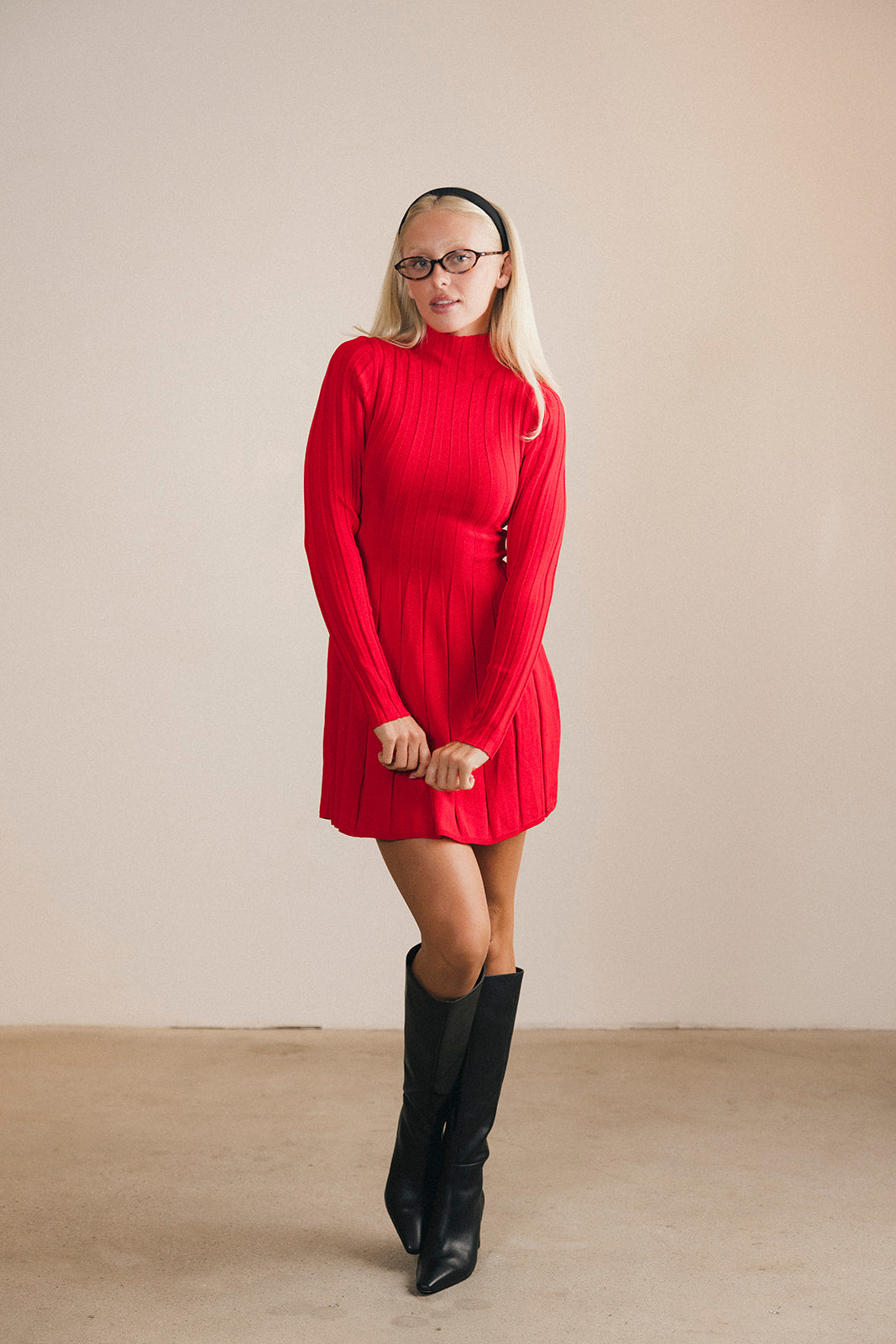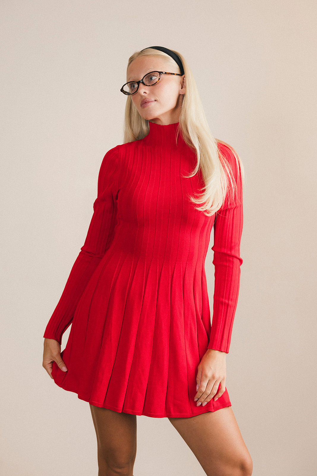 Elevate your everyday wardrobe with this sophisticated long sleeve sweater dress. The graceful pleated detailing adds dimension and movement, while the mock neck provides a polished, refined silhouette perfect for both office settings and casual outings. Crafted for comfort and style, this versatile piece transitions seamlessly from season to season, making it an essential addition to any closet. Layer it with tights and boots for a chic fall look, or pair with sneakers for effortless weekend elegance.